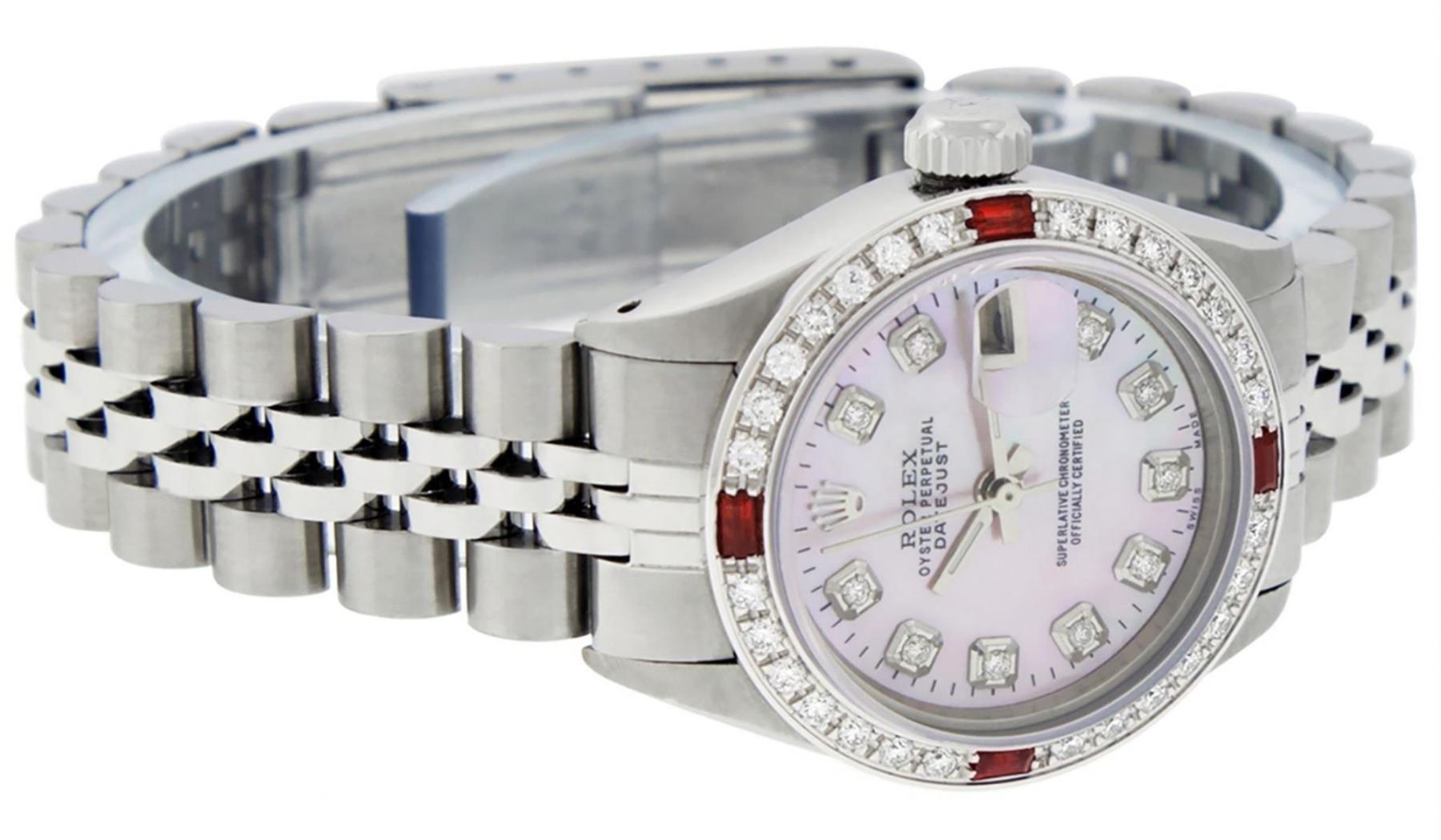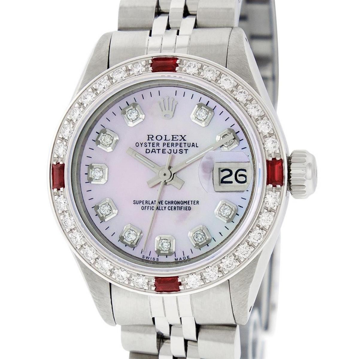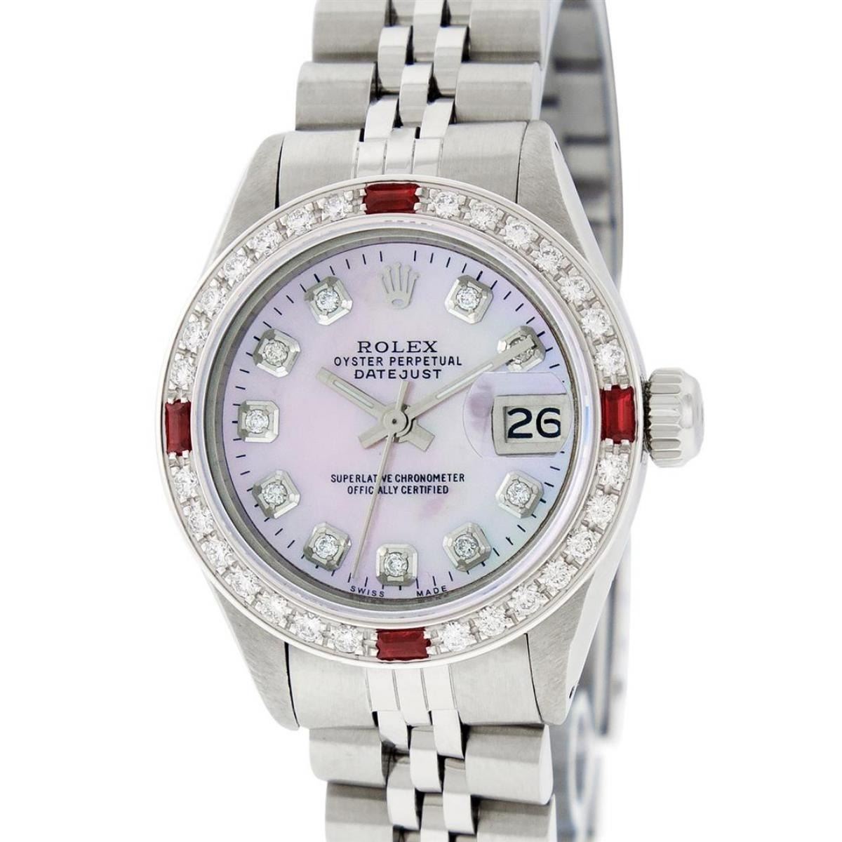 One Ladies Stainless Steel Rolex Oyster Perpetual Datejust Polished Bright with Satin Finish, Serviced & Electronically Tested, Stainless Steel Case: 26mm, Stainless Steel Crown, Custom Bezel: New 18K White Gold Ruby Beadset Diamond Bezel, Diamond + Gem Count: 28 Diamonds + 4 Rubies Total Weight .70 Carat, Clarity: SI-VS, Color: G to H. Custom Crystal: New Scratch Resistant Synthetic Sapphire Cyclops Lens. Custom Hands: New Luminescent Hands. Movement: Automatic Winding Movement. Custom Dial: Refinished Pink Mother Of Pearl With Diamond Hour Markers, 10 Diamond in Dial G To H In Color, Clarity: SI-VS. Date Window: 3 O'Clock Position Date Display, Model: Datejust. Condition: G-6 Extra Fine. Bracelet: Stainless Steel Jubilee Band. Bright Polish & Satin Finish. 6.0 Inch Length, Adjustable. Standard Clasp, With Rolex Logo. This Watch Has Been Serviced Time Tested And Is In Excellent Condition It Is Free Of All Scratches And Dents.