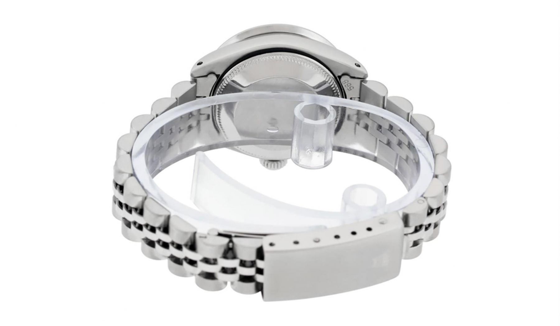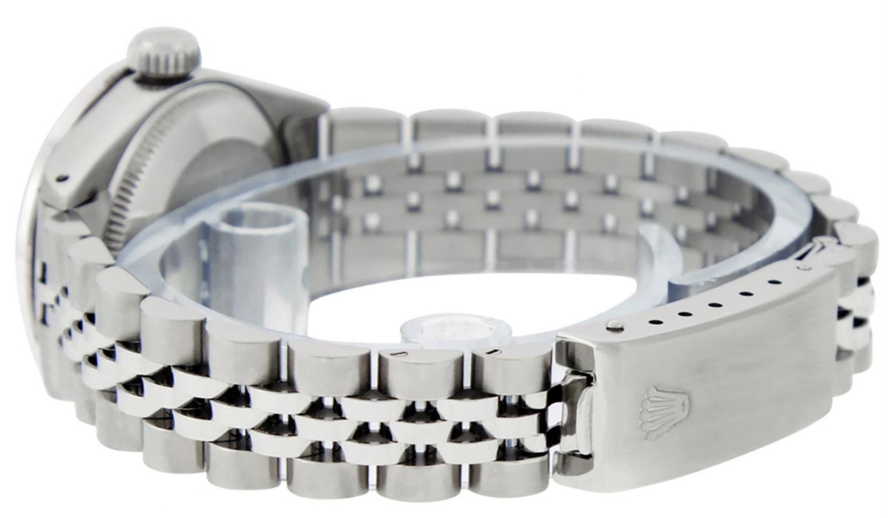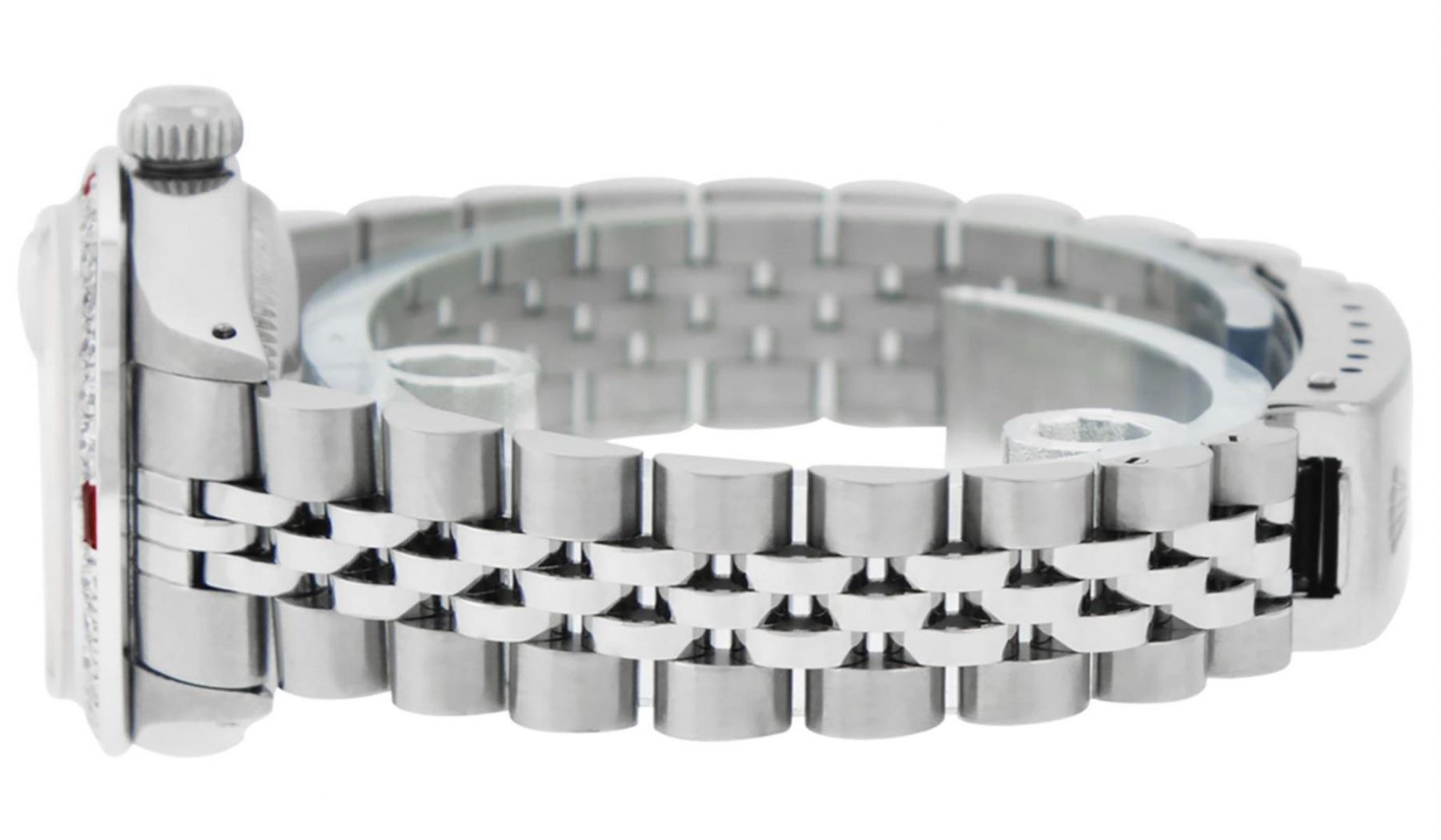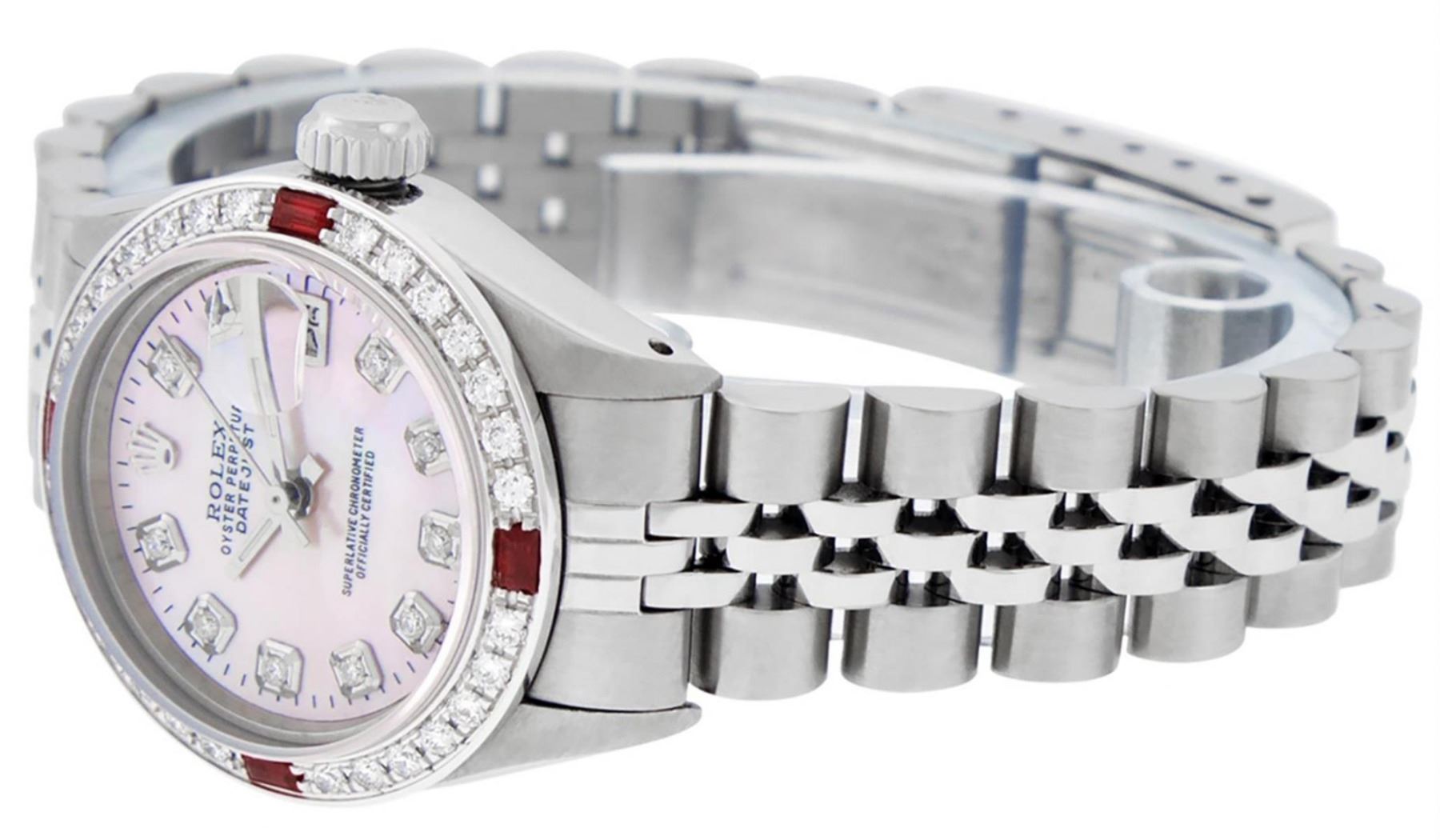 One Ladies Stainless Steel Rolex Oyster Perpetual Datejust Polished Bright with Satin Finish, Serviced & Electronically Tested, Stainless Steel Case: 26mm, Stainless Steel Crown, Custom Bezel: New 18K White Gold Ruby Beadset Diamond Bezel, Diamond + Gem Count: 28 Diamonds + 4 Rubies Total Weight .70 Carat, Clarity: SI-VS, Color: G to H. Custom Crystal: New Scratch Resistant Synthetic Sapphire Cyclops Lens. Custom Hands: New Luminescent Hands. Movement: Automatic Winding Movement. Custom Dial: Refinished Pink Mother Of Pearl With Diamond Hour Markers, 10 Diamond in Dial G To H In Color, Clarity: SI-VS. Date Window: 3 O'Clock Position Date Display, Model: Datejust. Condition: G-6 Extra Fine. Bracelet: Stainless Steel Jubilee Band. Bright Polish & Satin Finish. 6.0 Inch Length, Adjustable. Standard Clasp, With Rolex Logo. This Watch Has Been Serviced Time Tested And Is In Excellent Condition It Is Free Of All Scratches And Dents.