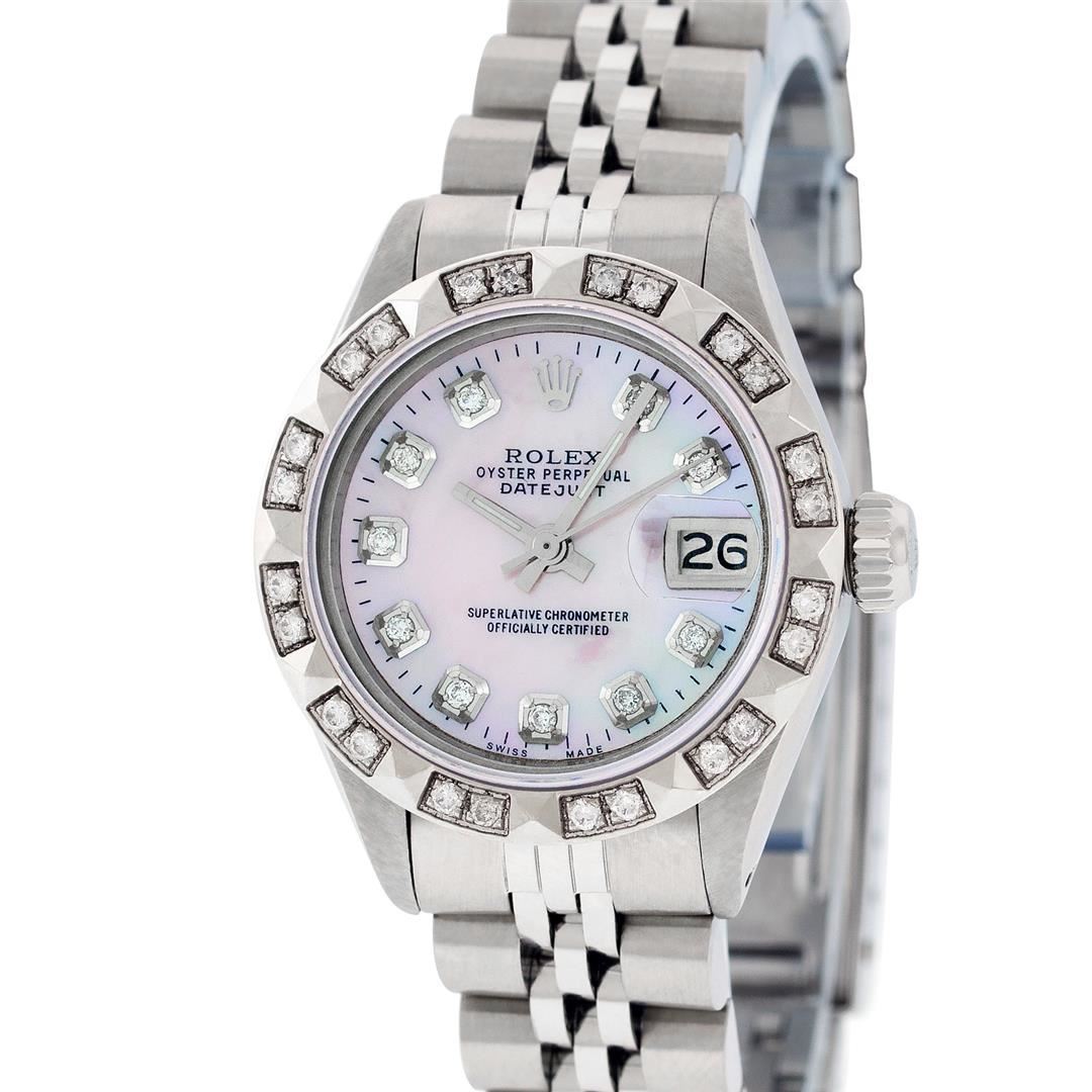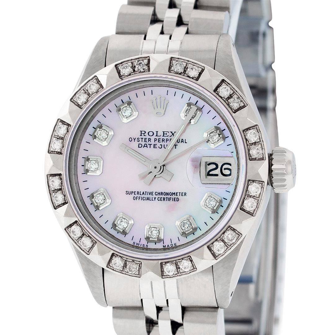 One Ladies Stainless Steel Rolex Datejust Polished Bright with Satin Finish, Serviced & Electronically Tested, Stainless Steel Case: 26mm, Stainless Steel Crown, Custom Bezel: New 18K White Gold Pyramid Diamond Bezel, Diamond Count: 24 Diamonds In Dial. Total Weight .50 Carat, Clarity: SI-VS, Color: G to H. Custom Crystal: New Scratch Resistant Synthetic Sapphire Cyclops Lens. Custom Hands: New Luminescent Hands. Movement: Automatic Winding Movement. Custom Dial: Light Pink Mother Of Pearl Diamond Dial. Diamond Count: 10 Diamonds In Dial. Clarity: SI-VS, Color: G to H. Date Window: 3 O'Clock Position Date Display, Model: Datejust. Condition: G-6 Extra Fine. Bracelet: Stainless Steel Jubilee Band With Rolex Crown On Buckle. Bright Polish & Satin Finish. Band Length: 6.0 Inch Length, Adjustable. Standard Clasp, With Rolex Logo. This Watch Has Been Serviced Time Tested And Is In Excellent Condition It Is Free Of All Scratches And Dents.