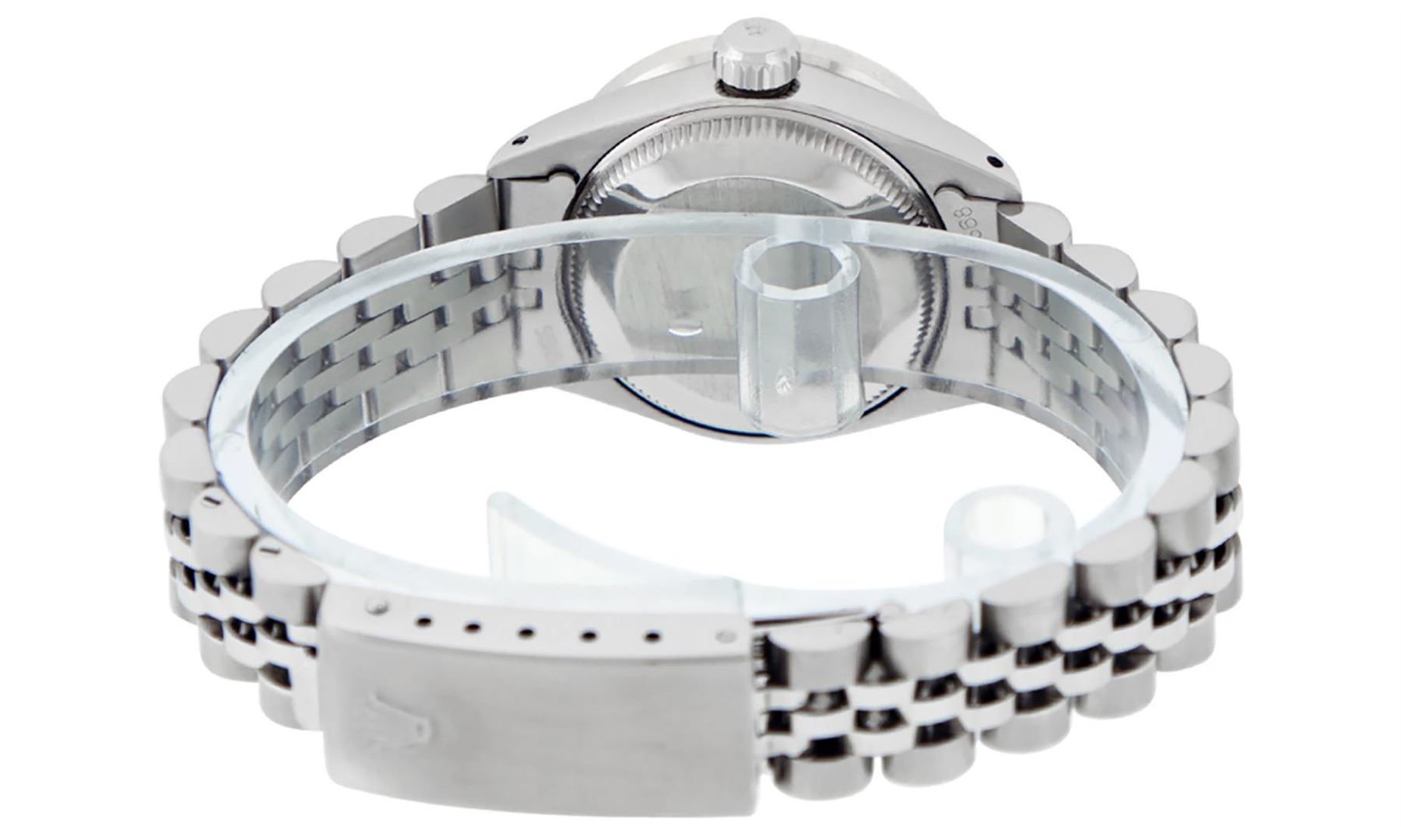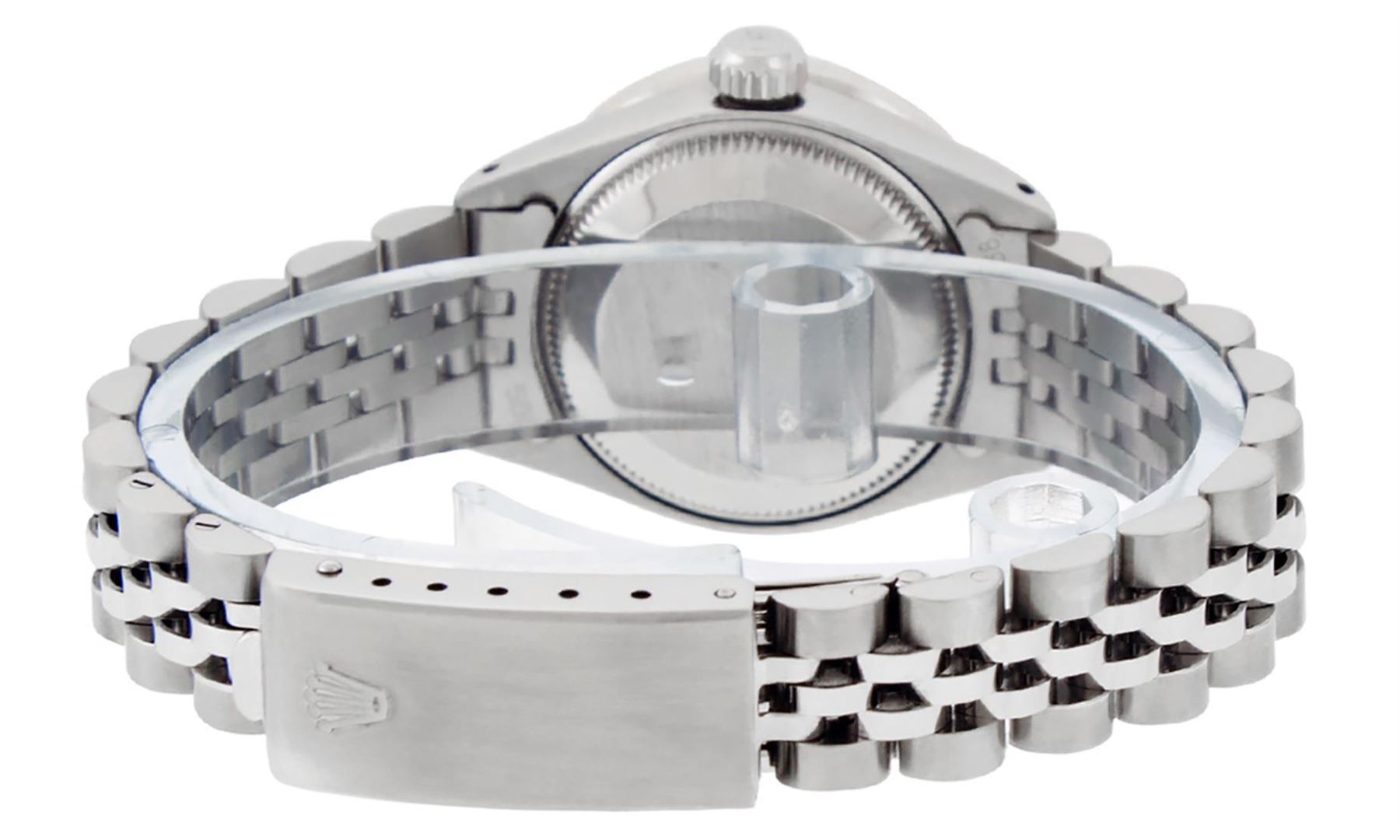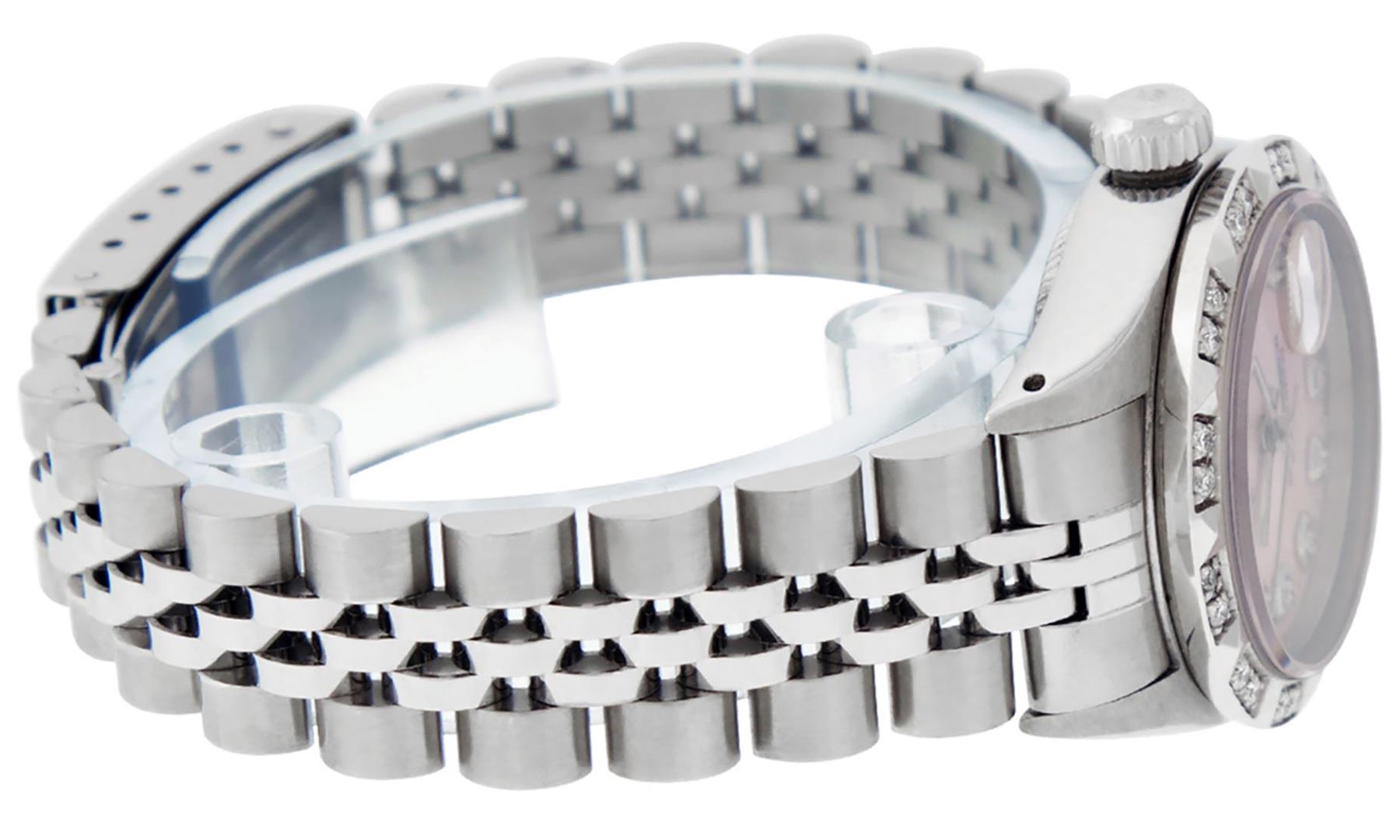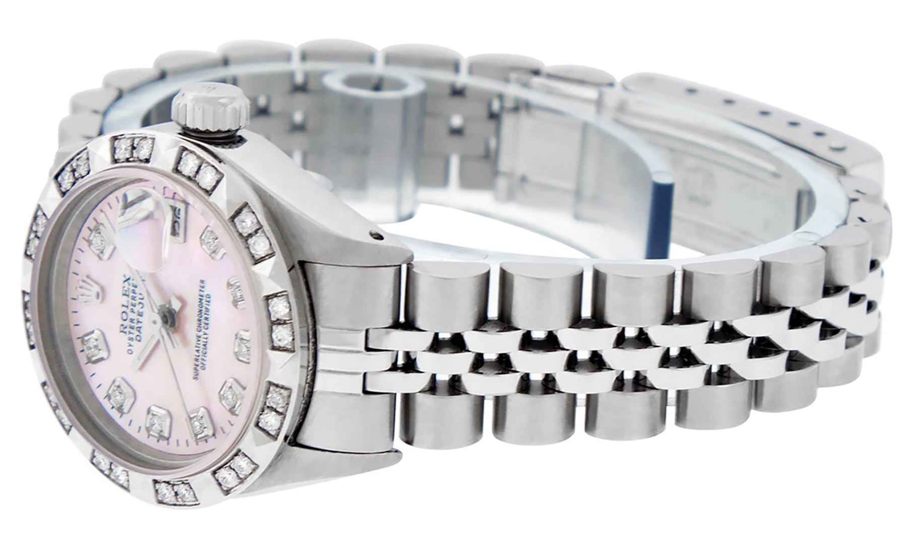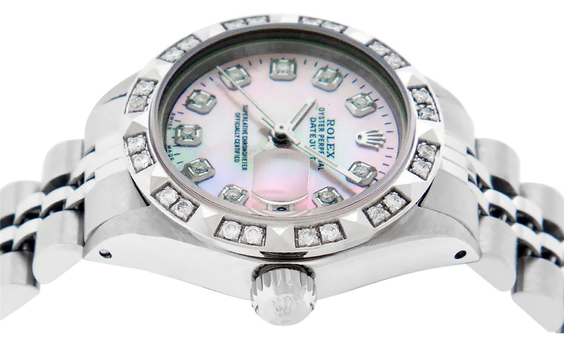One Ladies Stainless Steel Rolex Datejust Polished Bright with Satin Finish, Serviced & Electronically Tested, Stainless Steel Case: 26mm, Stainless Steel Crown, Custom Bezel: New 18K White Gold Pyramid Diamond Bezel, Diamond Count: 24 Diamonds In Dial. Total Weight .50 Carat, Clarity: SI-VS, Color: G to H. Custom Crystal: New Scratch Resistant Synthetic Sapphire Cyclops Lens. Custom Hands: New Luminescent Hands. Movement: Automatic Winding Movement. Custom Dial: Light Pink Mother Of Pearl Diamond Dial. Diamond Count: 10 Diamonds In Dial. Clarity: SI-VS, Color: G to H. Date Window: 3 O'Clock Position Date Display, Model: Datejust. Condition: G-6 Extra Fine. Bracelet: Stainless Steel Jubilee Band With Rolex Crown On Buckle. Bright Polish & Satin Finish. Band Length: 6.0 Inch Length, Adjustable. Standard Clasp, With Rolex Logo. This Watch Has Been Serviced Time Tested And Is In Excellent Condition It Is Free Of All Scratches And Dents.