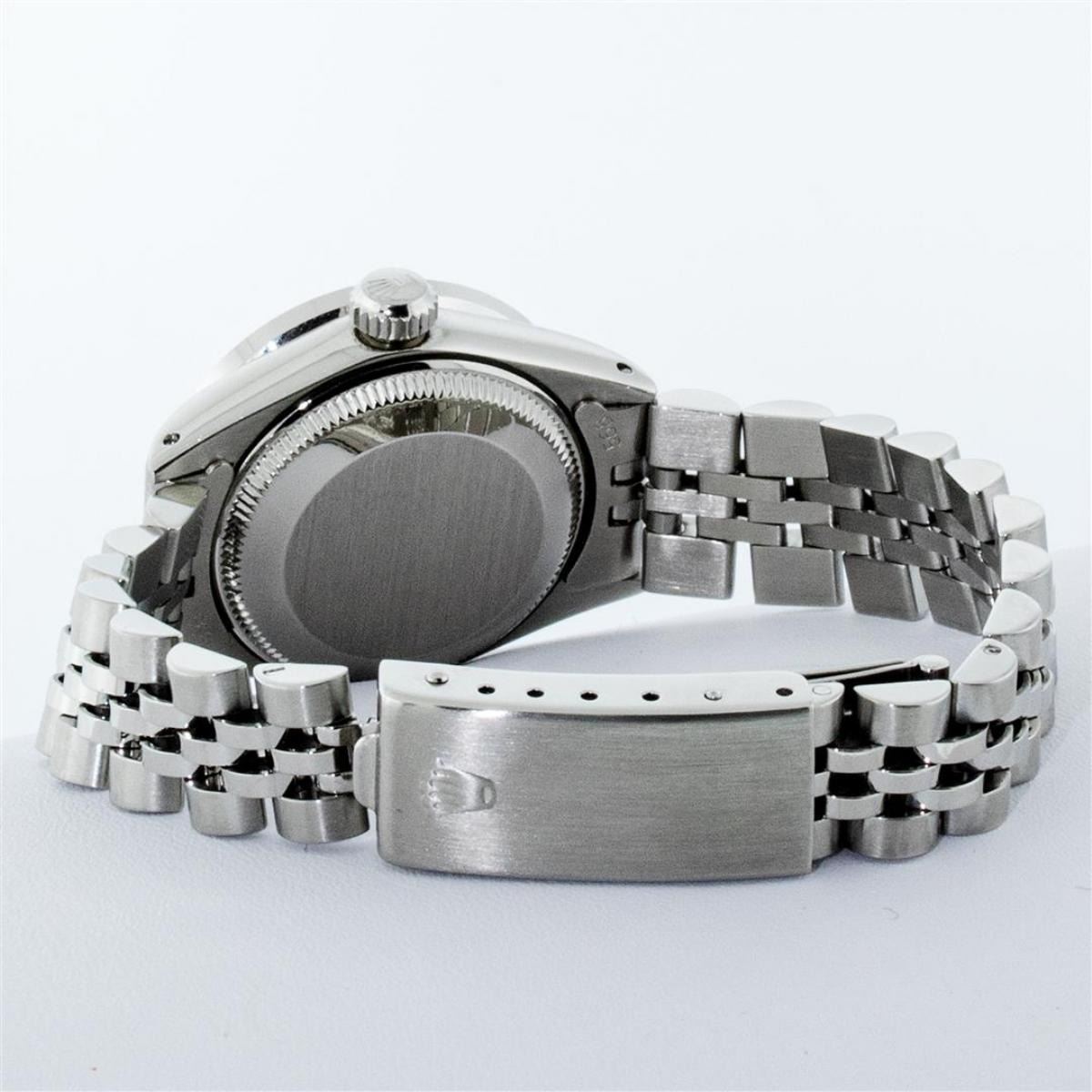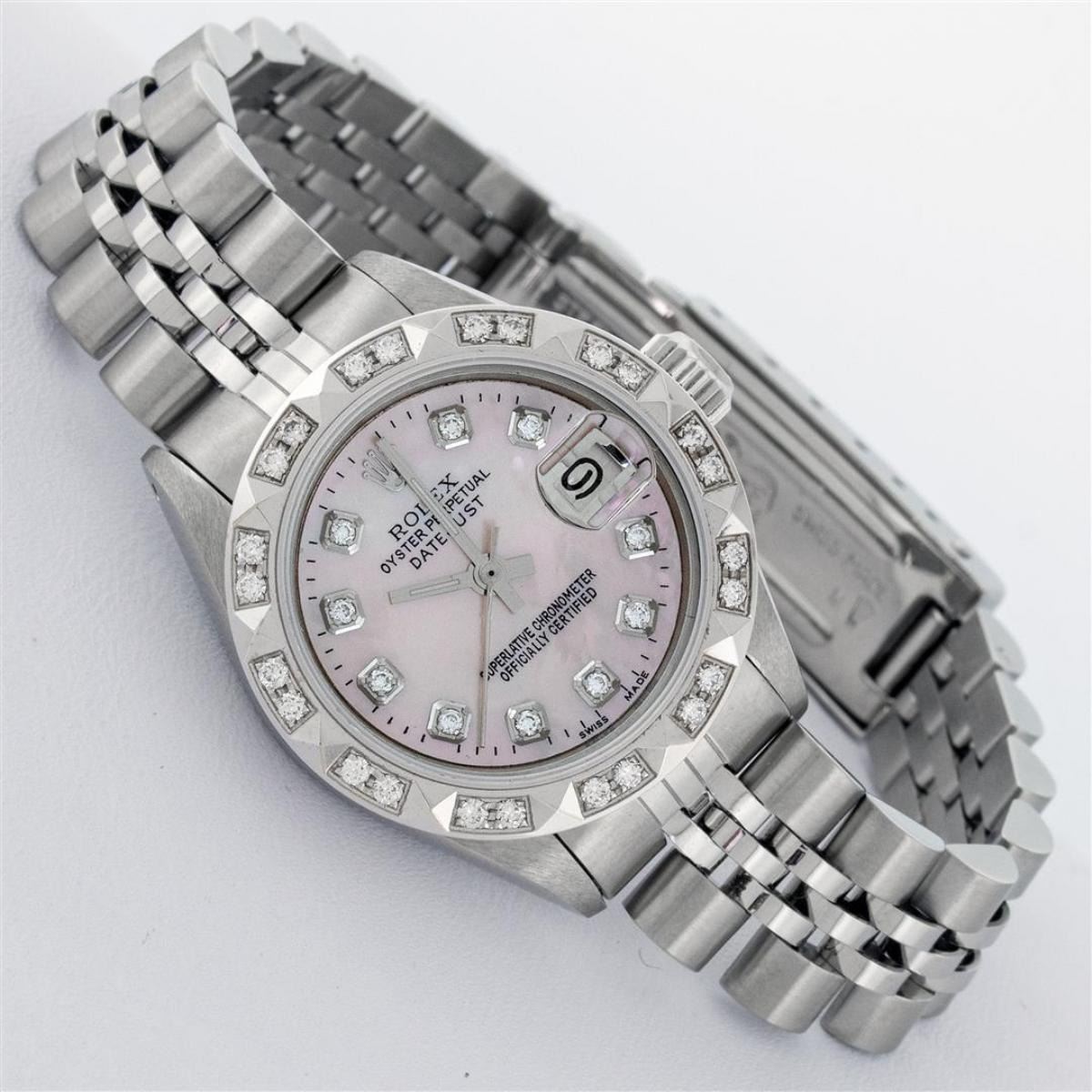 One Ladies Stainless Steel Rolex Datejust Polished Bright with Satin Finish, Serviced & Electronically Tested, Stainless Steel Case: 26mm, Stainless Steel Crown, Custom Bezel: New 18K White Gold Pyramid Diamond Bezel, Diamond Count: 24 Diamonds In Dial. Total Weight .50 Carat, Clarity: SI-VS, Color: G to H. Custom Crystal: New Scratch Resistant Synthetic Sapphire Cyclops Lens. Custom Hands: New Luminescent Hands. Movement: Automatic Winding Movement. Custom Dial: Light Pink Mother Of Pearl Diamond Dial. Diamond Count: 10 Diamonds In Dial. Clarity: SI-VS, Color: G to H. Date Window: 3 O'Clock Position Date Display, Model: Datejust. Condition: G-6 Extra Fine. Bracelet: Stainless Steel Jubilee Band With Rolex Crown On Buckle. Bright Polish & Satin Finish. Band Length: 6.0 Inch Length, Adjustable. Standard Clasp, With Rolex Logo. This Watch Has Been Serviced Time Tested And Is In Excellent Condition It Is Free Of All Scratches And Dents.