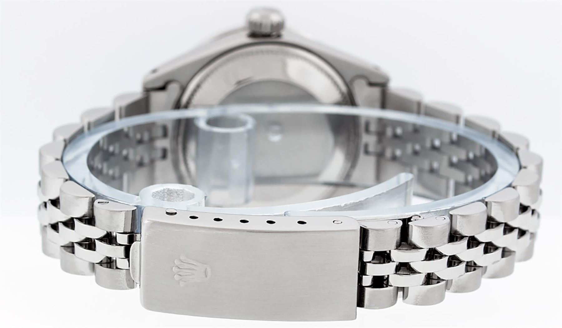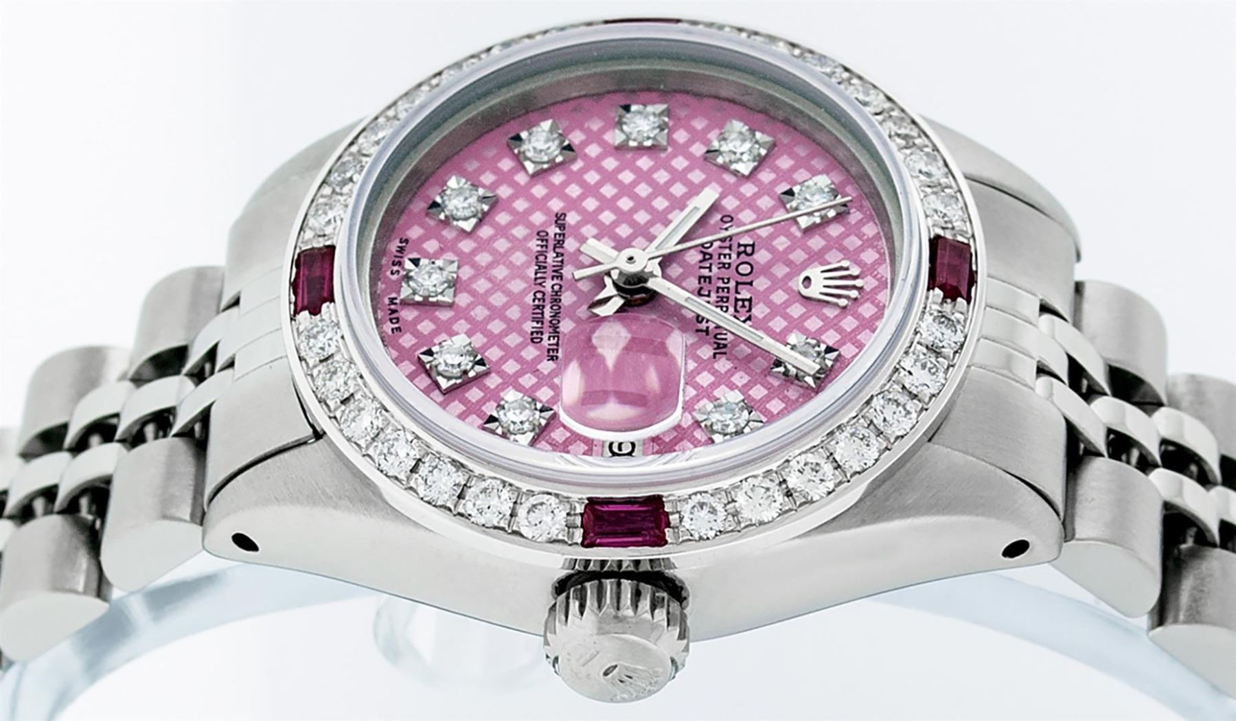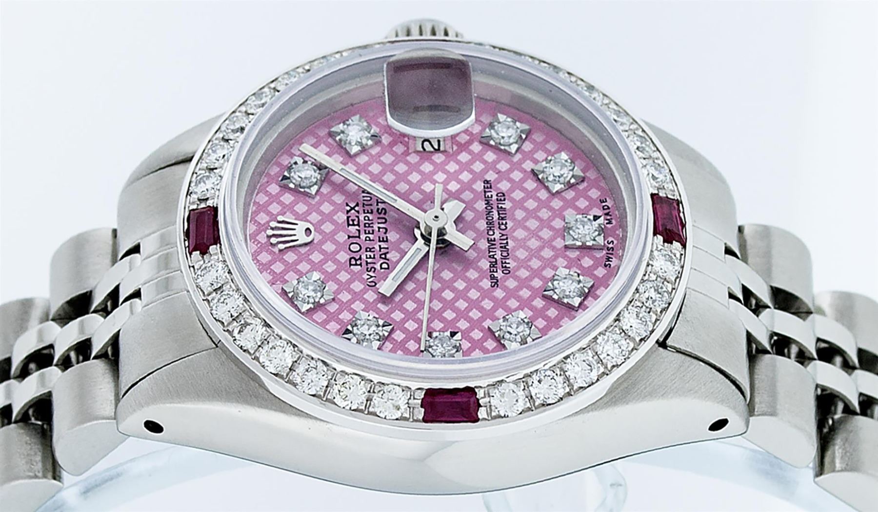 One Ladies Stainless Steel Rolex Datejust Polished Bright with Satin Finish, Serviced & Electronically Tested, Stainless Steel Case: 26mm, Stainless Steel Crown, Custom Bezel: New 18K White Ruby Beadset Diamond Bezel, Diamond + Gem Count: 28 Diamonds + 4 Rubies. Total Weight .70 Carat, Clarity: SI-VS, Color: G to H. Custom Crystal: New Scratch Resistant Synthetic Sapphire Cyclops Lens. Custom Hands: New Luminescent Hands. Movement: Automatic Winding Movement. Custom Dial: Pink Stamp With Single Cut Diamond Hour Markers, 10 Diamonds in Dial, G To H In Color, Clarity: SI-VS. Date Window: 3 O'Clock Position Date Display, Model: Datejust. Condition: G-6 Extra Fine. Bracelet: Stainless Steel Jubilee Band. Bright Polish & Satin Finish. 6.0 Inch Length, Adjustable. Standard Clasp, With Rolex Logo. This Watch Has Been Serviced Time Tested And Is In Excellent Condition It Is Free Of All Scratches And Dents.