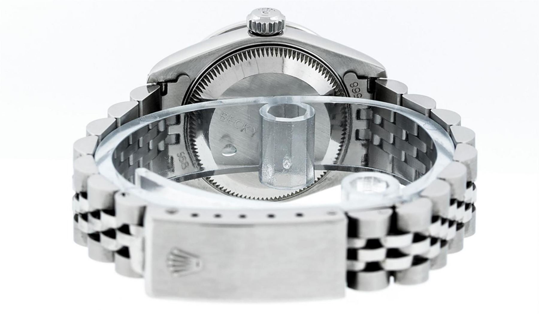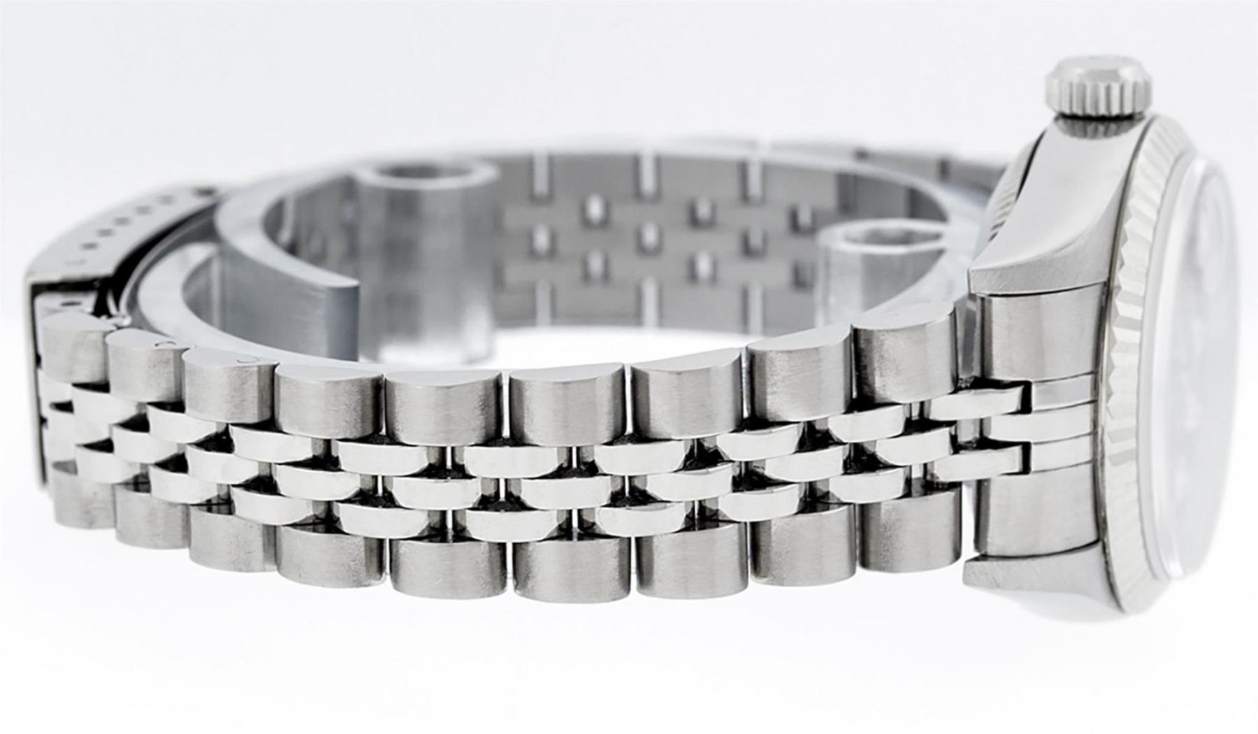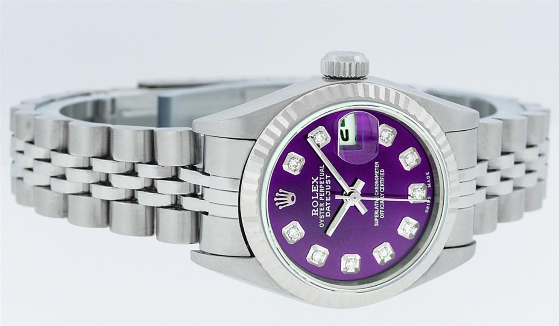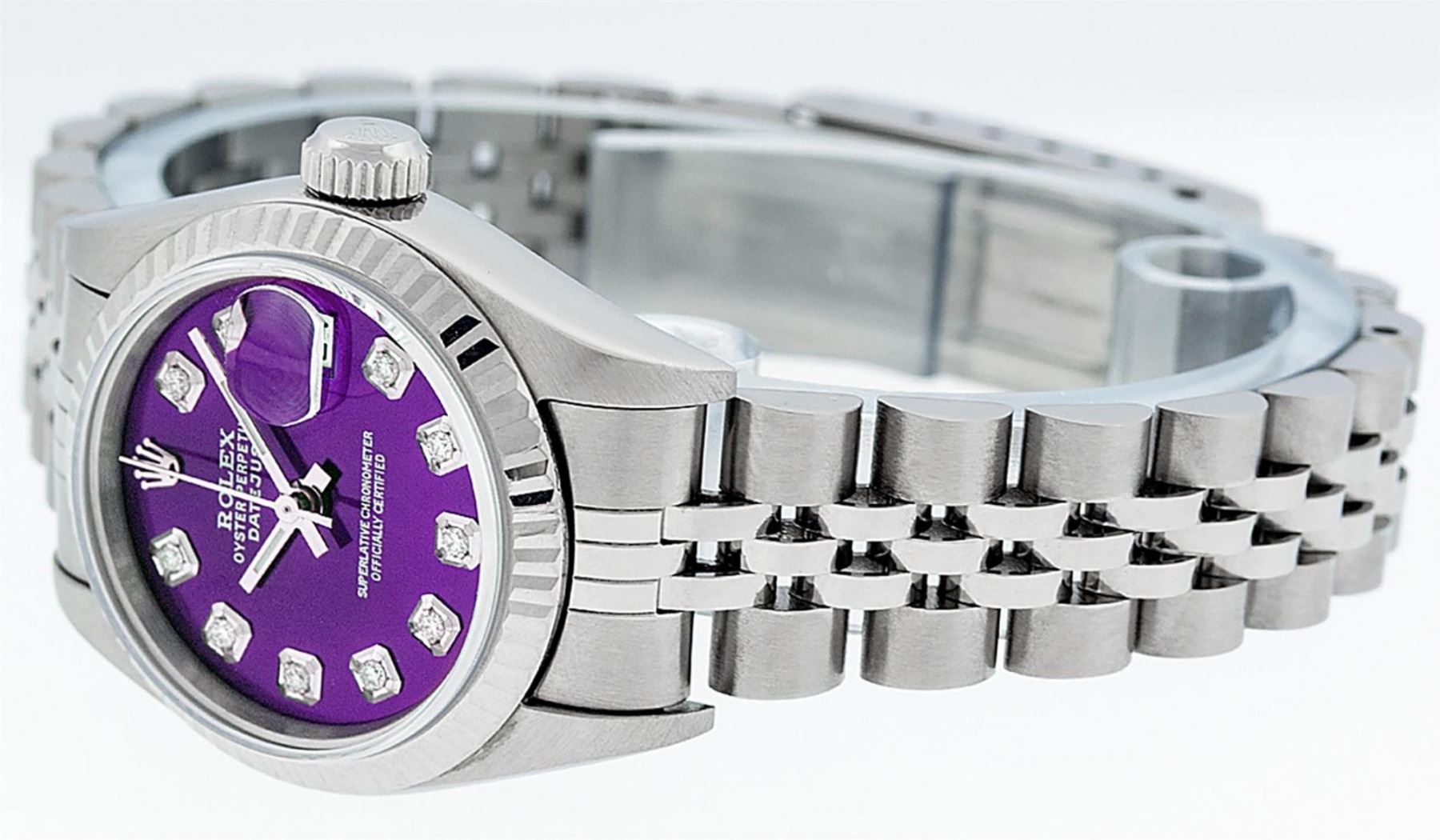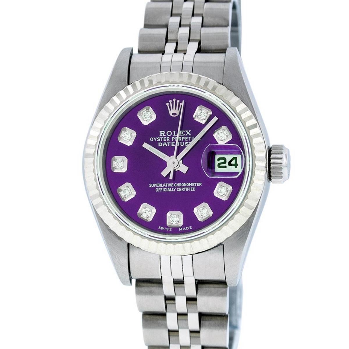 One Ladies Quickset Stainless Steel Rolex Datejust Polished Bright with Satin Finish, Serviced & Electronically Tested, Stainless Steel Case: 26mm, Stainless Steel Crown, Bezel: 18K White Gold Fluted Bezel. Custom Crystal: New Scratch Resistant Sapphire Cyclops Lens. Custom Hands: New Luminescent Hands. Movement: Automatic Winding Movement Caliber 2235. Custom Dial: Purple Diamond Dial, Diamond Count: 10 Diamonds In Dial, Color: G to H, Clarity: SI1 Date Window: 3 O'Clock Position Date Display, Model: 79174 Quickset Datejust. Condition: G-6 Extra Fine. Bracelet: Stainless Steel Jubilee Band. Bright Polish & Satin Finish. 6.0 Inch Length, Adjustable. Standard Clasp, With Rolex Logo. This Watch Has Been Serviced Time Tested And Is In Excellent Condition It Is Free Of All Scratches And Dents.