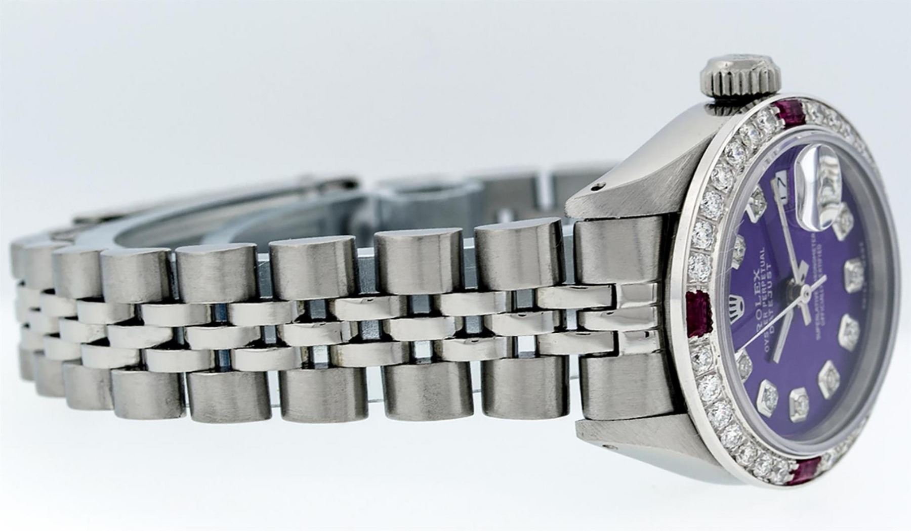 One Ladies Stainless Steel Rolex Datejust Polished Bright with Satin Finish, Serviced & Electronically Tested, Stainless Steel Case: 26mm, Stainless Steel Crown, Custom Bezel: New 18K White Gold Ruby Beadset Diamond Bezel, Diamond + Gem Count: 28 Diamonds + 4 Rubies. Total Weight .70 Carat, Clarity: SI-VS, Color: G to H. Custom Crystal: New Synthetic Sapphire Cyclops Lens. Custom Hands: New Luminescent Hands. Movement: Automatic Winding Movement. Custom Dial: Refinished Purple With Diamond Hour Markers, Diamond Count: 10 Diamond in Dial, G To H In Color, Clarity: SI-VS. Date Window: 3 O'Clock Position Date Display, Model: Datejust. Condition: G-6 Extra Fine. Bracelet: Stainless Steel Jubilee. Bright Polish & Satin Finish. 6.0 Inch Length, Adjustable. Standard Clasp, With Rolex Logo. This Watch Has Been Serviced Time Tested And Is In Excellent Condition It Is Free Of All Scratches And Dents.