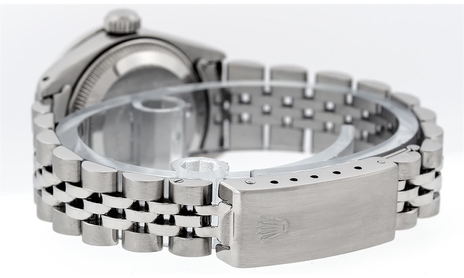 One Ladies Stainless Steel Rolex Datejust Polished Bright with Satin Finish, Serviced & Electronically Tested, Stainless Steel Case: 26mm, Stainless Steel Crown, Custom Bezel: New 18K White Gold Ruby Beadset Diamond Bezel, Diamond + Gem Count: 28 Diamonds + 4 Rubies. Total Weight .70 Carat, Clarity: SI-VS, Color: G to H. Custom Crystal: New Synthetic Sapphire Cyclops Lens. Custom Hands: New Luminescent Hands. Movement: Automatic Winding Movement. Custom Dial: Refinished Purple With Diamond Hour Markers, Diamond Count: 10 Diamond in Dial, G To H In Color, Clarity: SI-VS. Date Window: 3 O'Clock Position Date Display, Model: Datejust. Condition: G-6 Extra Fine. Bracelet: Stainless Steel Jubilee. Bright Polish & Satin Finish. 6.0 Inch Length, Adjustable. Standard Clasp, With Rolex Logo. This Watch Has Been Serviced Time Tested And Is In Excellent Condition It Is Free Of All Scratches And Dents.