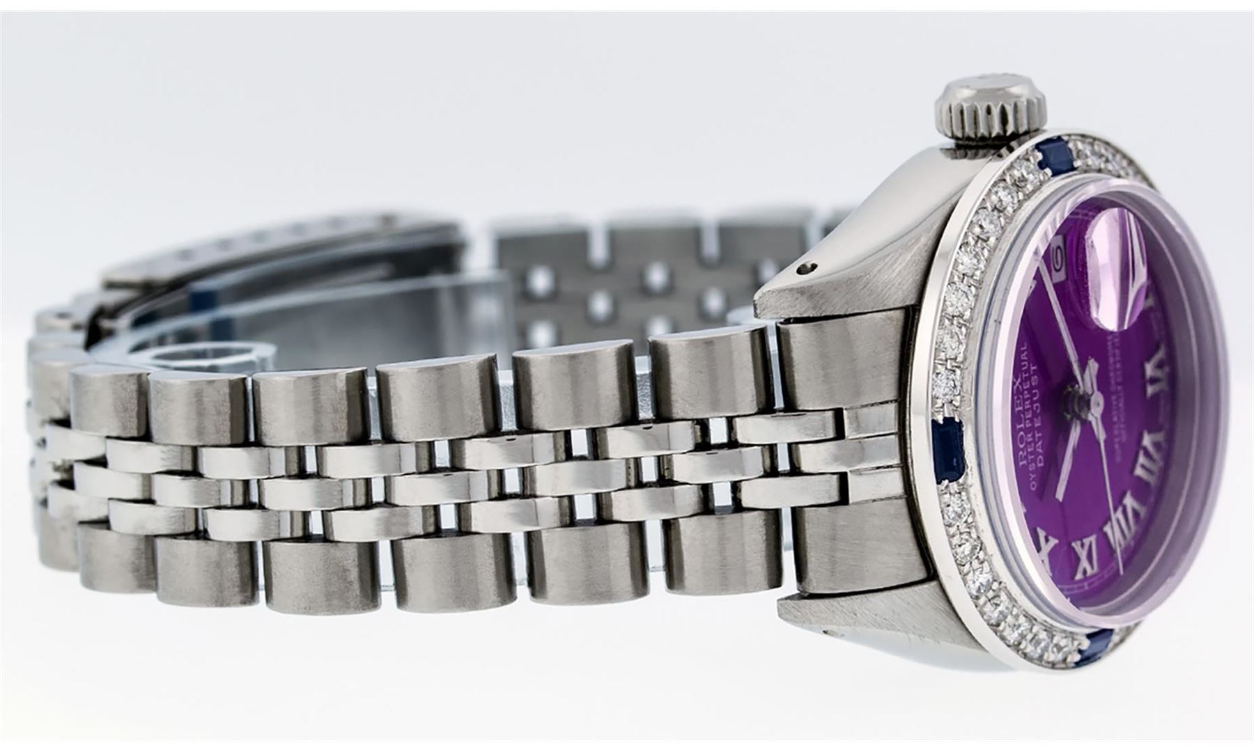One Ladies Stainless Steel Rolex Datejust Polished Bright with Satin Finish, Serviced & Electronically Tested, Stainless Steel Case: 26mm, Stainless Steel Crown, Custom Bezel: New 18K White Gold Sapphire Beadset Diamond Bezel, Diamond + Gem Count: 28 Diamonds + 4 Sapphires, Total Weight .70 Carat, Clarity: SI-VS, Color: G to H. Custom Crystal: New Scratch Resistant Synthetic Sapphire Cyclops Lens. Custom Hands: New Luminescent Hands. Movement: Automatic Winding Movement. Custom Dial: Purple Roman Dial With Square Track. Date Window: 3 O'Clock Position Date Display, Model: Datejust. Condition: G-6 Extra Fine. Bracelet: Stainless Steel Jubilee Band. Bright Polish & Satin Finish. 6.0 Inch Length, Adjustable. Standard Clasp, With Rolex Logo. This Watch Has Been Serviced Time Tested And Is In Excellent Condition It Is Free Of All Scratches And Dents.
