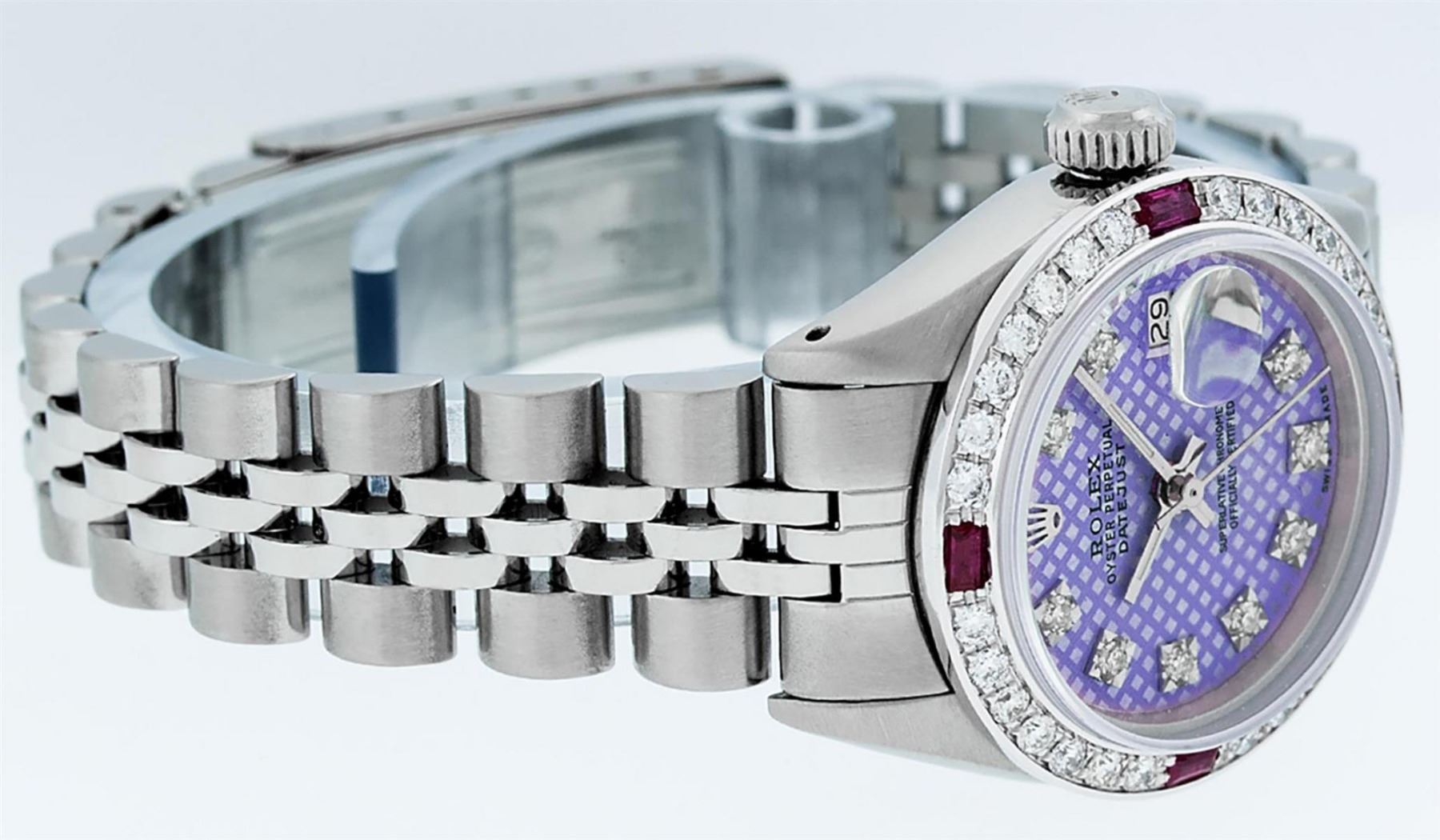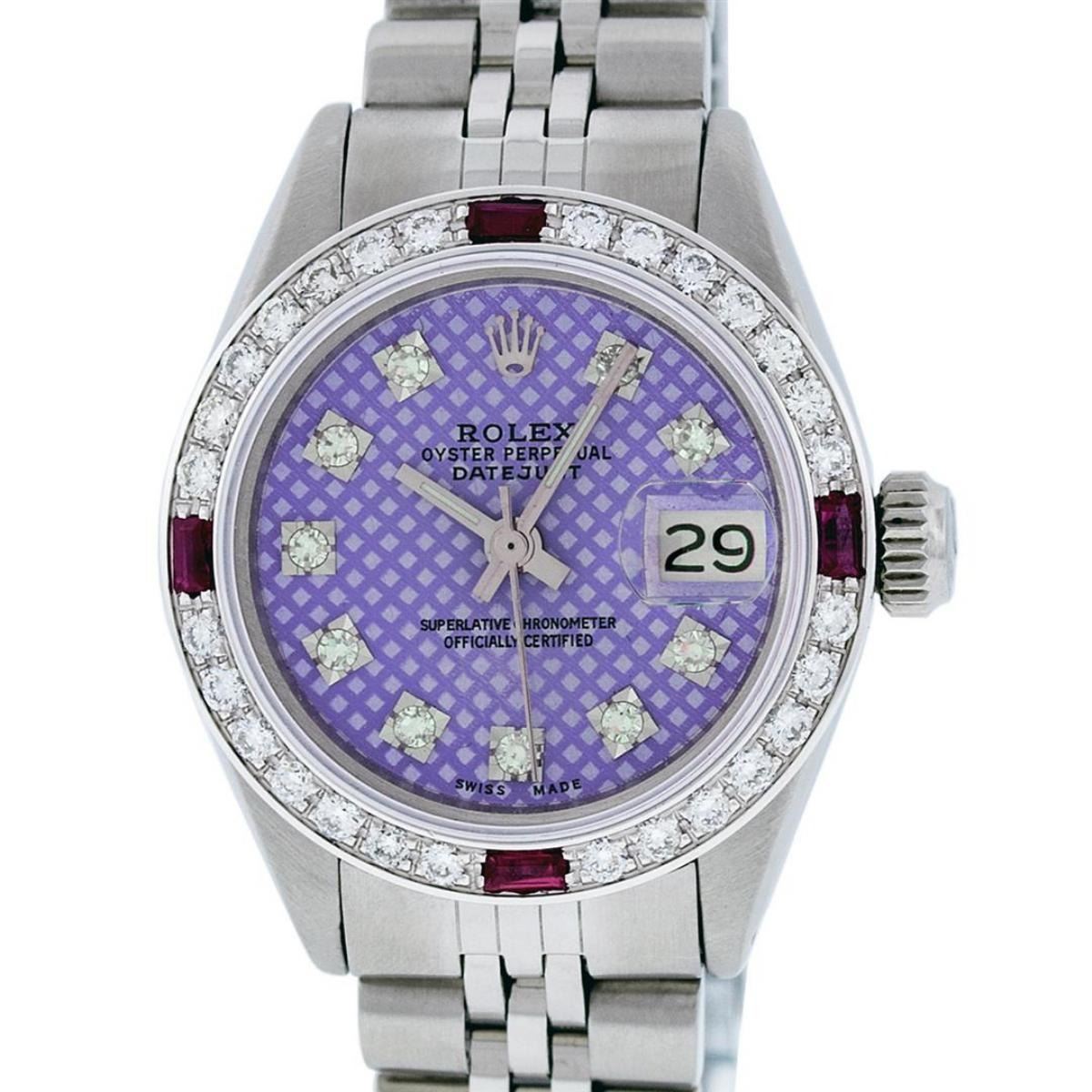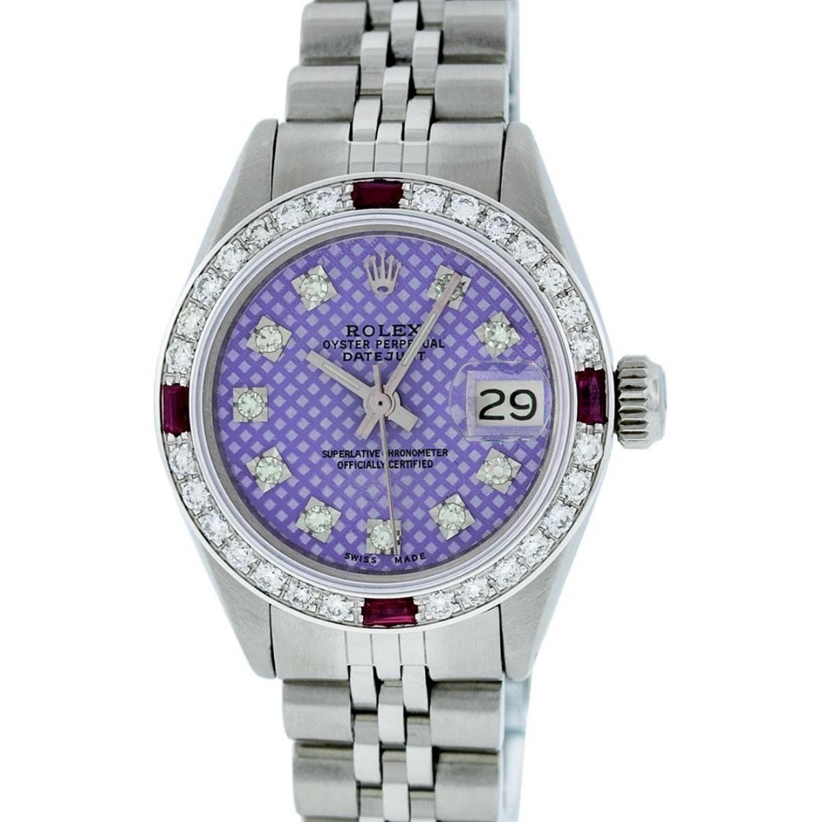 One Ladies Stainless Steel Rolex Datejust Polished Bright with Satin Finish, Serviced & Electronically Tested, Stainless Steel Case: 26mm, Stainless Steel Crown, Custom Bezel: New 18K White Ruby Beadset Diamond Bezel, Diamond + Gem Count: 28 Diamonds + 4 Rubies. Total Weight .70 Carat, Clarity: SI-VS, Color: G to H. Custom Crystal: New Scratch Resistant Synthetic Sapphire Cyclops Lens. Custom Hands: New Luminescent Hands. Movement: Automatic Winding Movement. Custom Dial: Purple Stamp With Single Cut Diamond Hour Markers, 10 Diamonds in Dial, G To H In Color, Clarity: SI-VS. Date Window: 3 O'Clock Position Date Display, Model: Datejust. Condition: G-6 Extra Fine. Bracelet: Stainless Steel Jubilee Band. Bright Polish & Satin Finish. 6.0 Inch Length, Adjustable. Standard Clasp, With Rolex Logo. This Watch Has Been Serviced Time Tested And Is In Excellent Condition It Is Free Of All Scratches And Dents.