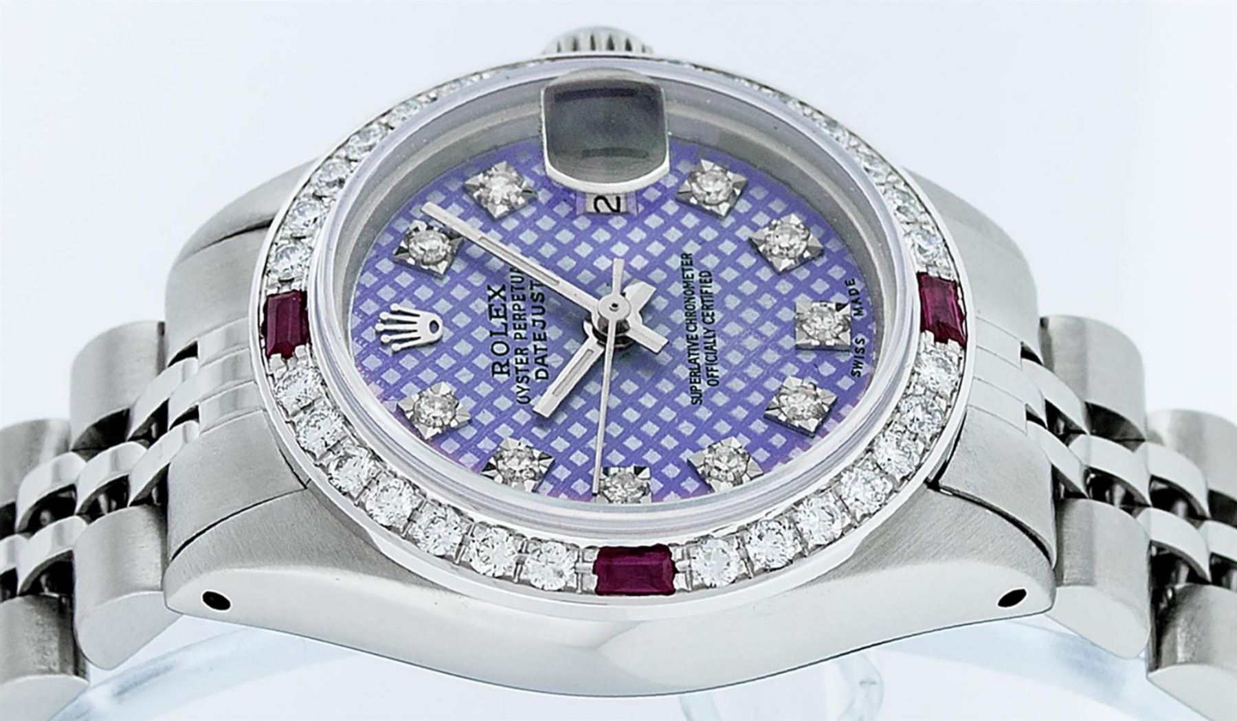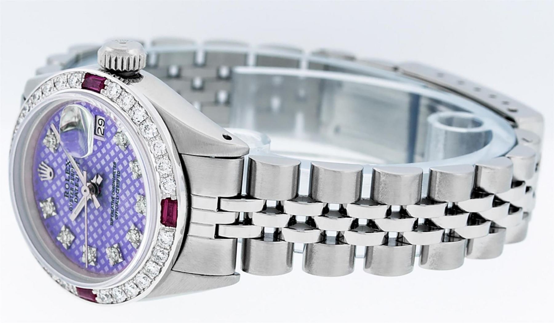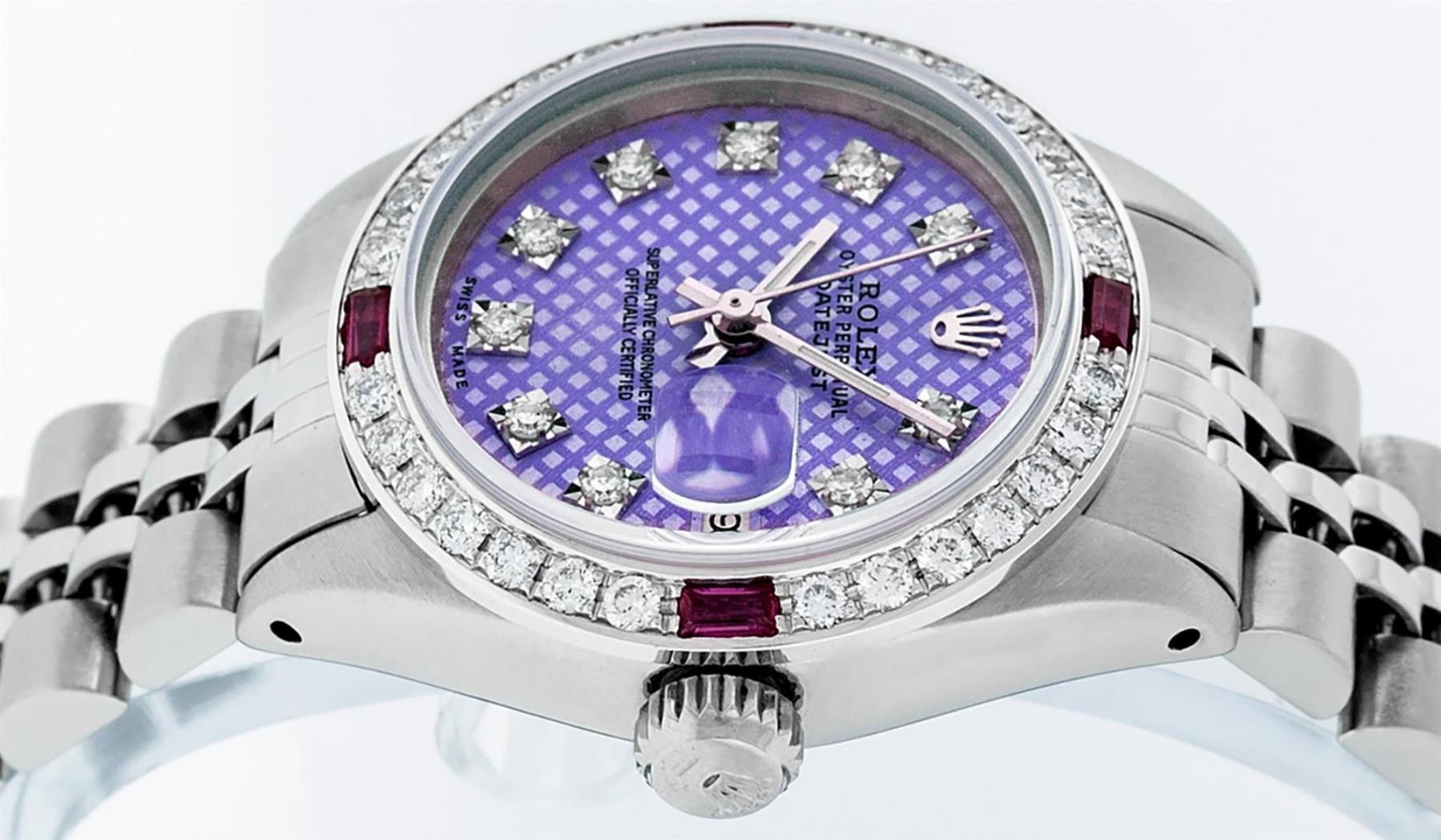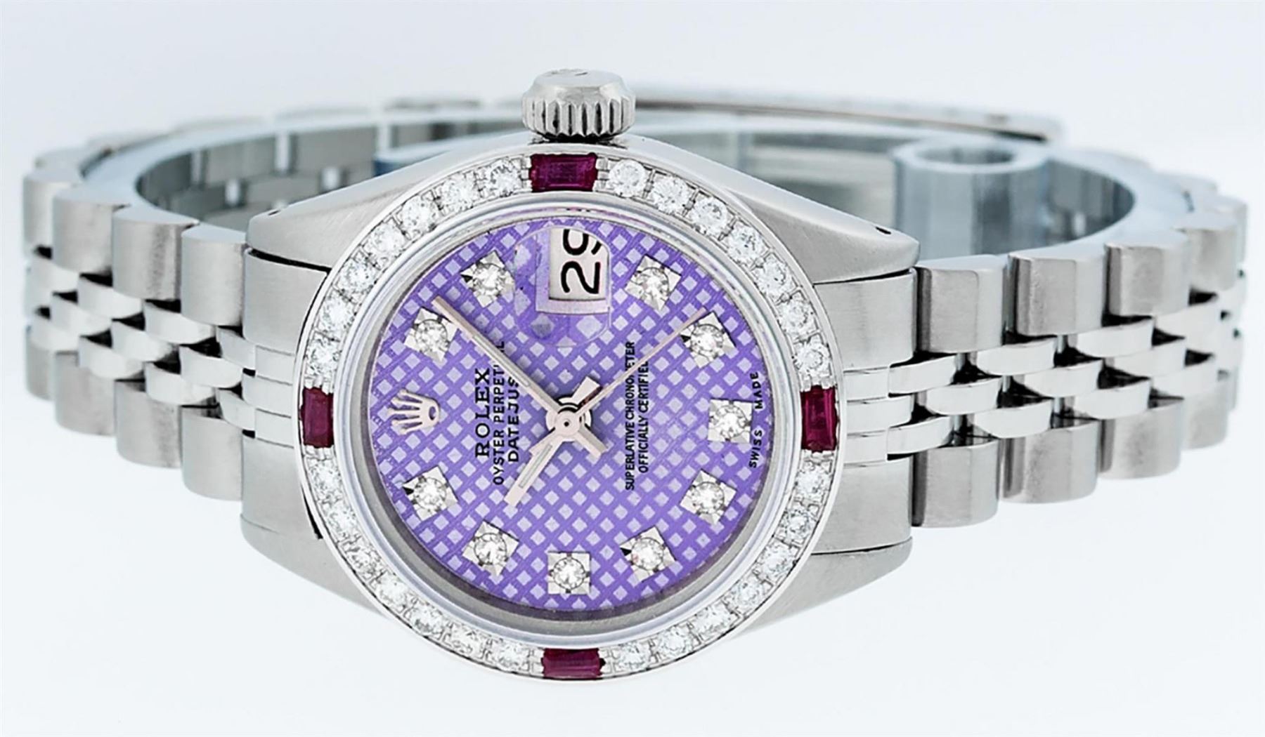One Ladies Stainless Steel Rolex Datejust Polished Bright with Satin Finish, Serviced & Electronically Tested, Stainless Steel Case: 26mm, Stainless Steel Crown, Custom Bezel: New 18K White Ruby Beadset Diamond Bezel, Diamond + Gem Count: 28 Diamonds + 4 Rubies. Total Weight .70 Carat, Clarity: SI-VS, Color: G to H. Custom Crystal: New Scratch Resistant Synthetic Sapphire Cyclops Lens. Custom Hands: New Luminescent Hands. Movement: Automatic Winding Movement. Custom Dial: Purple Stamp With Single Cut Diamond Hour Markers, 10 Diamonds in Dial, G To H In Color, Clarity: SI-VS. Date Window: 3 O'Clock Position Date Display, Model: Datejust. Condition: G-6 Extra Fine. Bracelet: Stainless Steel Jubilee Band. Bright Polish & Satin Finish. 6.0 Inch Length, Adjustable. Standard Clasp, With Rolex Logo. This Watch Has Been Serviced Time Tested And Is In Excellent Condition It Is Free Of All Scratches And Dents.
