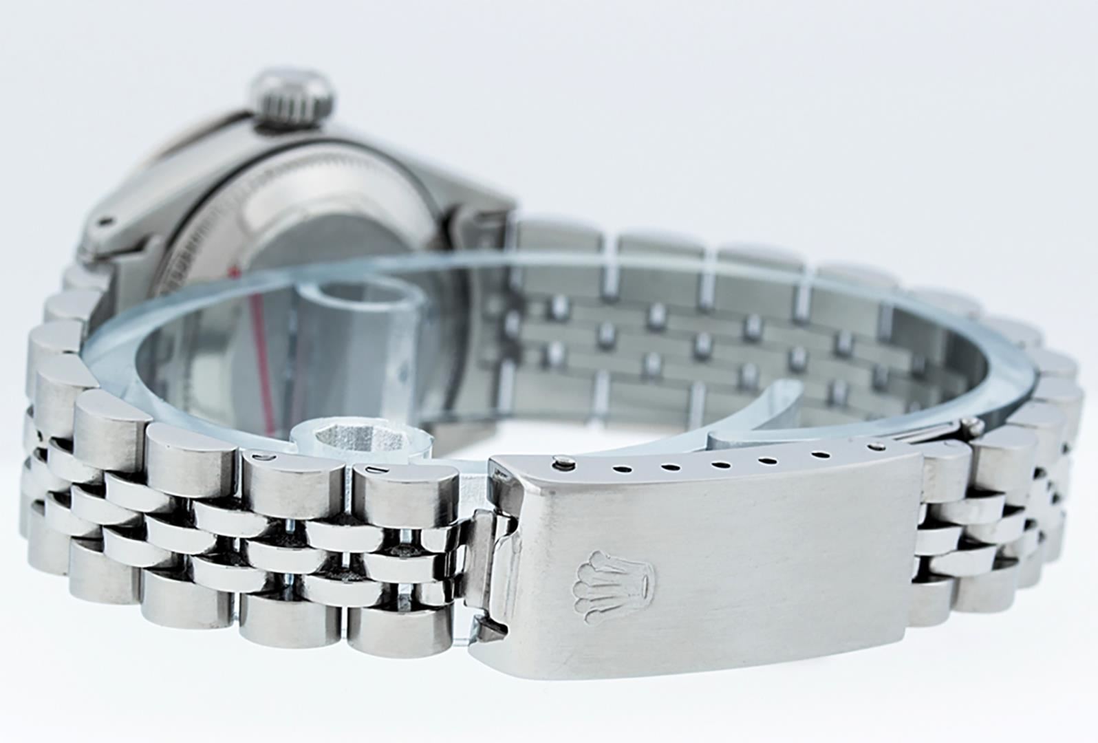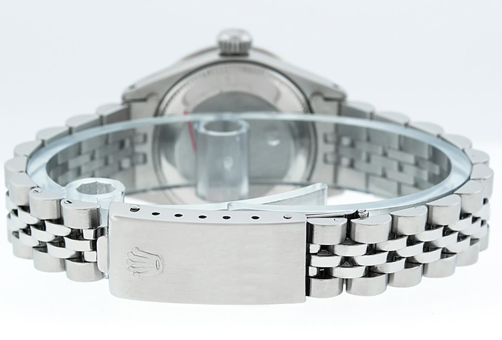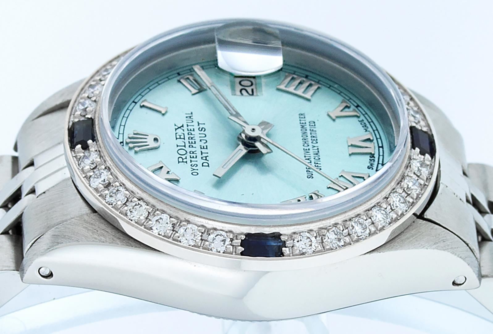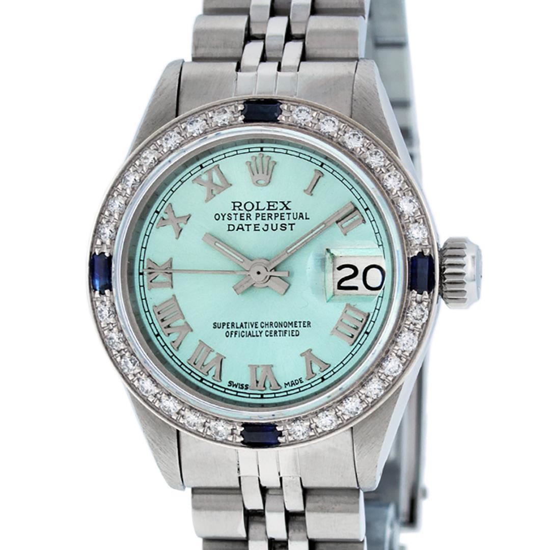 One Ladies Pre Owned Quickset Stainless Steel Rolex Datejust Polished Bright with Satin Finish, Serviced And Electronically Tested, Stainless Steel Case: 26mm, Stainless Steel Crown, Custom Bezel: New 18K White Gold Sapphire Beadset Diamond Bezel, Diamond + Gem Count: 28 Diamonds + 4 Sapphires. Custom Crystal: New Sapphire With Magnified Date Window. Custom Hands: New Luminescent Hands. Rolex Movement: Automatic Winding Movement 2135. Custom Dial: Custom Blue Roman Dial. Date Window: 3 O'Clock Position Date Display, Model: Datejust. Condition: G-6 Extra Fine. Rolex Bracelet: Stainless Steel Jubilee Band. Bright Polish And Satin Finish. 6.0 Inch Length, Adjustable. Standard Clasp, With Rolex Logo. This Watch Has Been Serviced Time Tested And Is In Excellent Condition It Is Free Of All Scratches And Dents.