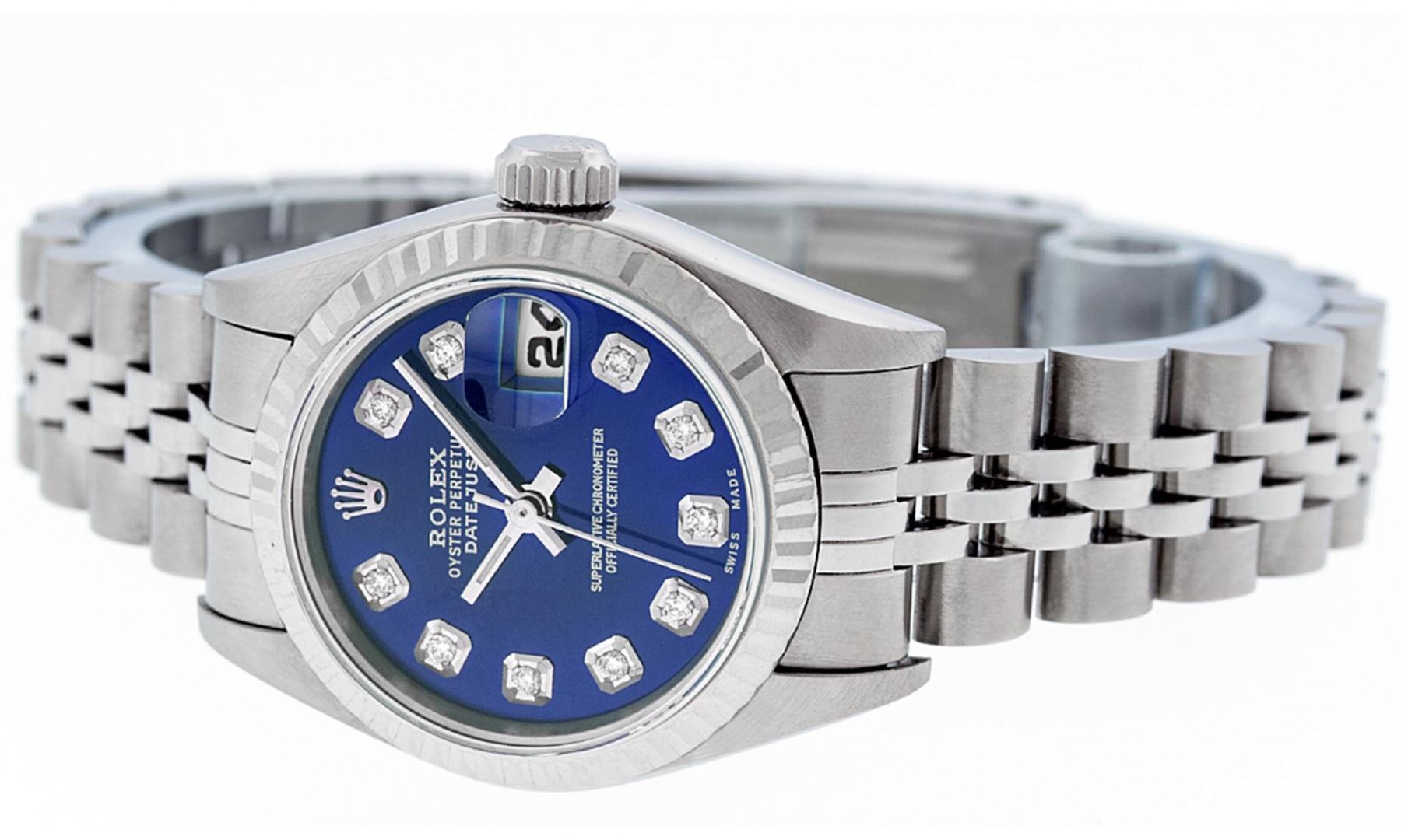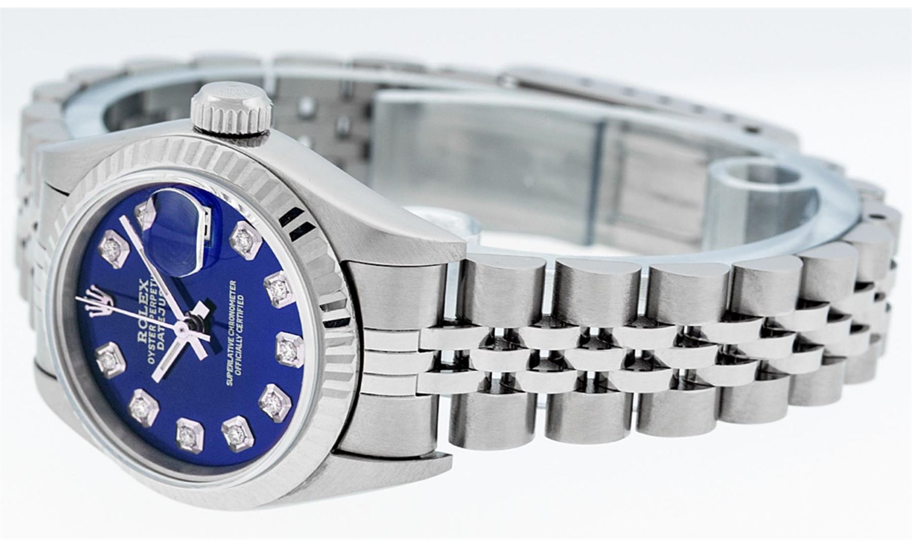 One Rolex Ladies Pre Owned Quickset Stainless Steel Datejust Polished Bright with Satin Finish, Serviced And Electronically Tested, Rolex Stainless Steel Case: 26mm, Rolex Stainless Steel Crown, Rolex Bezel: 18K White Gold Fluted Bezel. Custom Crystal: New Sapphire With Date Window. Custom Hands: New Luminescent Hands. Rolex Movement: Automatic Winding Movement 2235. Custom Dial: Custom Blue Dial With Added Diamonds, Diamond Count: 10 Diamonds On Dial. Date Window: 3 O'Clock Position Date Display, Model: Quickset Datejust. Condition: G-6 Extra Fine. Rolex Bracelet: Stainless Steel Jubilee Band. Bright Polish And Satin Finish. 6.0 Inch Length, Adjustable. Standard Clasp, With Rolex Logo. This Watch Has Been Serviced Time Tested And Is In Excellent Condition It Is Free Of All Scratches And Dents.