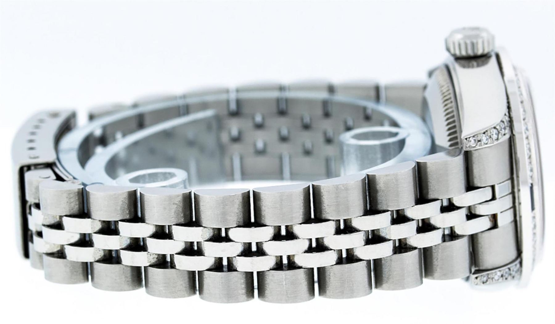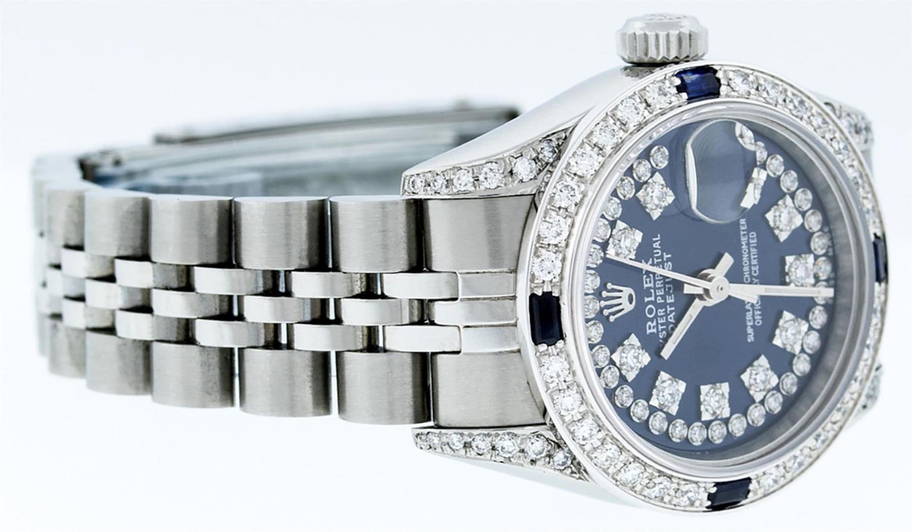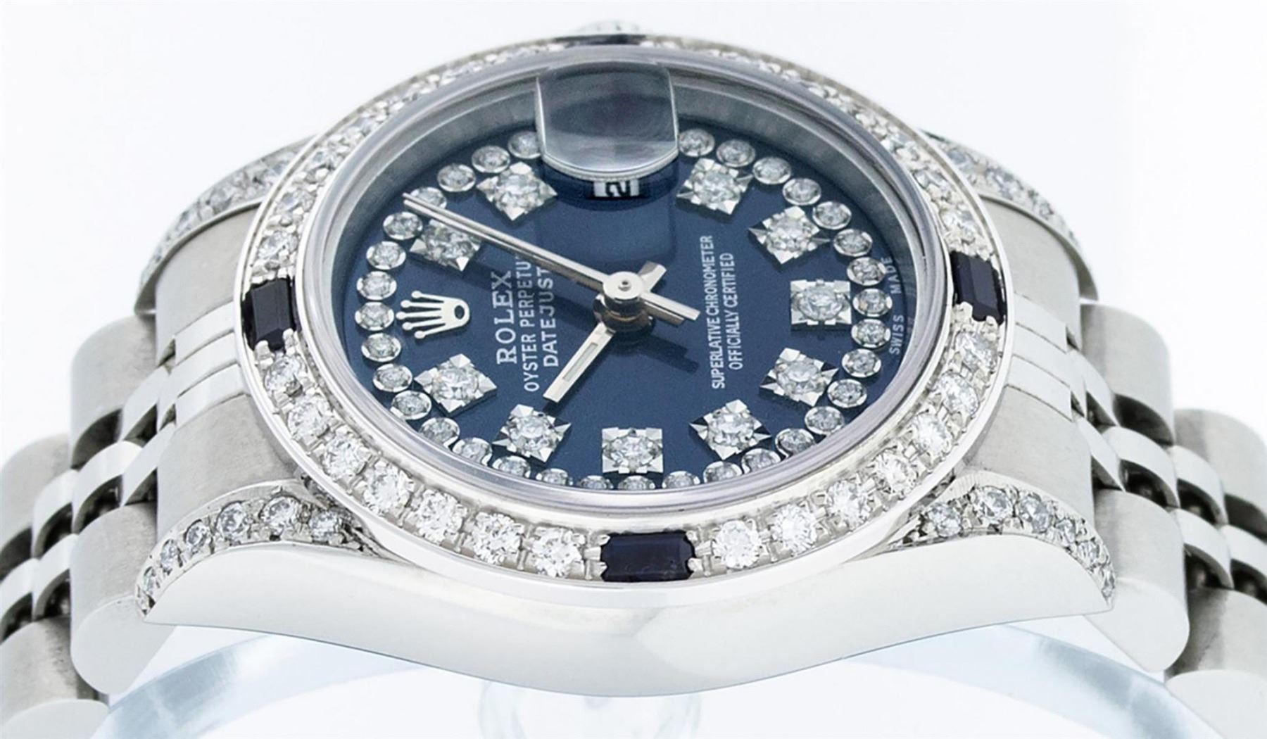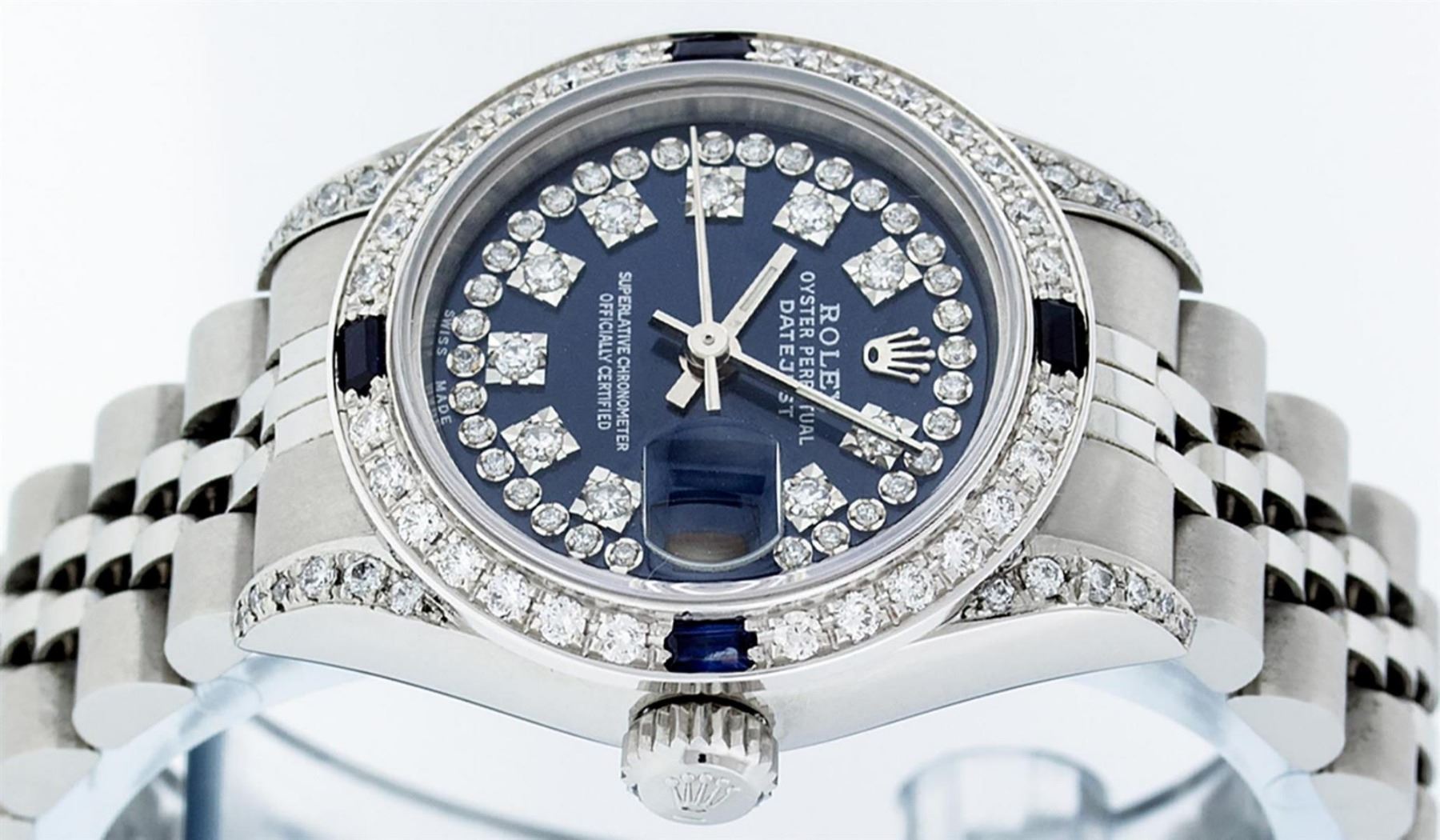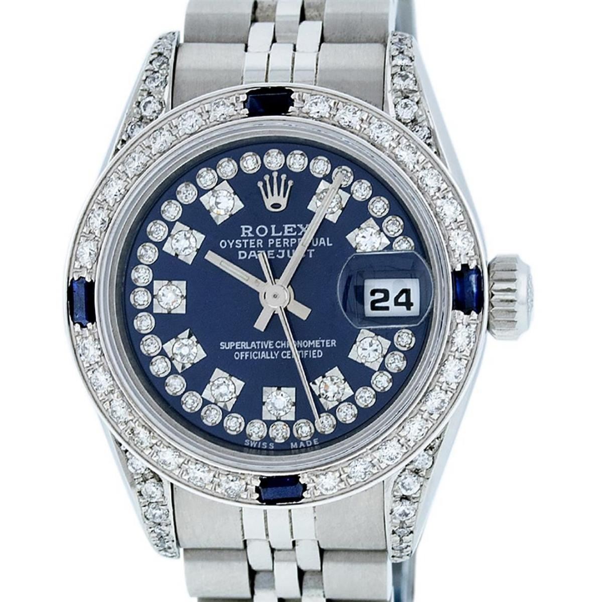 One Quickset Ladies Stainless Steel Rolex Datejust Polished Bright with Satin Finish, Serviced & Electronically Tested, Stainless Steel Case: 26mm, Stainless Steel Crown, Custom Diamond Lugs: 24 Diamonds On Lugs, Clarity: SI-VS, Color: G to H. Custom Bezel: New 18K White Gold Diamond + Sapphire Beadset Diamond Bezel, Stone Count: 28 Diamonds + 4 Sapphires, Total Weight .70 Carat, Clarity: SI-VS, Color: G to H. Custom Crystal: New Scratch Resistant Synthetic Sapphire Cyclops Lens. Custom Hands: New Luminescent Hands. Movement: Automatic Winding Movement Caliber 2235. Custom Dial: Refinished Single Cut Blue String Diamond Dial, 43 Diamonds in Dial G To H In Color, Clarity: VS. Date Window: 3 O'Clock Position Date Display, Model: Quickset Datejust. Condition: G-6 Extra Fine. Bracelet: Stainless Steel Jubilee Band. Bright Polish & Satin Finish. 6.0 Inch Length, Adjustable. Standard Clasp, With Rolex Logo. This Watch Has Been Serviced Time Tested And Is In Excellent Condition It Is Free Of All Scratches And Dents.
