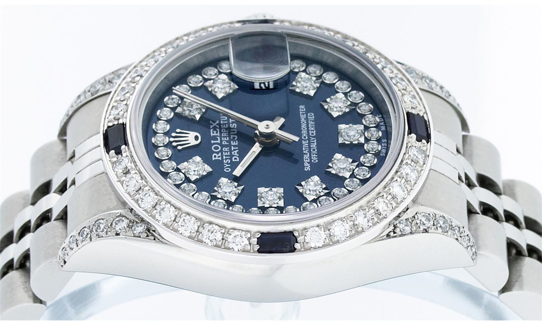 One Quickset Ladies Stainless Steel Rolex Datejust Polished Bright with Satin Finish, Serviced & Electronically Tested, Stainless Steel Case: 26mm, Stainless Steel Crown, Custom Diamond Lugs: 24 Diamonds On Lugs, Clarity: SI-VS, Color: G to H. Custom Bezel: New 18K White Gold Diamond + Sapphire Beadset Diamond Bezel, Stone Count: 28 Diamonds + 4 Sapphires, Total Weight .70 Carat, Clarity: SI-VS, Color: G to H. Custom Crystal: New Scratch Resistant Synthetic Sapphire Cyclops Lens. Custom Hands: New Luminescent Hands. Movement: Automatic Winding Movement Caliber 2235. Custom Dial: Refinished Single Cut Blue String Diamond Dial, 43 Diamonds in Dial G To H In Color, Clarity: VS. Date Window: 3 O'Clock Position Date Display, Model: Quickset Datejust. Condition: G-6 Extra Fine. Bracelet: Stainless Steel Jubilee Band. Bright Polish & Satin Finish. 6.0 Inch Length, Adjustable. Standard Clasp, With Rolex Logo. This Watch Has Been Serviced Time Tested And Is In Excellent Condition It Is Free Of All Scratches And Dents.