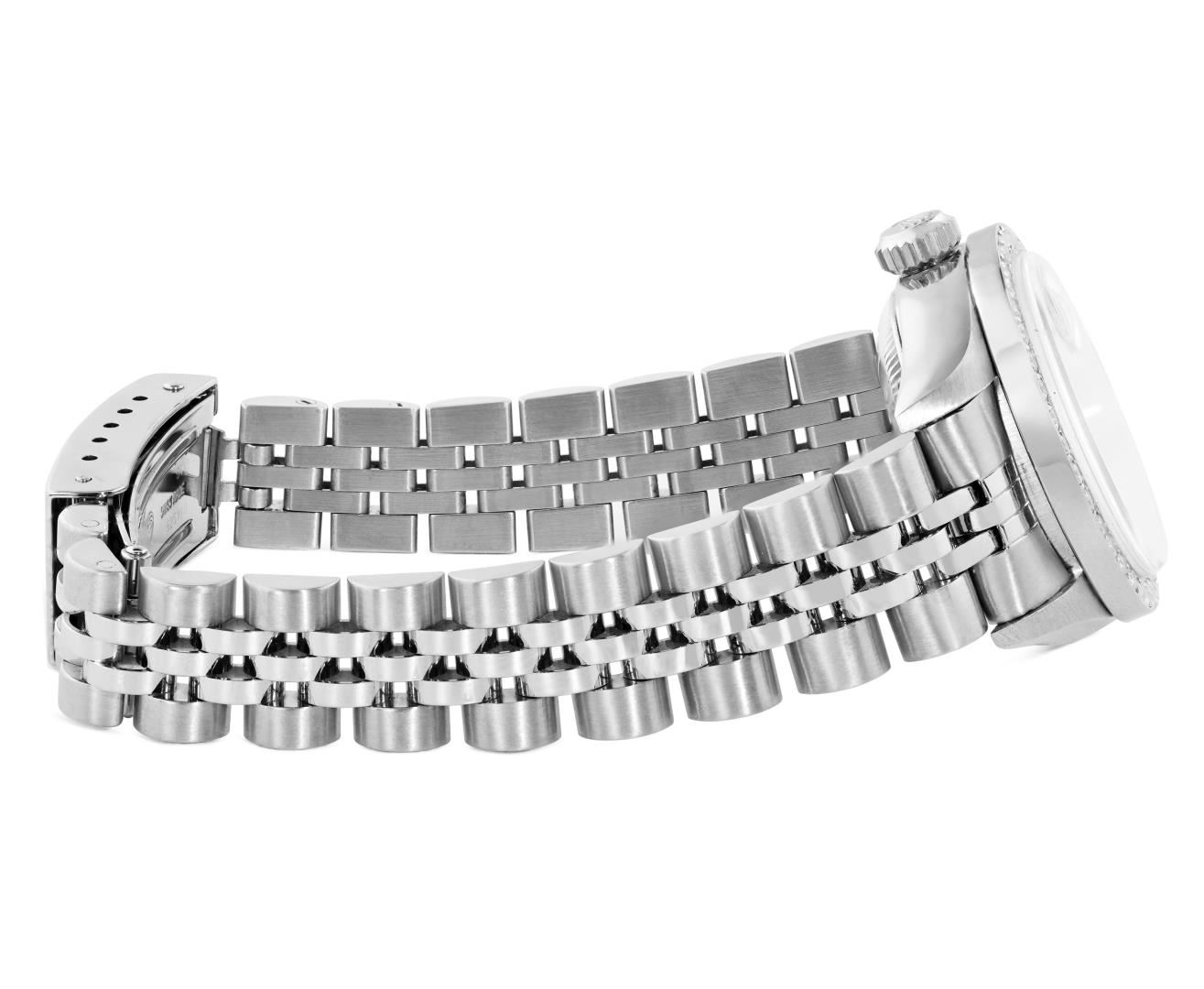 One Rolex Ladies Pre Owned Quickset Stainless Steel Date Wristwatch Polished Bright with Satin Finish, Serviced & Electronically Tested, Stainless Steel Case: 26mm, Stainless Steel Crown, Custom Bezel: New Stainless Steel Beadset Diamond Bezel, Diamond Count: 40 Diamonds On Bezel. Custom Crystal: New Sapphire With Magnified Date Window. Custom Hands: New Non Luminescent Hands. Rolex Movement: 2235 Automatic Winding Movement. Rolex Dial: Factory Blue With Roman Hour Markers, Square Track. Date Window: 3 O'Clock Position Date Display, Model: Quickset Date. Condition: G-6 Extra Fine. Rolex Bracelet: Stainless Steel Jubilee Band. Bright Polish And Satin Finish. 6.0 Inch Length, Adjustable. Standard Clasp, With Rolex Logo. This Watch Has Been Serviced And Time Tested. It Is In Excellent Condition, Free Of All Scratches And Dents.