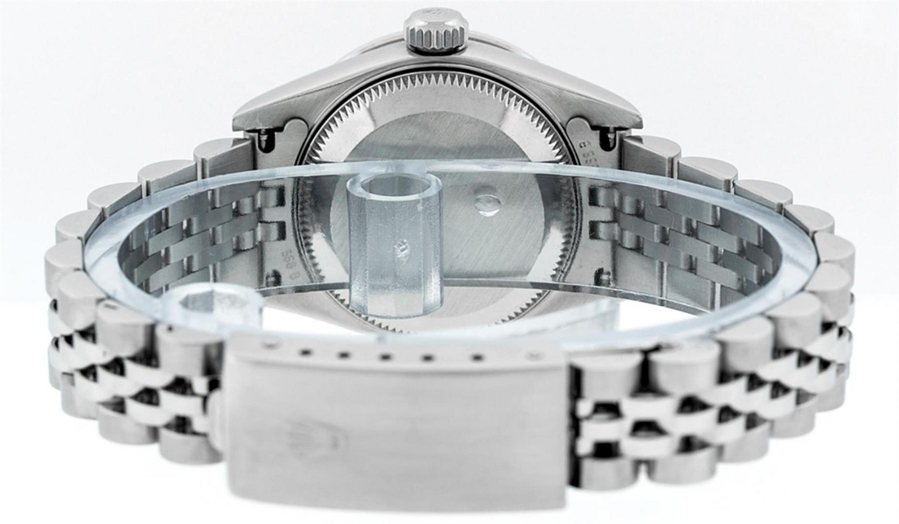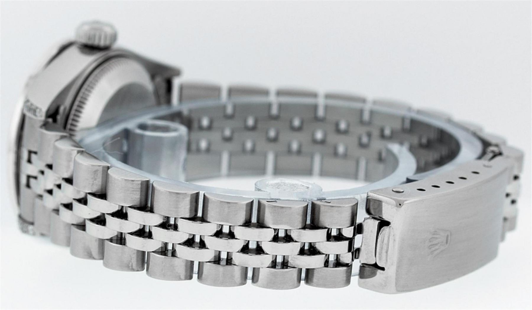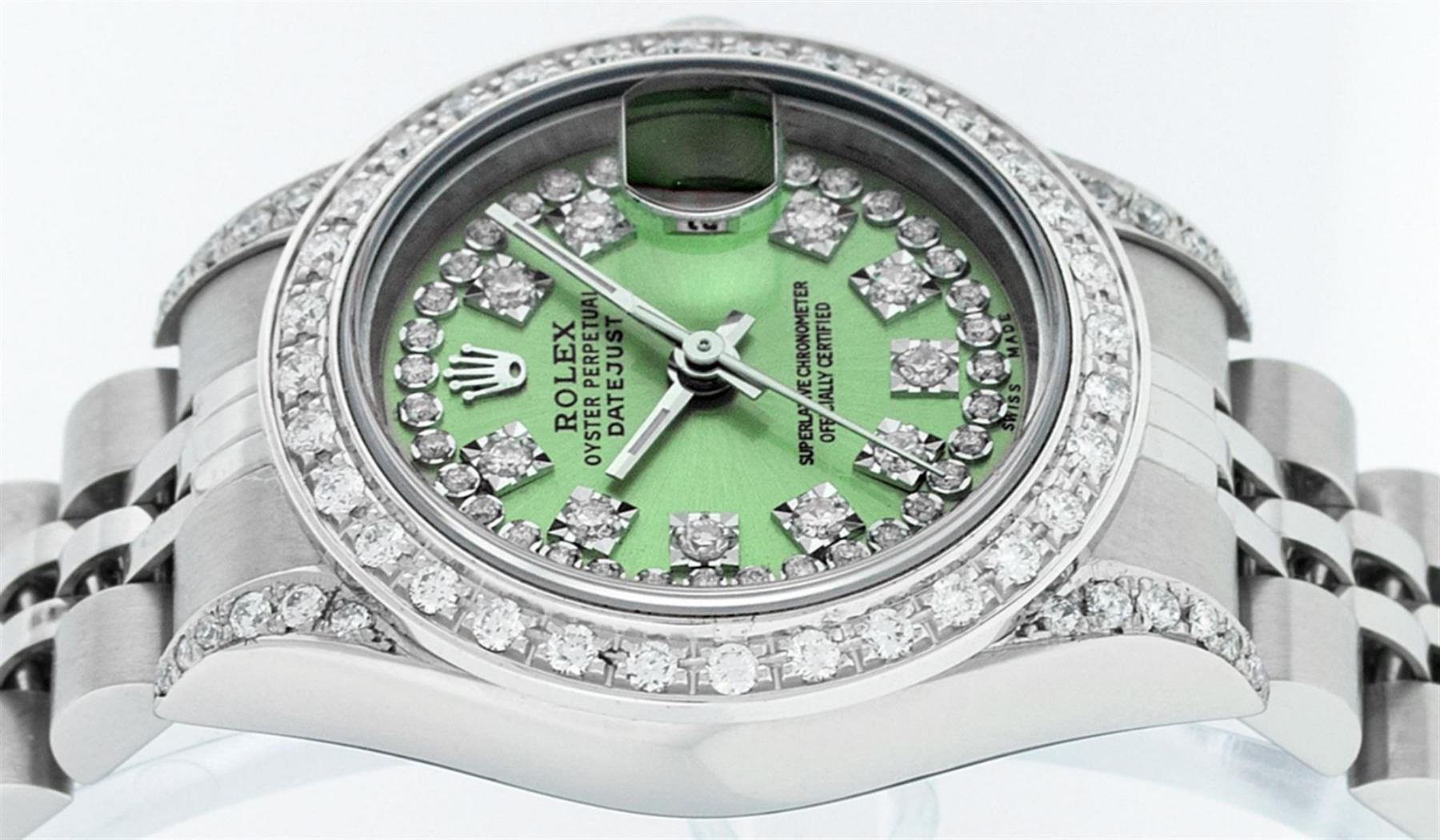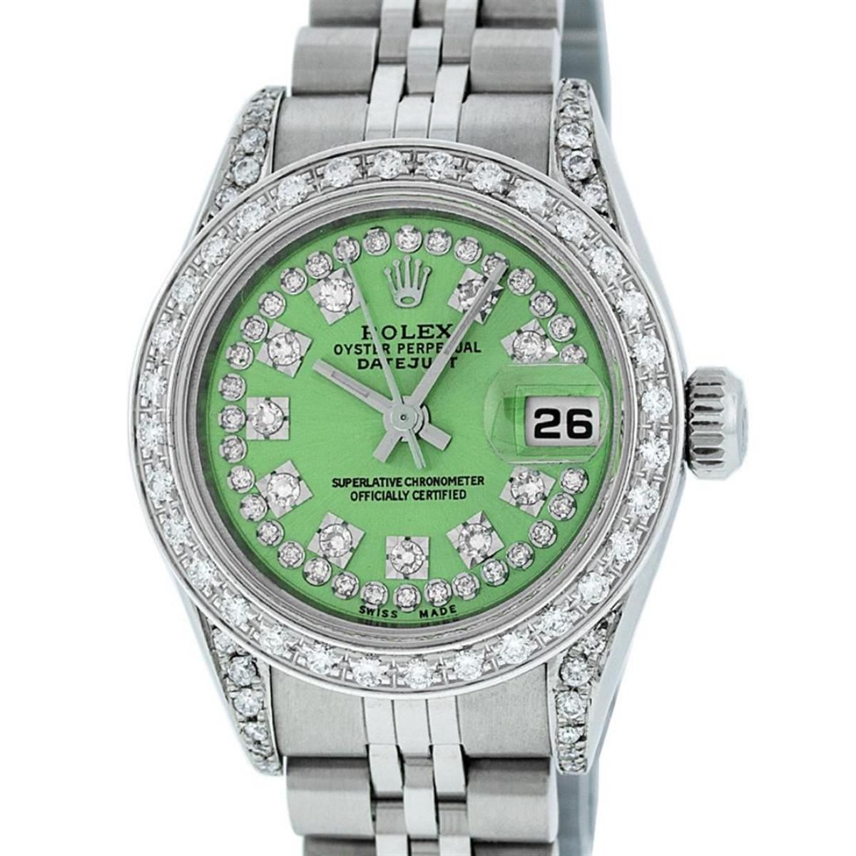 One Quickset Ladies Stainless Steel Rolex Datejust Polished Bright with Satin Finish, Serviced & Electronically Tested, Stainless Steel Case: 26mm, Stainless Steel Crown, Custom Diamond Lugs: 24 Diamonds On Lugs, Clarity: SI-VS, Color: G to H. Custom Bezel: New 18K White Gold Beadset Diamond Bezel, Stone Count: 32 Diamonds On Bezel, Total Bezel Weight .70 Carat, Clarity: SI-VS, Color: G to H. Custom Crystal: New Scratch Resistant Synthetic Sapphire Cyclops Lens. Custom Hands: New Luminescent Hands. Movement: Automatic Winding Movement Caliber 2235. Custom Dial: Refinished Single Cut Green String Diamond Dial, 43 Diamonds in Dial G To H In Color, Clarity: VS. Date Window: 3 O'Clock Position Date Display, Model: 79160 Quickset Datejust. Condition: G-6 Extra Fine. Bracelet: Stainless Steel Jubilee Band. Bright Polish & Satin Finish. 6.0 Inch Length, Adjustable. Standard Clasp, With Rolex Logo. This Watch Has Been Serviced Time Tested And Is In Excellent Condition It Is Free Of All Scratches And Dents.