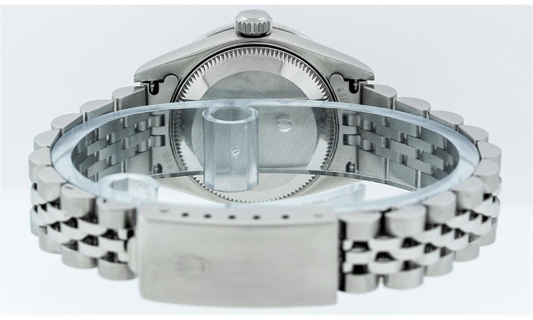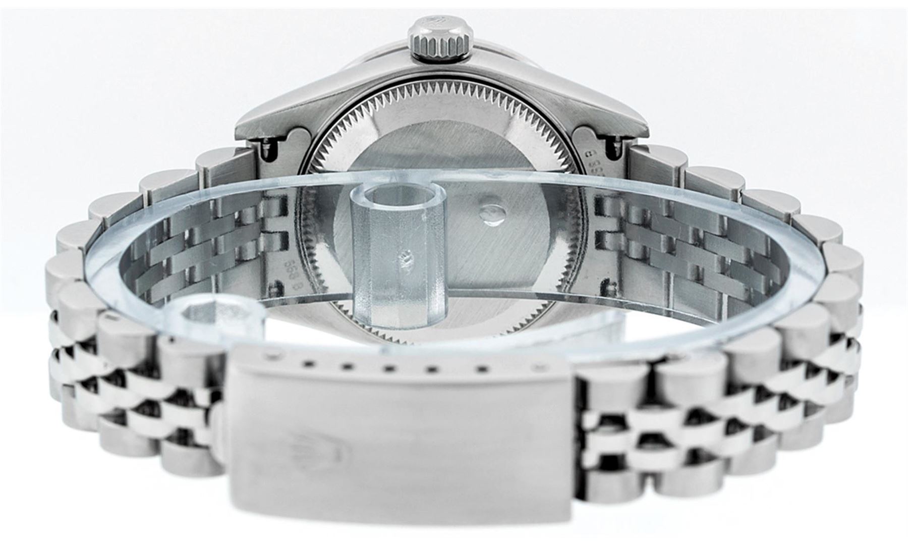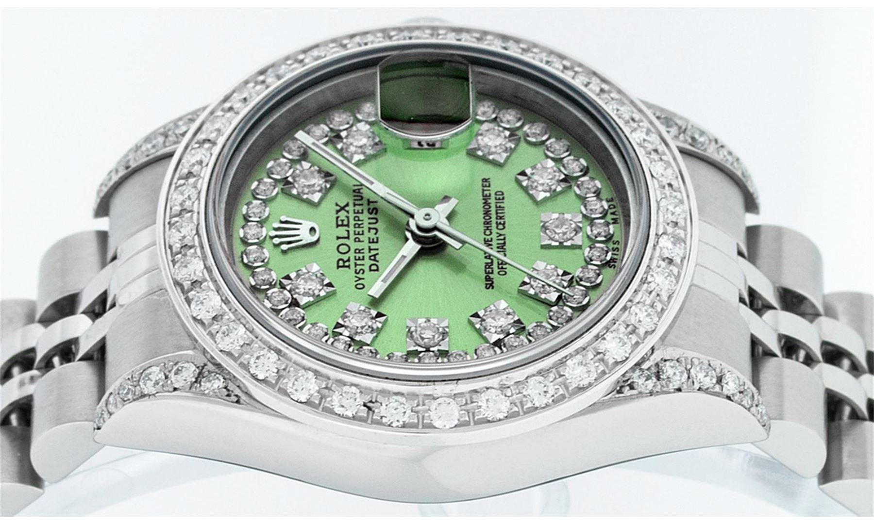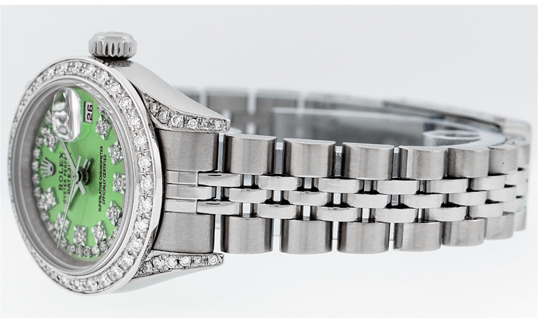 One Quickset Ladies Stainless Steel Rolex Datejust Polished Bright with Satin Finish, Serviced & Electronically Tested, Stainless Steel Case: 26mm, Stainless Steel Crown, Custom Diamond Lugs: 24 Diamonds On Lugs, Clarity: SI-VS, Color: G to H. Custom Bezel: New 18K White Gold Beadset Diamond Bezel, Stone Count: 32 Diamonds On Bezel, Total Bezel Weight .70 Carat, Clarity: SI-VS, Color: G to H. Custom Crystal: New Scratch Resistant Synthetic Sapphire Cyclops Lens. Custom Hands: New Luminescent Hands. Movement: Automatic Winding Movement Caliber 2235. Custom Dial: Refinished Single Cut Green String Diamond Dial, 43 Diamonds in Dial G To H In Color, Clarity: VS. Date Window: 3 O'Clock Position Date Display, Model: 79160 Quickset Datejust. Condition: G-6 Extra Fine. Bracelet: Stainless Steel Jubilee Band. Bright Polish & Satin Finish. 6.0 Inch Length, Adjustable. Standard Clasp, With Rolex Logo. This Watch Has Been Serviced Time Tested And Is In Excellent Condition It Is Free Of All Scratches And Dents.