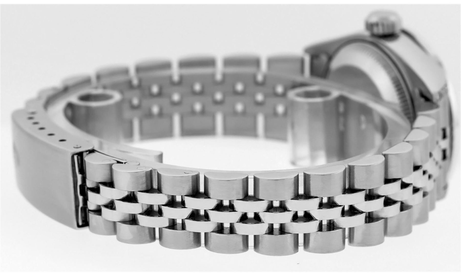 One Quickset Ladies Stainless Steel Rolex Datejust Polished Bright with Satin Finish, Serviced & Electronically Tested, Stainless Steel Case: 26mm, Stainless Steel Crown, Custom Diamond Lugs: 24 Diamonds On Lugs, Clarity: SI-VS, Color: G to H. Custom Bezel: New 18K White Gold Diamond + Emerald Beadset Diamond Bezel, Stone Count: 28 Diamonds + 4 Emeralds, Total Weight .70 Carat, Clarity: SI-VS, Color: G to H. Custom Crystal: New Scratch Resistant Synthetic Sapphire Cyclops Lens. Custom Hands: New Luminescent Hands. Movement: Automatic Winding Movement Caliber 2235. Custom Dial: Refinished Single Cut Green Mother Of Pearl String Diamond Dial, 43 Diamonds in Dial G To H In Color, Clarity: VS. Date Window: 3 O'Clock Position Date Display, Model: Quickset Datejust. Condition: G-6 Extra Fine. Bracelet: Stainless Steel Jubilee Band. Bright Polish & Satin Finish. 6.0 Inch Length, Adjustable. Standard Clasp, With Rolex Logo. This Watch Has Been Serviced Time Tested And Is In Excellent Condition It Is Free Of All Scratches And Dents.