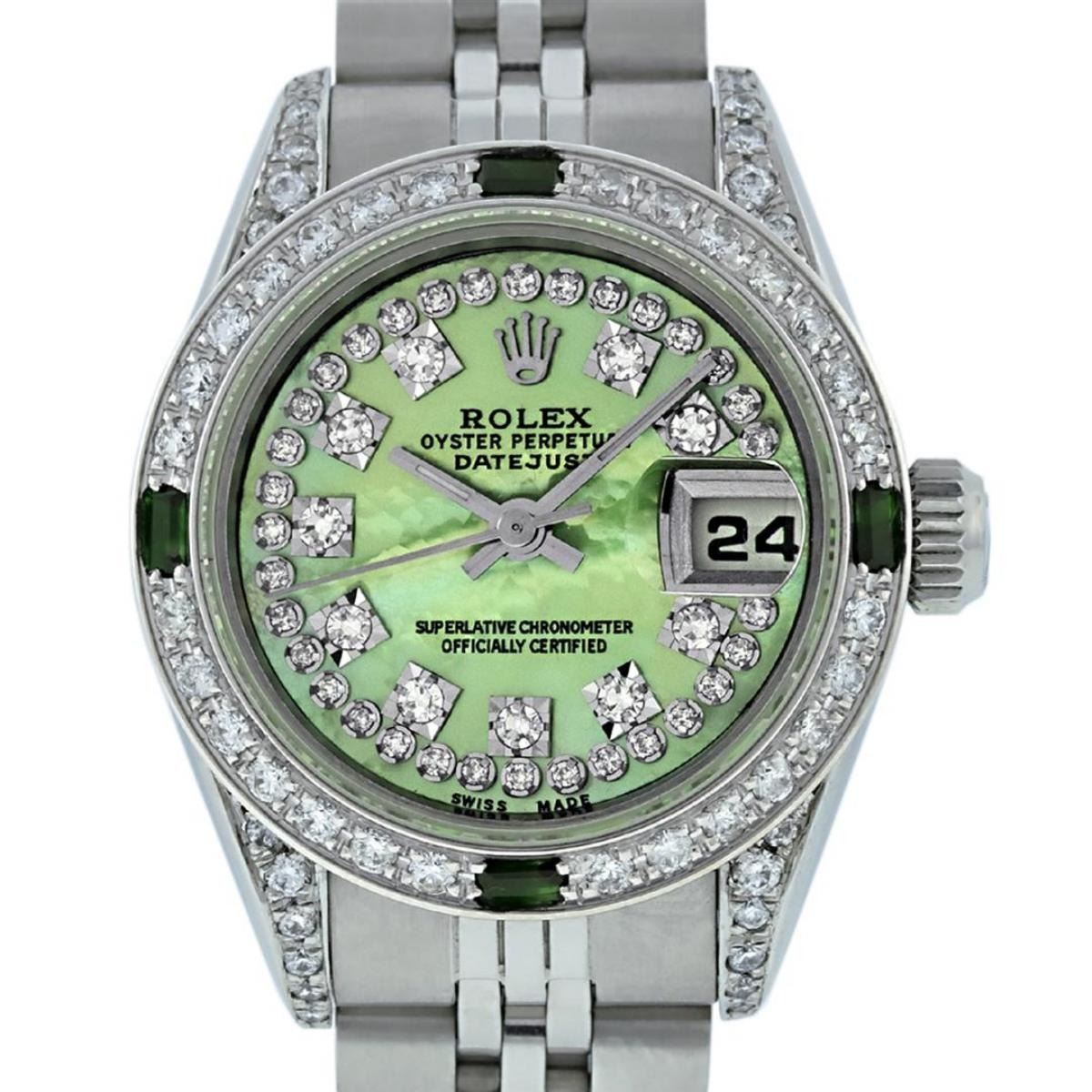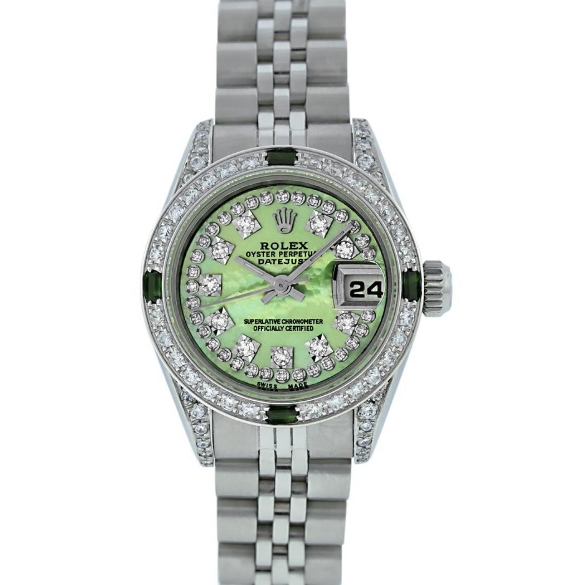 One Quickset Ladies Stainless Steel Rolex Datejust Polished Bright with Satin Finish, Serviced & Electronically Tested, Stainless Steel Case: 26mm, Stainless Steel Crown, Custom Diamond Lugs: 24 Diamonds On Lugs, Clarity: SI-VS, Color: G to H. Custom Bezel: New 18K White Gold Diamond + Emerald Beadset Diamond Bezel, Stone Count: 28 Diamonds + 4 Emeralds, Total Weight .70 Carat, Clarity: SI-VS, Color: G to H. Custom Crystal: New Scratch Resistant Synthetic Sapphire Cyclops Lens. Custom Hands: New Luminescent Hands. Movement: Automatic Winding Movement Caliber 2235. Custom Dial: Refinished Single Cut Green Mother Of Pearl String Diamond Dial, 43 Diamonds in Dial G To H In Color, Clarity: VS. Date Window: 3 O'Clock Position Date Display, Model: Quickset Datejust. Condition: G-6 Extra Fine. Bracelet: Stainless Steel Jubilee Band. Bright Polish & Satin Finish. 6.0 Inch Length, Adjustable. Standard Clasp, With Rolex Logo. This Watch Has Been Serviced Time Tested And Is In Excellent Condition It Is Free Of All Scratches And Dents.