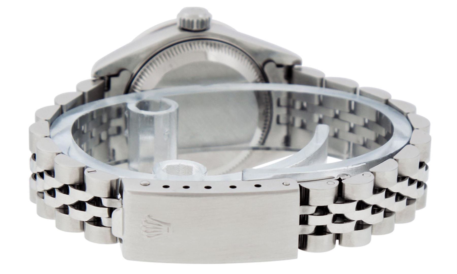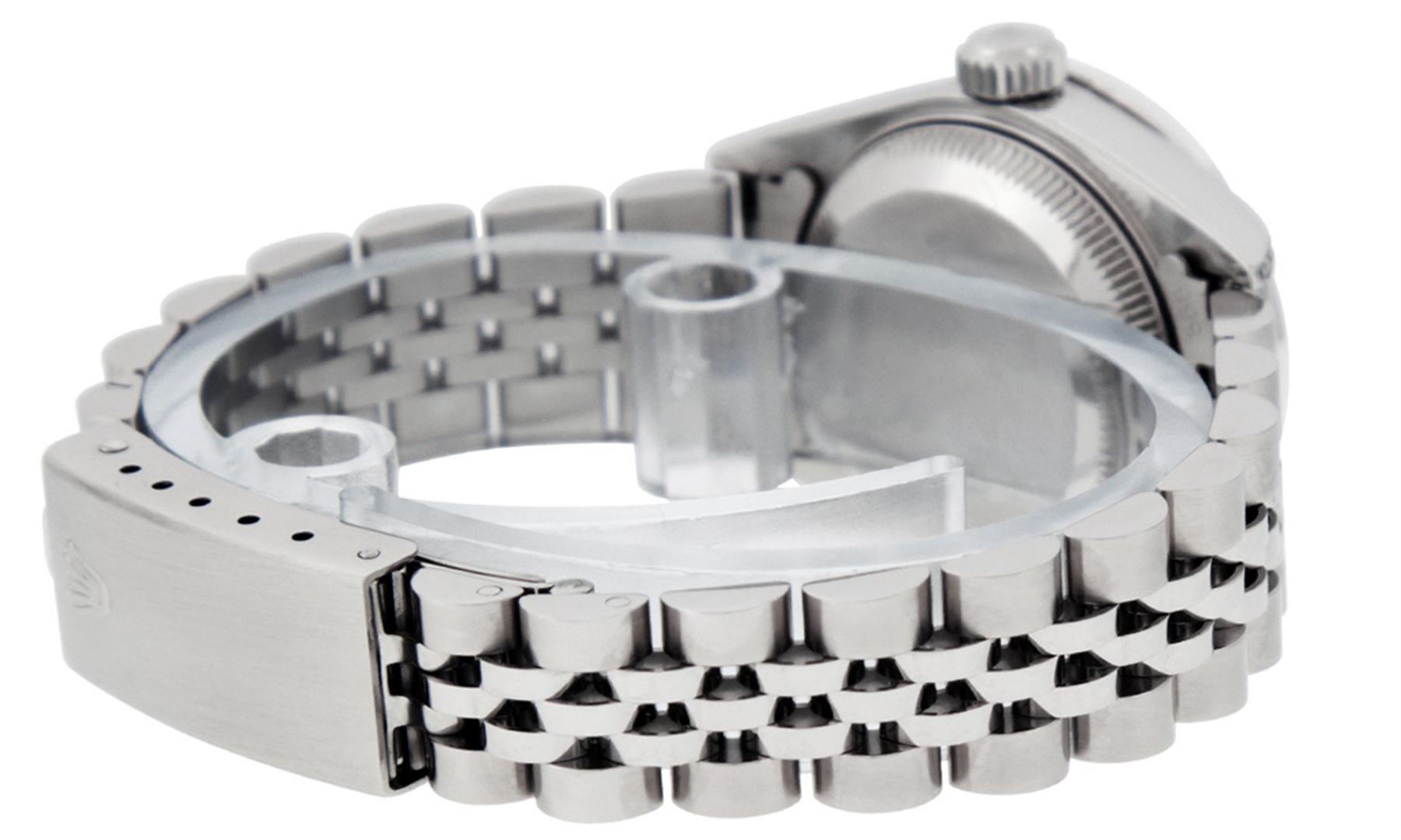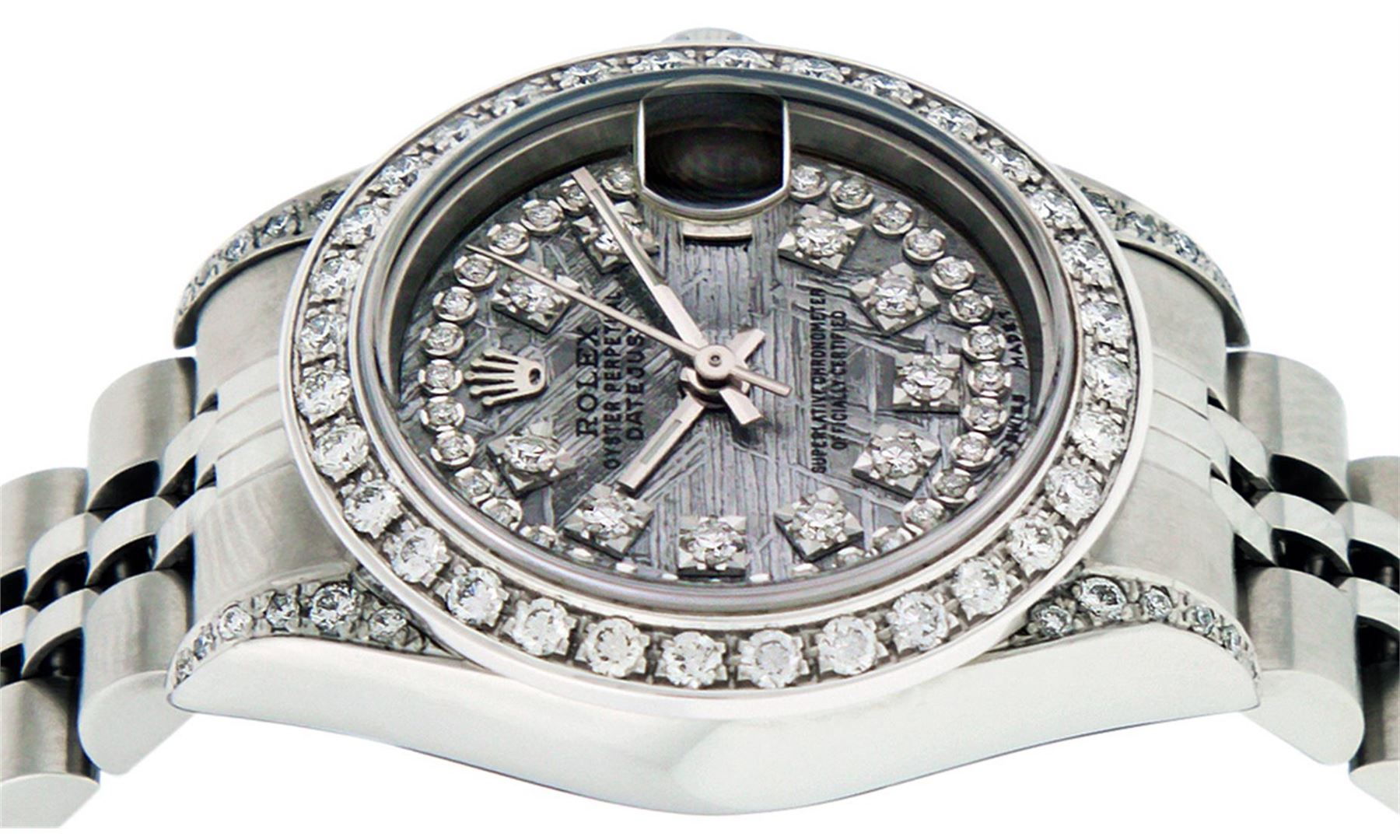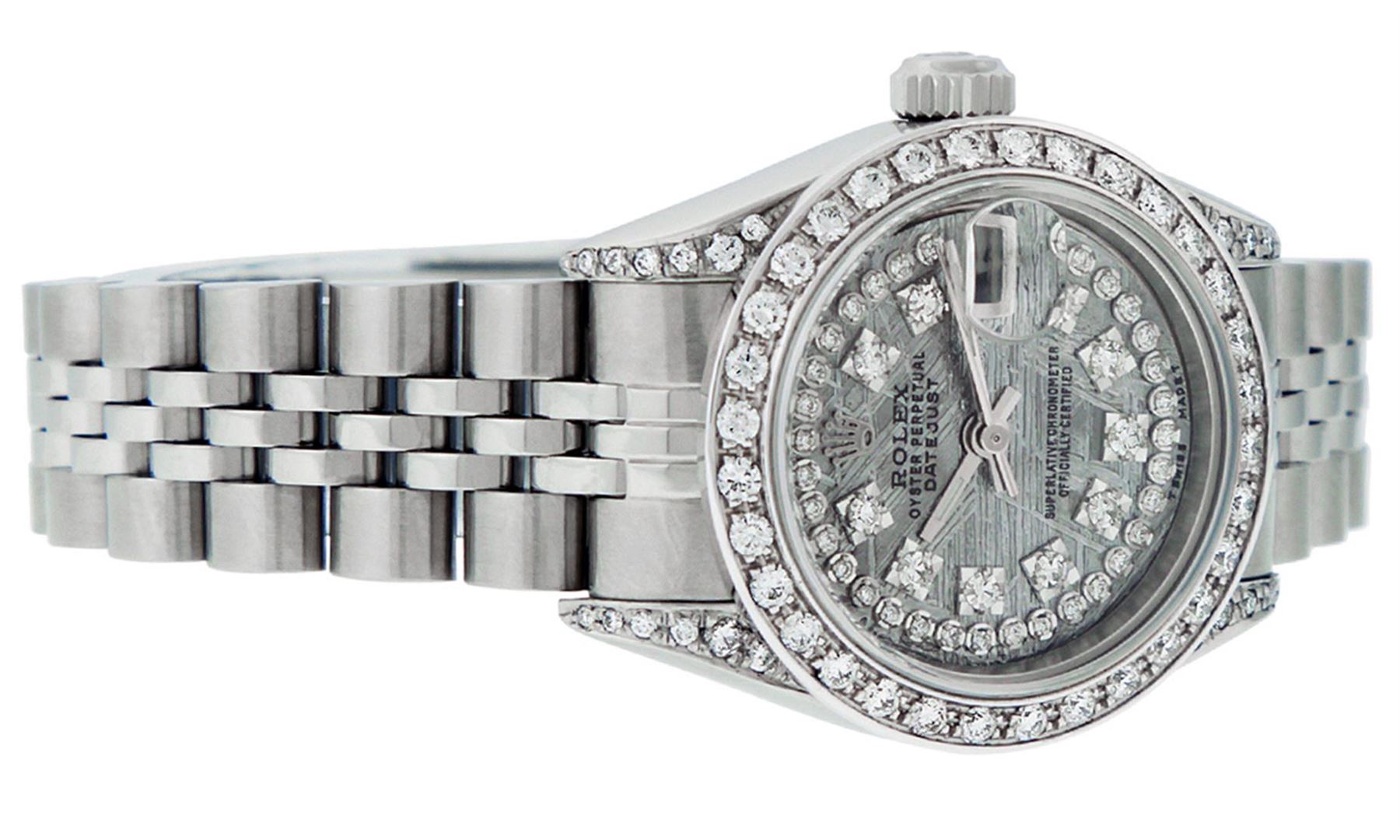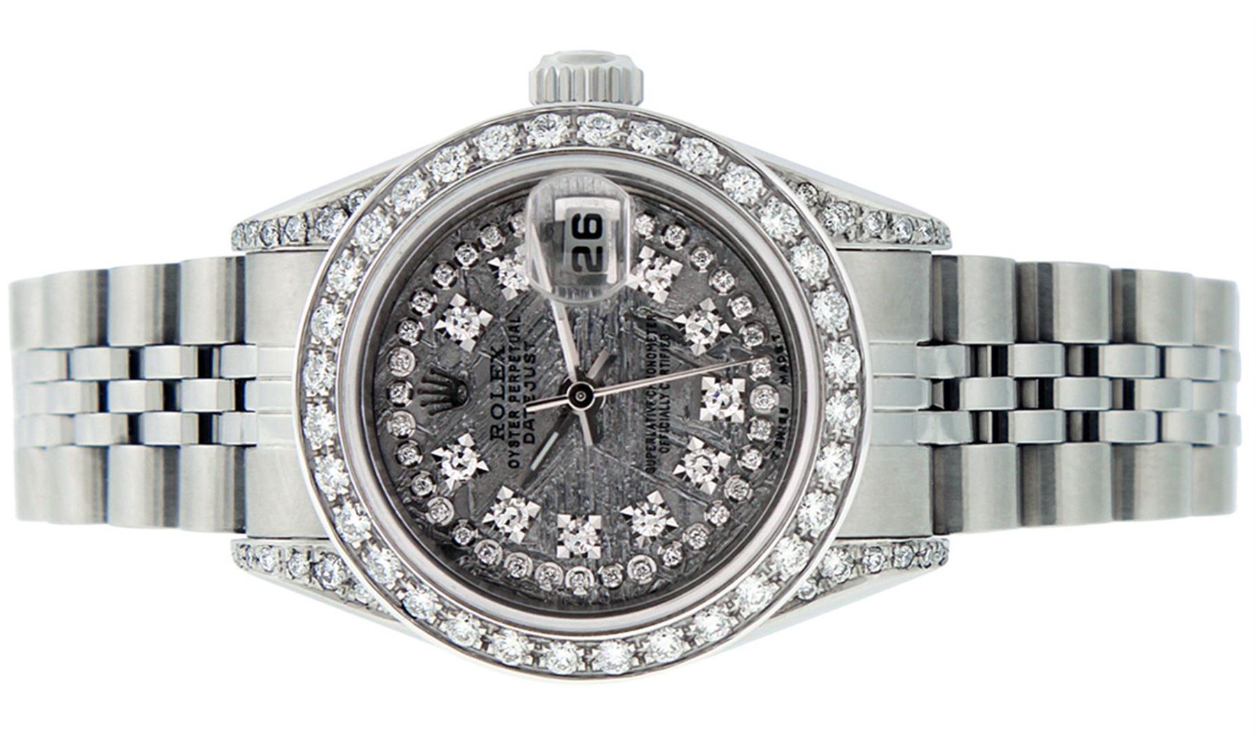 One Quickset Ladies Stainless Steel Rolex Datejust Polished Bright with Satin Finish, Serviced & Electronically Tested, Stainless Steel Case: 26mm, Stainless Steel Crown, Custom Diamond Lugs: 24 Diamonds On Lugs, Clarity: SI-VS, Color: G to H. Custom Bezel: New Stainless Steel Beadset Diamond Bezel, Stone Count: 39 Diamonds On Bezel, Total Weight .70 Carat, Clarity: SI-VS, Color: G to H. Custom Crystal: New Scratch Resistant Synthetic Sapphire Cyclops Lens. Custom Hands: New Luminescent Hands. Movement: Automatic Winding Movement. Custom Dial: Refinished Single Cut Meteorite String Diamond Dial, 43 Diamonds in Dial G To H In Color, Clarity: VS. Date Window: 3 O'Clock Position Date Display, Model: Sapphire Quickset Datejust 2230. Condition: G-6 Extra Fine. Bracelet: Stainless Steel Jubilee Band. Bright Polish & Satin Finish. 6.0 Inch Length, Adjustable. Standard Clasp, With Rolex Logo. This Watch Has Been Serviced Time Tested And Is In Excellent Condition It Is Free Of All Scratches And Dents.