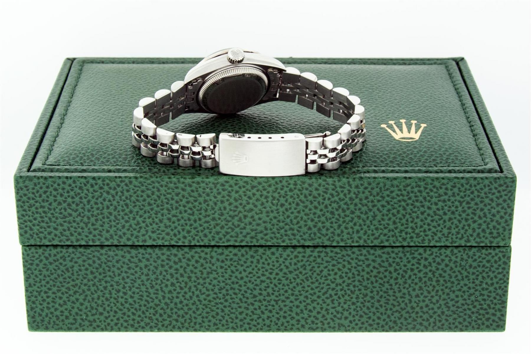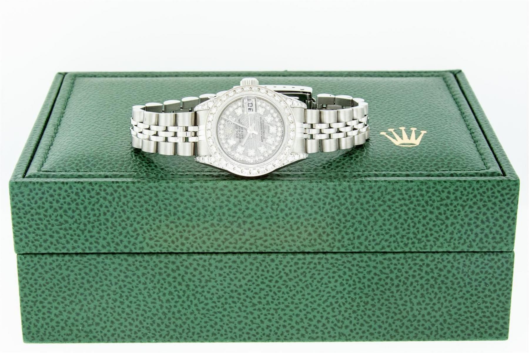 One Quickset Ladies Stainless Steel Rolex Datejust Polished Bright with Satin Finish, Serviced & Electronically Tested, Stainless Steel Case: 26mm, Stainless Steel Crown, Custom Diamond Lugs: 24 Diamonds On Lugs, Clarity: SI-VS, Color: G to H. Custom Bezel: New Stainless Steel Beadset Diamond Bezel, Stone Count: 39 Diamonds On Bezel, Total Weight .70 Carat, Clarity: SI-VS, Color: G to H. Custom Crystal: New Scratch Resistant Synthetic Sapphire Cyclops Lens. Custom Hands: New Luminescent Hands. Movement: Automatic Winding Movement. Custom Dial: Refinished Single Cut Meteorite String Diamond Dial, 43 Diamonds in Dial G To H In Color, Clarity: VS. Date Window: 3 O'Clock Position Date Display, Model: 79174 Quickset Datejust. Condition: G-6 Extra Fine. Bracelet: Stainless Steel Jubilee Band. Bright Polish & Satin Finish. 6.0 Inch Length, Adjustable. Standard Clasp, With Rolex Logo. This Watch Has Been Serviced Time Tested And Is In Excellent Condition It Is Free Of All Scratches And Dents.