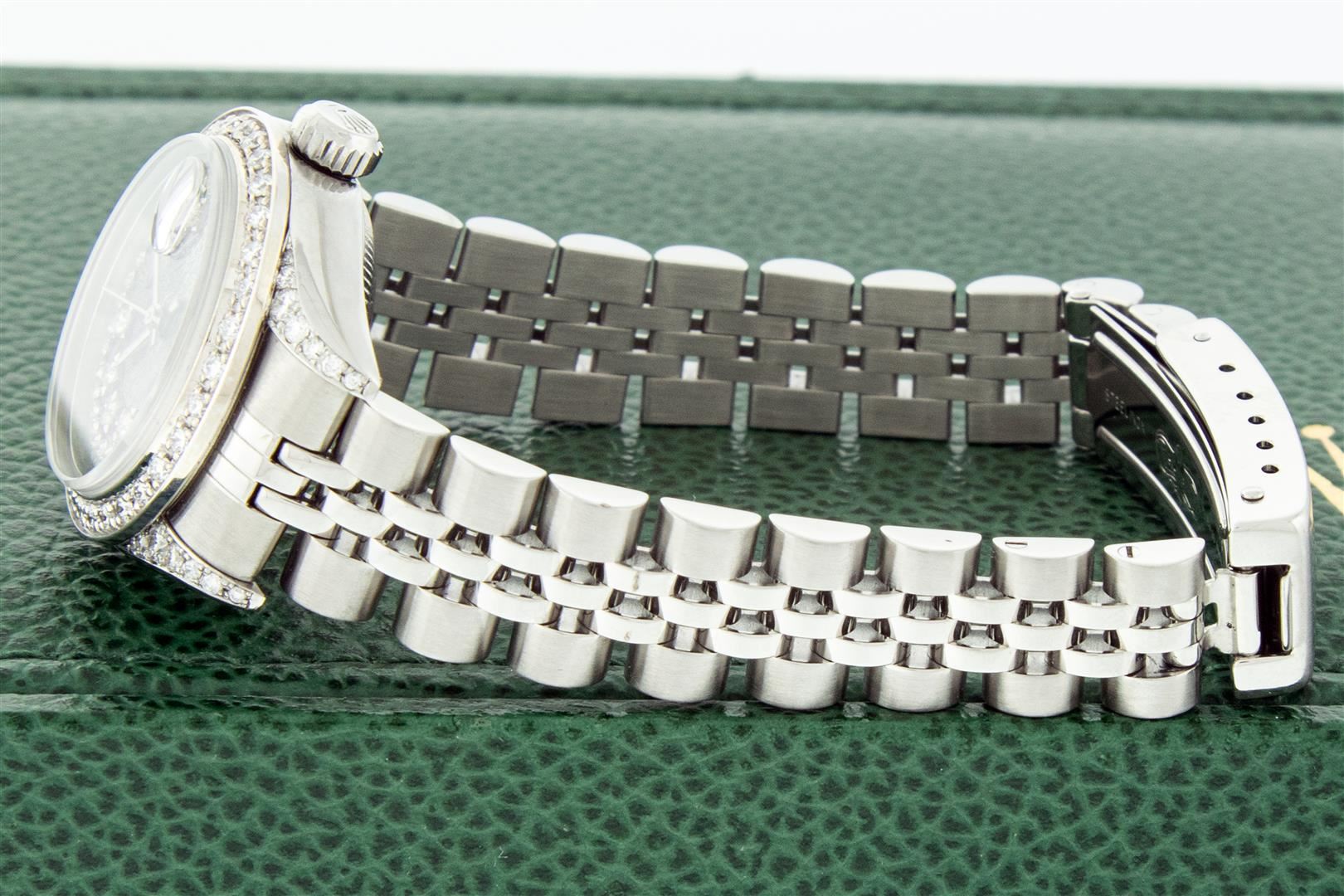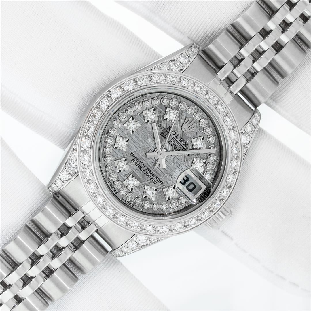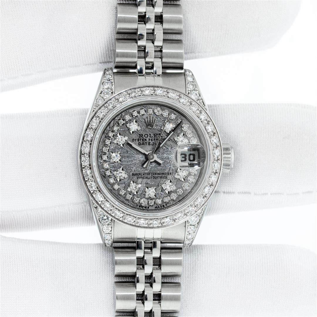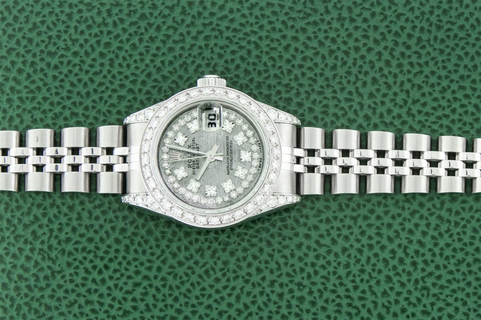 One Quickset Ladies Stainless Steel Rolex Datejust Polished Bright with Satin Finish, Serviced & Electronically Tested, Stainless Steel Case: 26mm, Stainless Steel Crown, Custom Diamond Lugs: 24 Diamonds On Lugs, Clarity: SI-VS, Color: G to H. Custom Bezel: New Stainless Steel Beadset Diamond Bezel, Stone Count: 39 Diamonds On Bezel, Total Weight .70 Carat, Clarity: SI-VS, Color: G to H. Custom Crystal: New Scratch Resistant Synthetic Sapphire Cyclops Lens. Custom Hands: New Luminescent Hands. Movement: Automatic Winding Movement. Custom Dial: Refinished Single Cut Meteorite String Diamond Dial, 43 Diamonds in Dial G To H In Color, Clarity: VS. Date Window: 3 O'Clock Position Date Display, Model: 79174 Quickset Datejust. Condition: G-6 Extra Fine. Bracelet: Stainless Steel Jubilee Band. Bright Polish & Satin Finish. 6.0 Inch Length, Adjustable. Standard Clasp, With Rolex Logo. This Watch Has Been Serviced Time Tested And Is In Excellent Condition It Is Free Of All Scratches And Dents.
