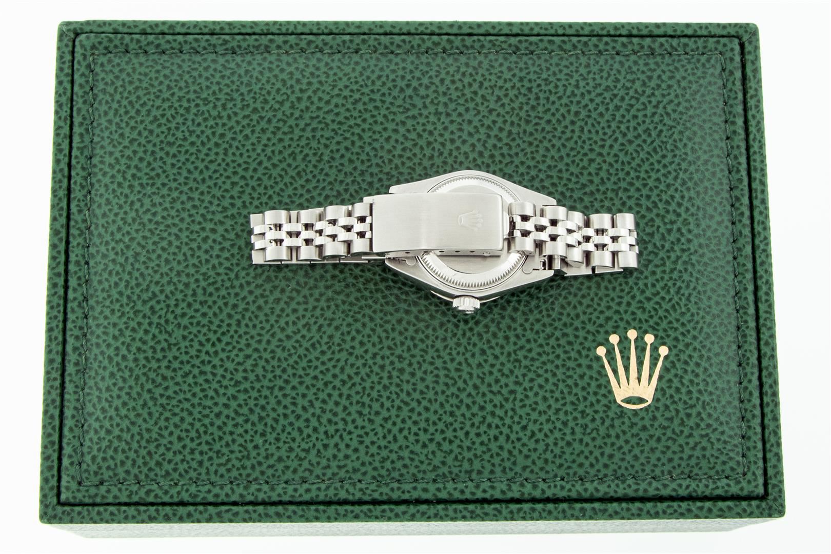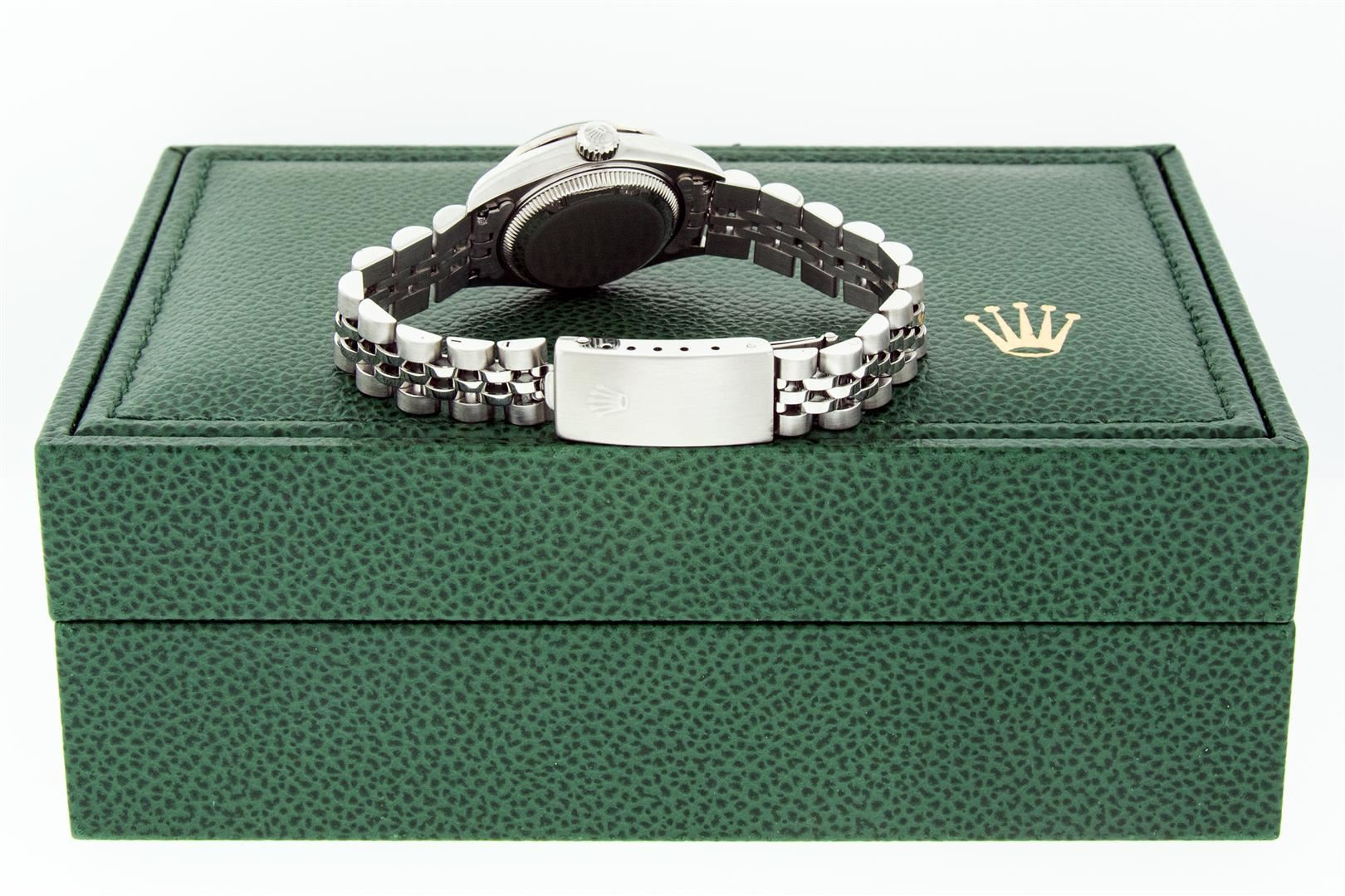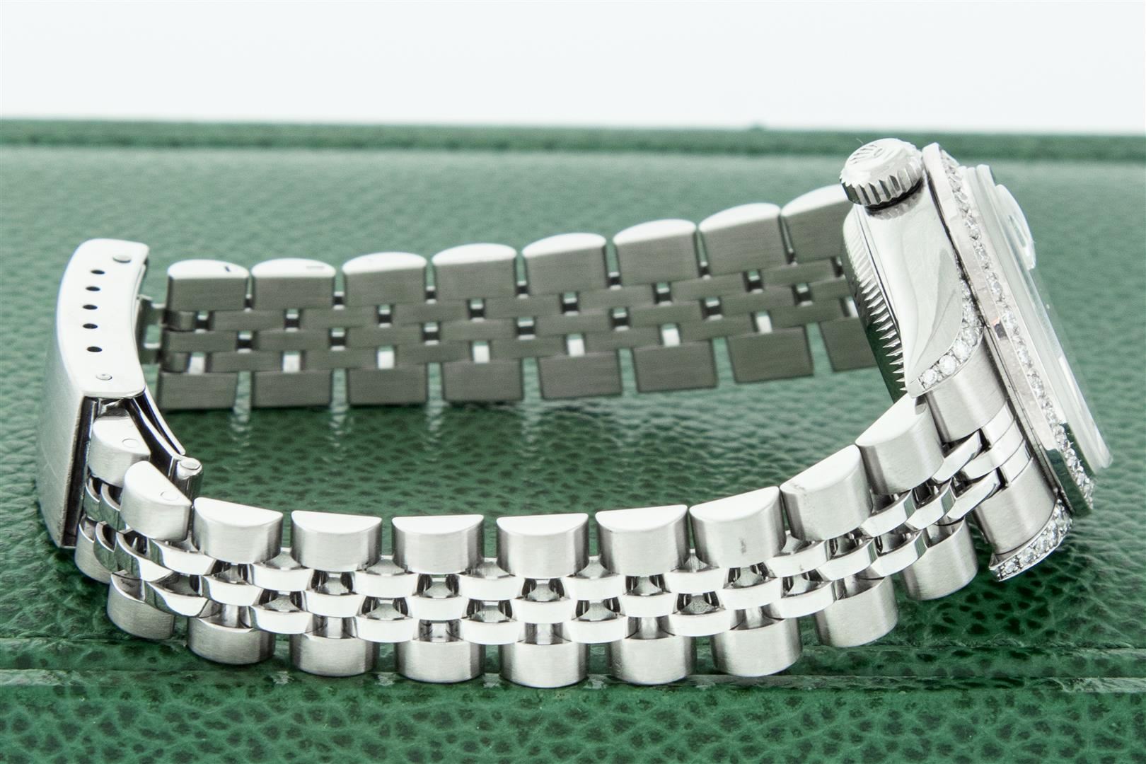 One Quickset Ladies Stainless Steel Rolex Datejust Polished Bright with Satin Finish, Serviced & Electronically Tested, Stainless Steel Case: 26mm, Stainless Steel Crown, Custom Diamond Lugs: 24 Diamonds On Lugs, Clarity: SI-VS, Color: G to H. Custom Bezel: New Stainless Steel Beadset Diamond Bezel, Stone Count: 39 Diamonds On Bezel, Total Weight .70 Carat, Clarity: SI-VS, Color: G to H. Custom Crystal: New Scratch Resistant Synthetic Sapphire Cyclops Lens. Custom Hands: New Luminescent Hands. Movement: Automatic Winding Movement. Custom Dial: Refinished Single Cut Meteorite String Diamond Dial, 43 Diamonds in Dial G To H In Color, Clarity: VS. Date Window: 3 O'Clock Position Date Display, Model: 79174 Quickset Datejust. Condition: G-6 Extra Fine. Bracelet: Stainless Steel Jubilee Band. Bright Polish & Satin Finish. 6.0 Inch Length, Adjustable. Standard Clasp, With Rolex Logo. This Watch Has Been Serviced Time Tested And Is In Excellent Condition It Is Free Of All Scratches And Dents.