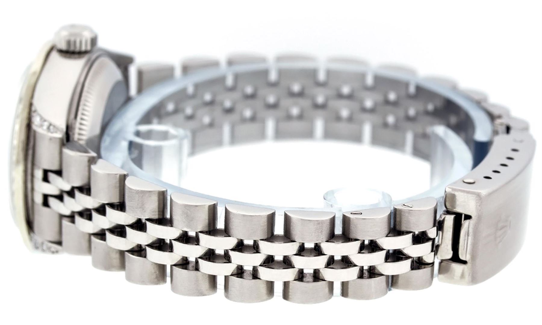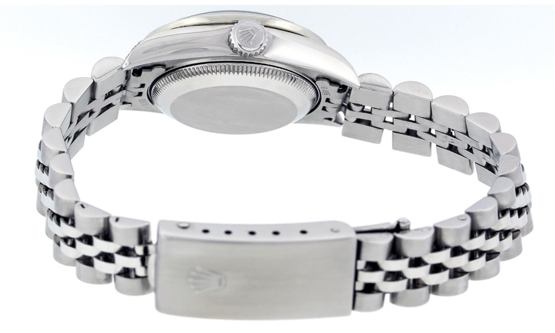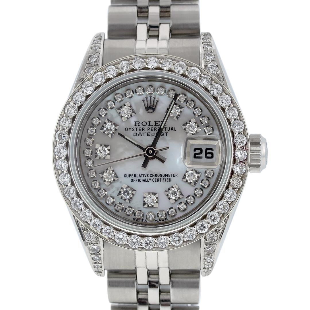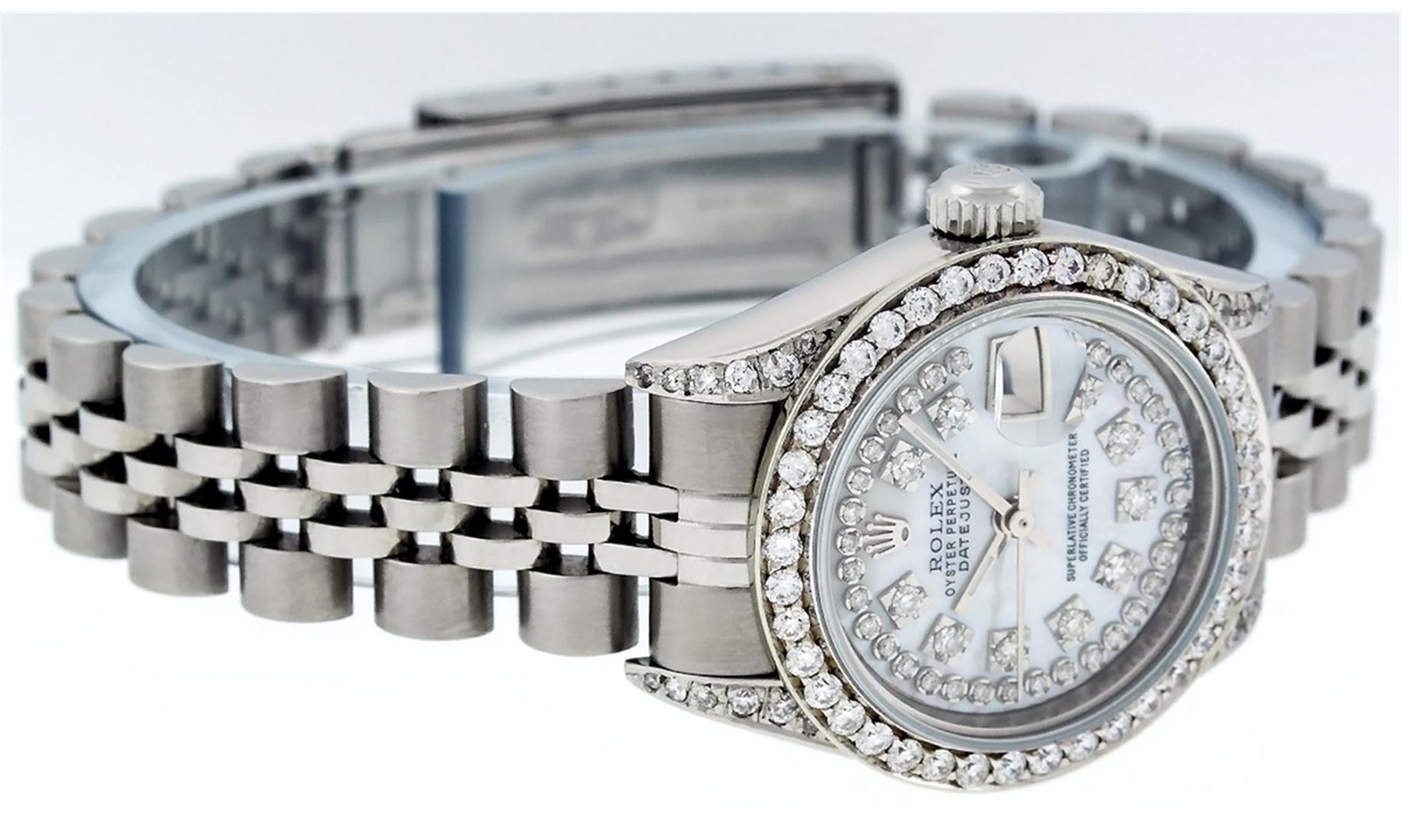 One Quickset Ladies Stainless Steel Rolex Datejust Polished Bright with Satin Finish, Serviced & Electronically Tested, Stainless Steel Case: 26mm, Stainless Steel Crown, Custom Diamond Lugs: 24 Diamonds On Lugs, Clarity: SI-VS, Color: G to H. Custom Bezel: New Stainless Steel Beadset Diamond Bezel, Stone Count: 39 Diamonds On Bezel, Total Weight .70 Carat, Clarity: SI-VS, Color: G to H. Custom Crystal: New Scratch Resistant Synthetic Sapphire Cyclops Lens. Custom Hands: New Luminescent Hands. Movement: Automatic Winding Movement Caliber 2235. Custom Dial: Refinished Single Cut Mother Of Pearl String Diamond Dial, 43 Diamonds in Dial G To H In Color, Clarity: VS. Date Window: 3 O'Clock Position Date Display, Model: 79160 Quickset Datejust. Condition: G-6 Extra Fine. Bracelet: Stainless Steel Jubilee Band. Bright Polish & Satin Finish. 6.0 Inch Length, Adjustable. Standard Clasp, With Rolex Logo. This Watch Has Been Serviced Time Tested And Is In Excellent Condition It Is Free Of All Scratches And Dents. This Watch Comes With A Rolex Box.