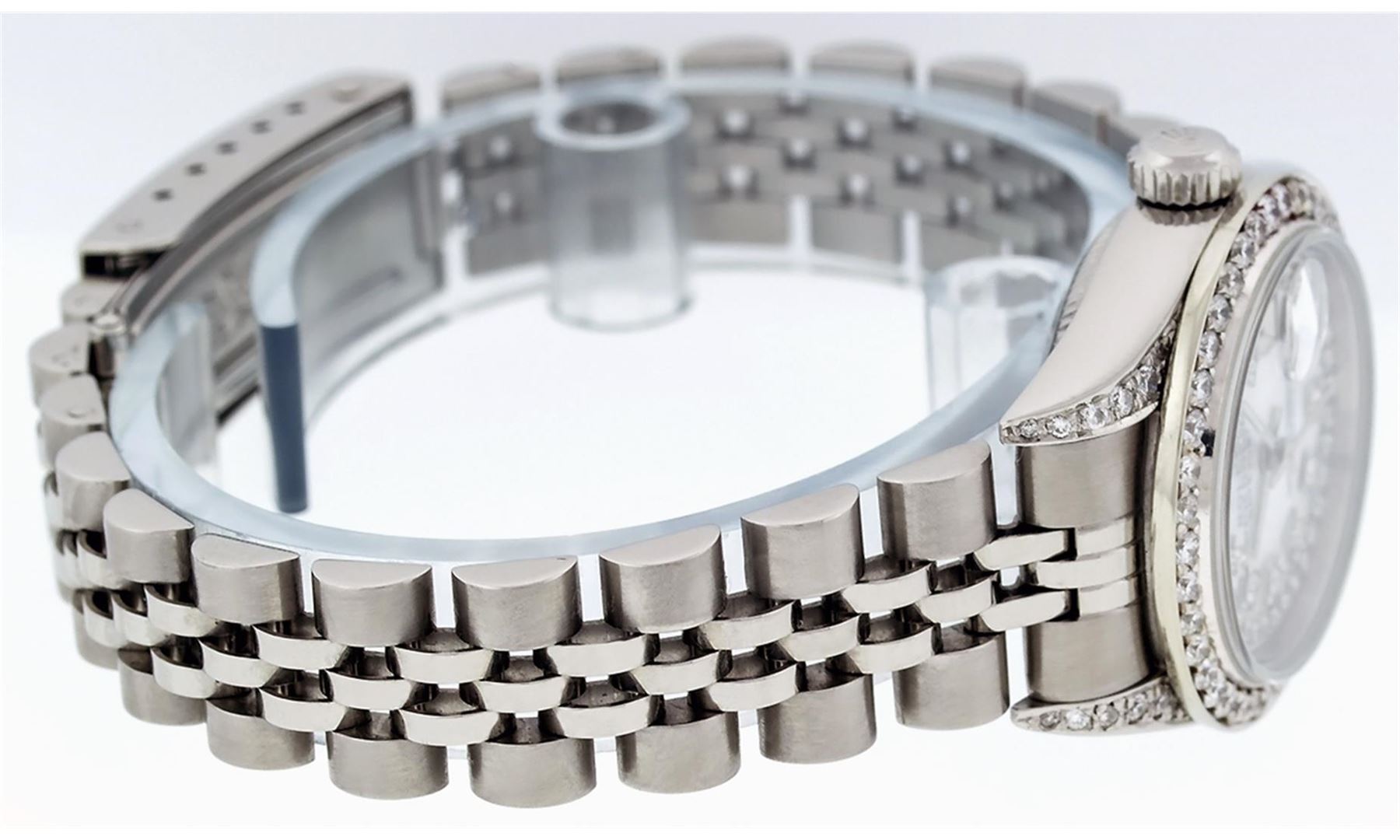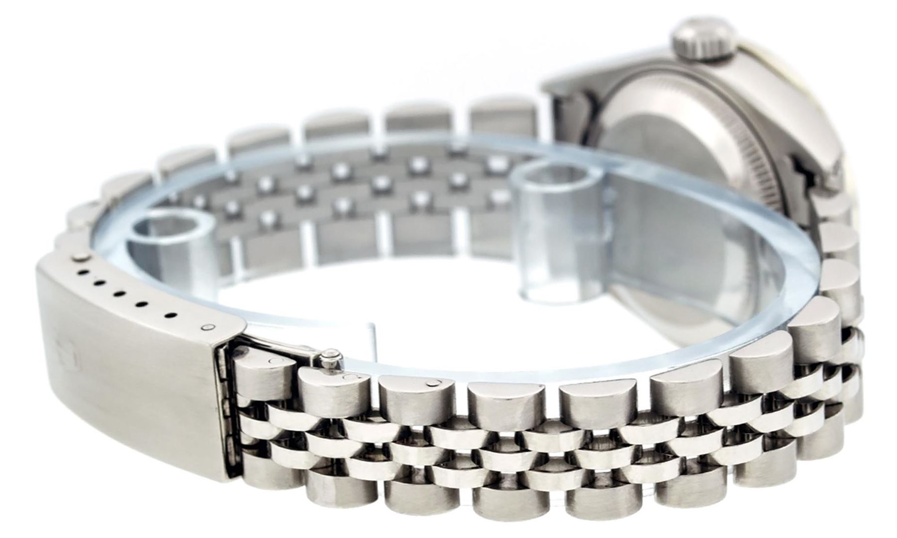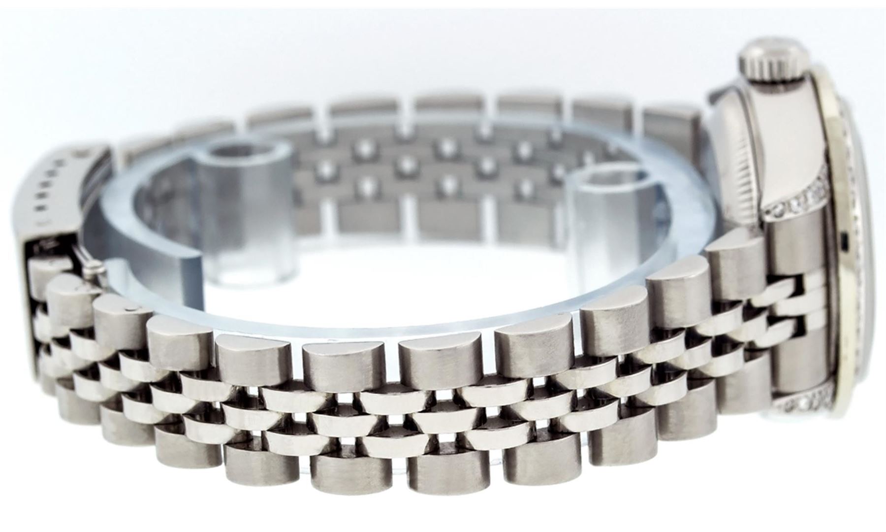 One Quickset Ladies Stainless Steel Rolex Datejust Polished Bright with Satin Finish, Serviced & Electronically Tested, Stainless Steel Case: 26mm, Stainless Steel Crown, Custom Diamond Lugs: 24 Diamonds On Lugs, Clarity: SI-VS, Color: G to H. Custom Bezel: New Stainless Steel Beadset Diamond Bezel, Stone Count: 39 Diamonds On Bezel, Total Weight .70 Carat, Clarity: SI-VS, Color: G to H. Custom Crystal: New Scratch Resistant Synthetic Sapphire Cyclops Lens. Custom Hands: New Luminescent Hands. Movement: Automatic Winding Movement Caliber 2235. Custom Dial: Refinished Single Cut Mother Of Pearl String Diamond Dial, 43 Diamonds in Dial G To H In Color, Clarity: VS. Date Window: 3 O'Clock Position Date Display, Model: 79160 Quickset Datejust. Condition: G-6 Extra Fine. Bracelet: Stainless Steel Jubilee Band. Bright Polish & Satin Finish. 6.0 Inch Length, Adjustable. Standard Clasp, With Rolex Logo. This Watch Has Been Serviced Time Tested And Is In Excellent Condition It Is Free Of All Scratches And Dents. This Watch Comes With A Rolex Box.