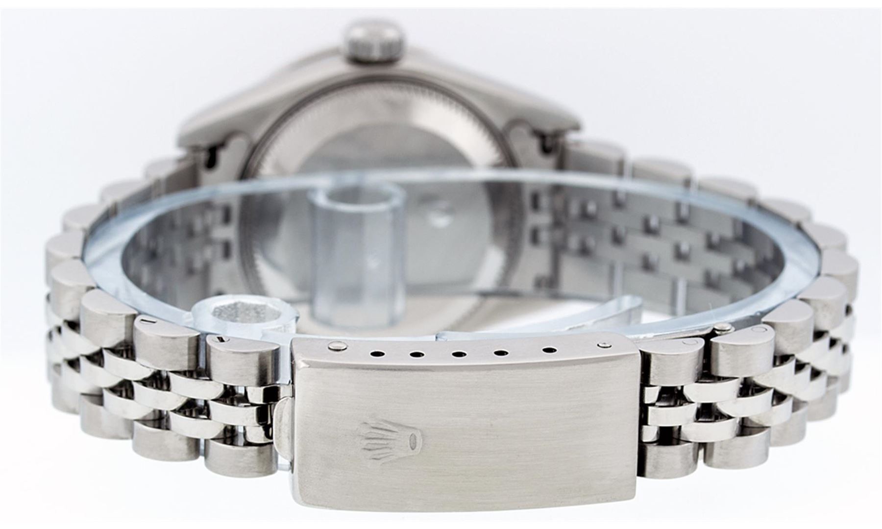 One Quickset Ladies Stainless Steel Rolex Datejust Polished Bright with Satin Finish, Serviced & Electronically Tested, Stainless Steel Case: 26mm, Stainless Steel Crown, Custom Diamond Lugs: 24 Diamonds On Lugs, Clarity: SI-VS, Color: G to H. Custom Bezel: New 18K White Gold Beadset Diamond Bezel, Stone Count: 32 Diamonds On Bezel, Total Bezel Weight .70 Carat, Clarity: SI-VS, Color: G to H. Custom Crystal: New Scratch Resistant Synthetic Sapphire Cyclops Lens. Custom Hands: New Luminescent Hands. Movement: Automatic Winding Movement . Custom Dial: Refinished Single Cut Orange String Diamond Dial, 43 Diamonds in Dial G To H In Color, Clarity: VS. Date Window: 3 O'Clock Position Date Display, Model: 79174 Quickjset Datejust. Condition: G-6 Extra Fine. Bracelet: Stainless Steel Jubilee Band. Bright Polish & Satin Finish. 6.0 Inch Length, Adjustable. Standard Clasp, With Rolex Logo. This Watch Has Been Serviced Time Tested And Is In Excellent Condition It Is Free Of All Scratches And Dents. This Watch Comes With A Rolex Box.