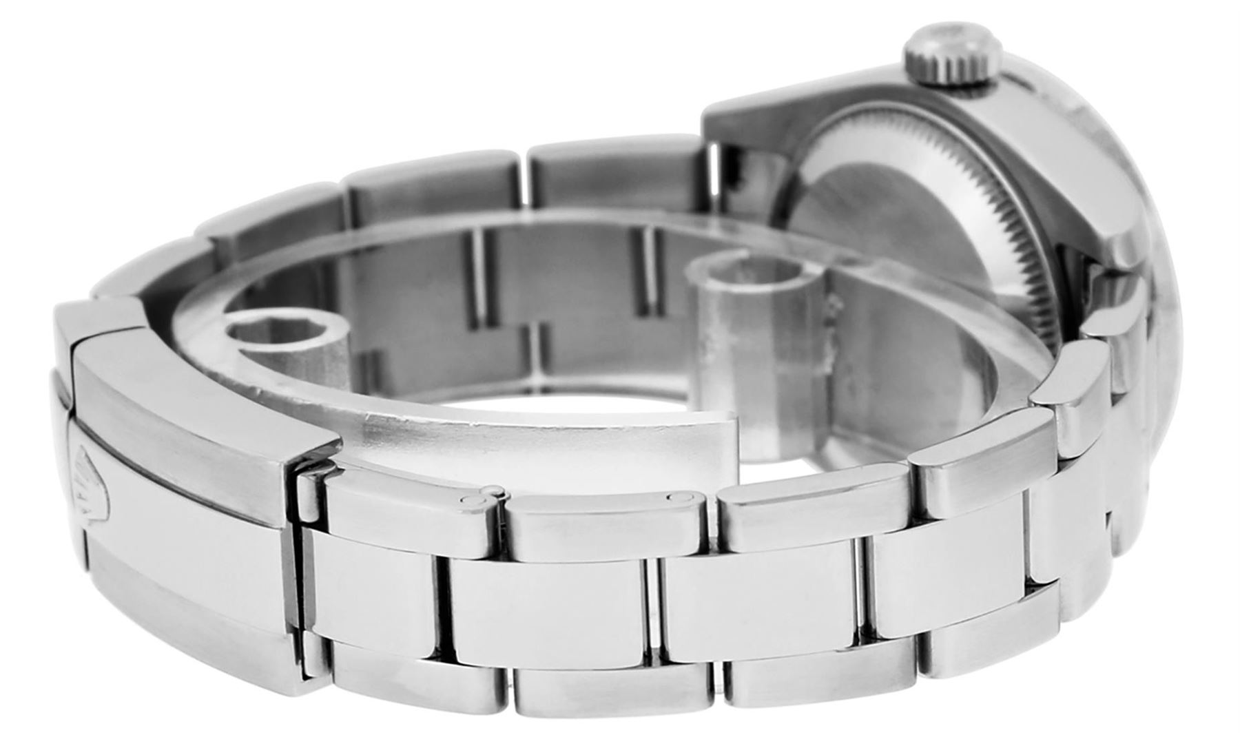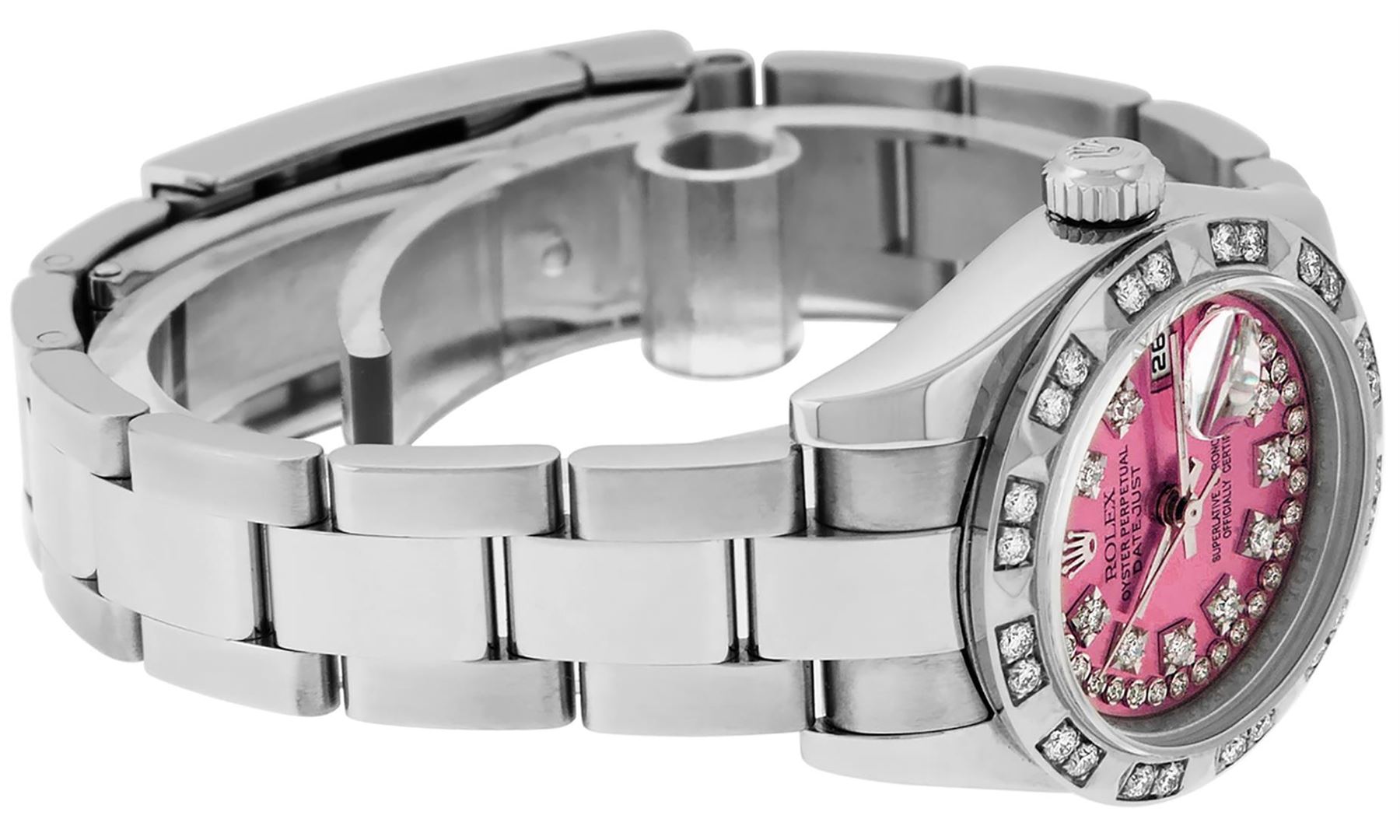 One Quickset Ladies Stainless Steel Rolex Datejust Polished Bright with Satin Finish, Serviced & Electronically Tested, Stainless Steel Case: 26mm, Stainless Steel Crown, Custom Bezel: New 18K White Gold Pyramid Diamond Bezel, Stone Count: 24 Diamonds On Bezel, Total Weight .50 Carat, Clarity: SI-VS, Color: G to H. Custom Crystal: New Scratch Resistant Synthetic Sapphire Cyclops Lens. Custom Hands: New Luminescent Hands. Movement: Automatic Winding Movement Caliber 2235. Custom Dial: Refinished Single Cut Pink String Diamond Dial, 43 Diamonds in Dial, G To H In Color, Clarity: VS. Date Window: 3 O'Clock Position Date Display, Model: 179160 Quickjset Datejust. Condition: G-6 Extra Fine. Bracelet: Stainless Steel Oyster Band. Bright Polish & Satin Finish. 6.0 Inch Length, Adjustable. Standard Clasp, With Rolex Logo. This Watch Has Been Serviced Time Tested And Is In Excellent Condition It Is Free Of All Scratches And Dents.