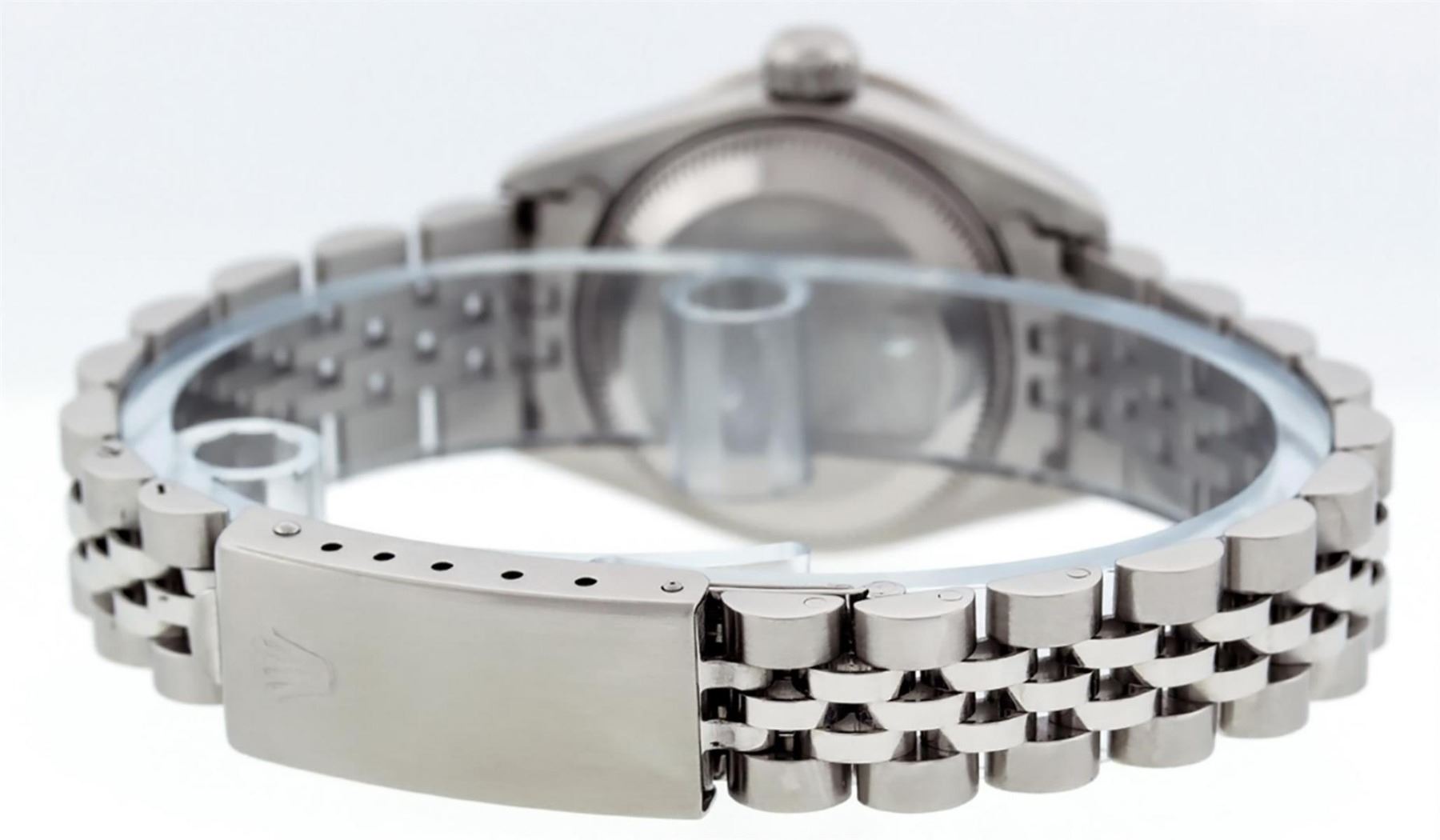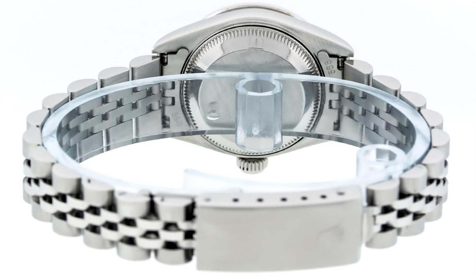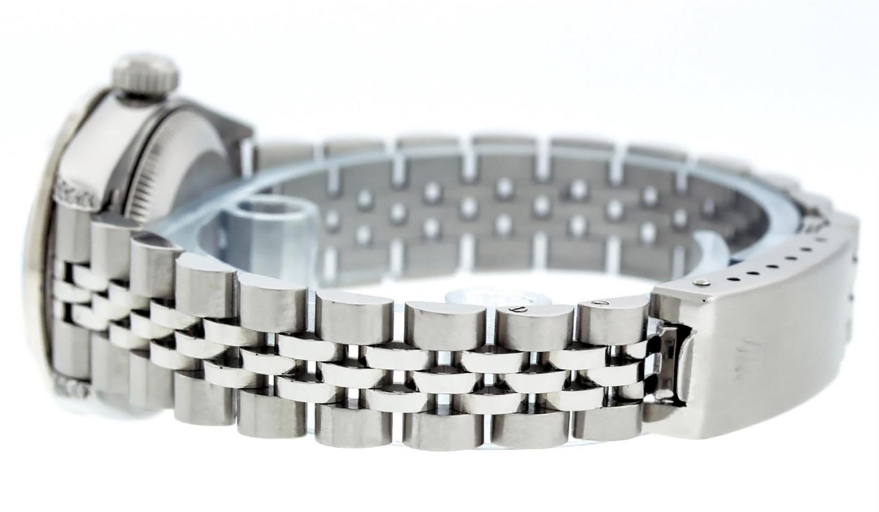 One Quickset Ladies Stainless Steel Rolex Datejust Polished Bright with Satin Finish, Serviced & Electronically Tested, Stainless Steel Case: 26mm, Stainless Steel Crown, Custom Diamond Lugs: 24 Diamonds On Lugs, Clarity: SI-VS, Color: G to H. Custom Bezel: New 18K White Gold Diamond + Sapphire Beadset Diamond Bezel, Stone Count: 28 Diamonds + 4 Sapphires, Total Weight .70 Carat, Clarity: SI-VS, Color: G to H. Custom Crystal: New Scratch Resistant Synthetic Sapphire Cyclops Lens. Custom Hands: New Luminescent Hands. Movement: Automatic Winding Movement Caliber 2235. Custom Dial: Refinished Single Cut Purple Mother Of Pearl String Diamond Dial, 43 Diamonds in Dial G To H In Color, Clarity: VS. Date Window: 3 O'Clock Position Date Display, Model: Quickset Datejust. Condition: G-6 Extra Fine. Bracelet: Stainless Steel Jubilee Band. Bright Polish & Satin Finish. 6.0 Inch Length, Adjustable. Standard Clasp, With Rolex Logo. This Watch Has Been Serviced Time Tested And Is In Excellent Condition It Is Free Of All Scratches And Dents.