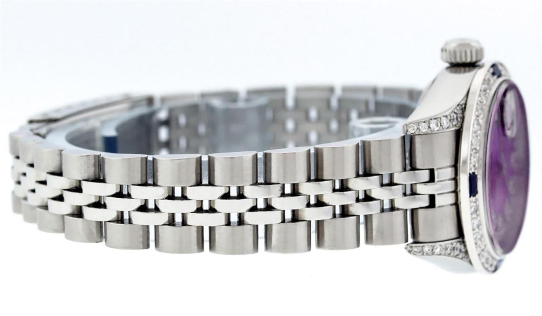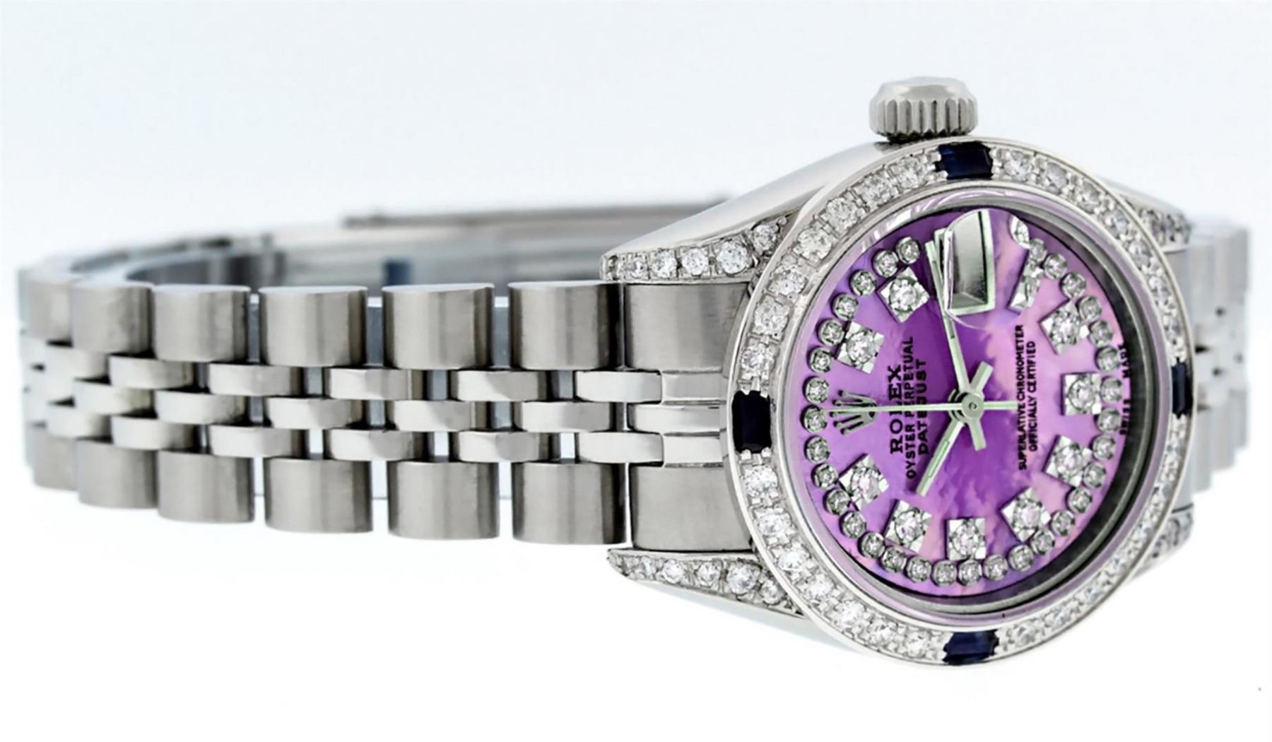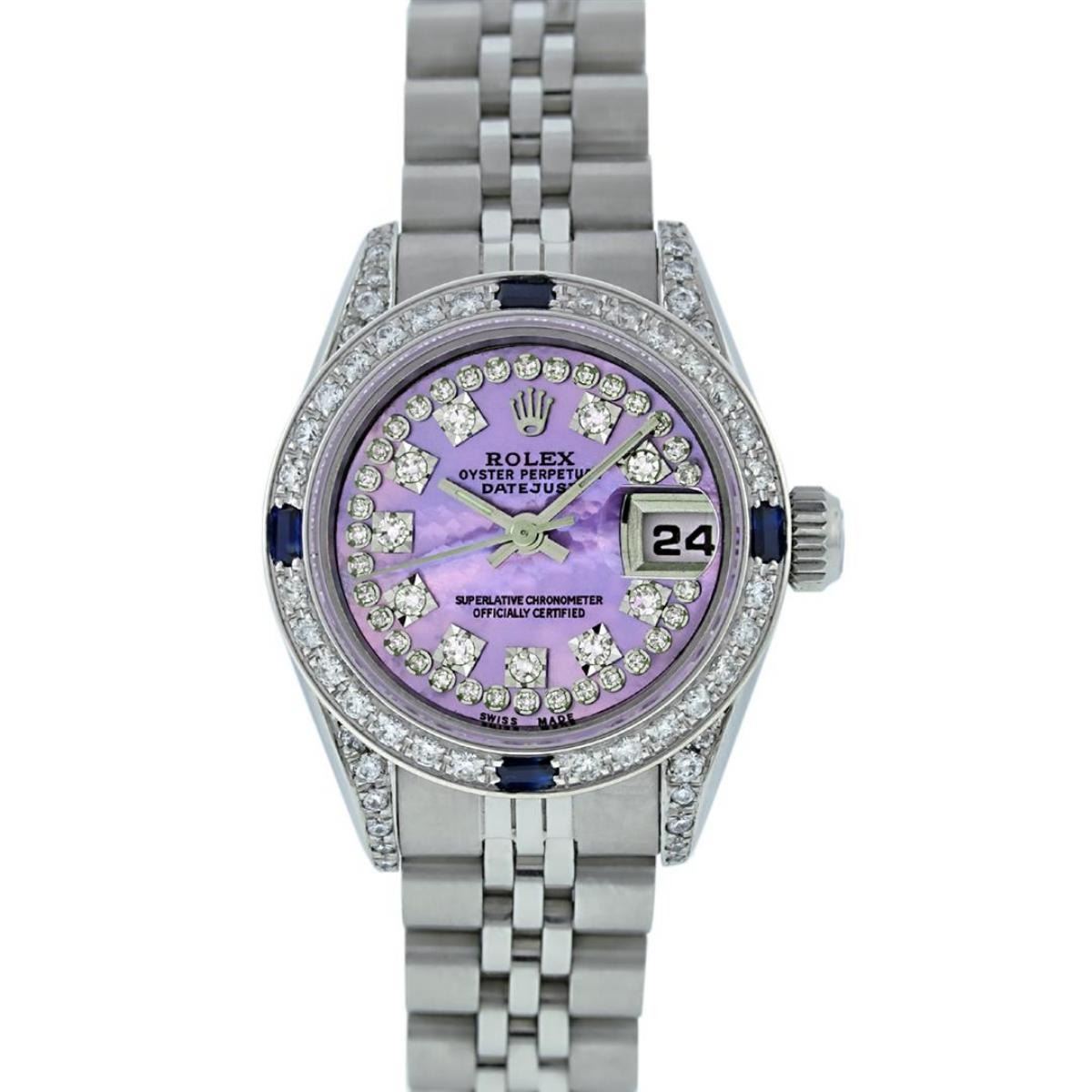 One Quickset Ladies Stainless Steel Rolex Datejust Polished Bright with Satin Finish, Serviced & Electronically Tested, Stainless Steel Case: 26mm, Stainless Steel Crown, Custom Diamond Lugs: 24 Diamonds On Lugs, Clarity: SI-VS, Color: G to H. Custom Bezel: New 18K White Gold Diamond + Sapphire Beadset Diamond Bezel, Stone Count: 28 Diamonds + 4 Sapphires, Total Weight .70 Carat, Clarity: SI-VS, Color: G to H. Custom Crystal: New Scratch Resistant Synthetic Sapphire Cyclops Lens. Custom Hands: New Luminescent Hands. Movement: Automatic Winding Movement Caliber 2235. Custom Dial: Refinished Single Cut Purple Mother Of Pearl String Diamond Dial, 43 Diamonds in Dial G To H In Color, Clarity: VS. Date Window: 3 O'Clock Position Date Display, Model: Quickset Datejust. Condition: G-6 Extra Fine. Bracelet: Stainless Steel Jubilee Band. Bright Polish & Satin Finish. 6.0 Inch Length, Adjustable. Standard Clasp, With Rolex Logo. This Watch Has Been Serviced Time Tested And Is In Excellent Condition It Is Free Of All Scratches And Dents.