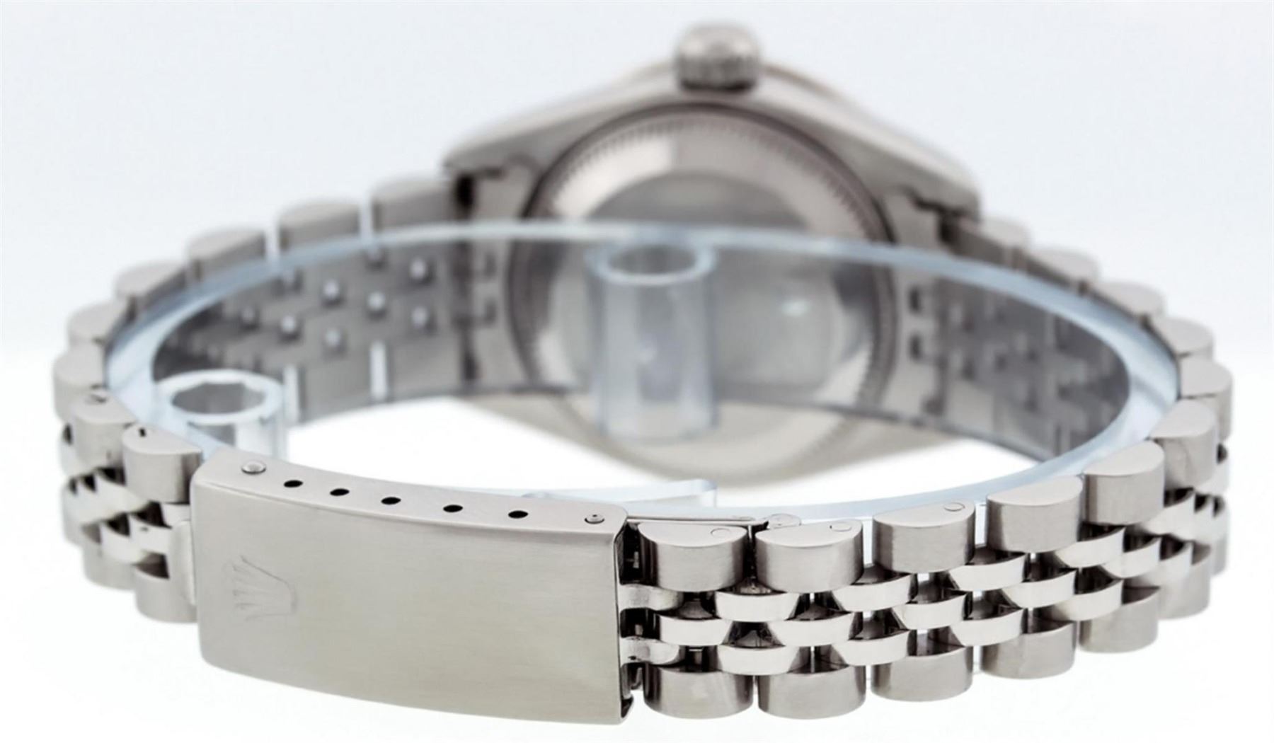 One Quickset Ladies Stainless Steel Rolex Datejust Polished Bright with Satin Finish, Serviced & Electronically Tested, Stainless Steel Case: 26mm, Stainless Steel Crown, Custom Diamond Lugs: 24 Diamonds On Lugs, Clarity: SI-VS, Color: G to H. Custom Bezel: New 18K White Gold Diamond + Ruby Beadset Diamond Bezel, Stone Count: 28 Diamonds + 4 Rubies, Total Weight .70 Carat, Clarity: SI-VS, Color: G to H. Custom Crystal: New Scratch Resistant Synthetic Sapphire Cyclops Lens. Custom Hands: New Luminescent Hands. Movement: Automatic Winding Movement Caliber 2235. Custom Dial: Refinished Single Cut Purple Mother Of Pearl String Diamond Dial, 43 Diamonds in Dial G To H In Color, Clarity: VS. Date Window: 3 O'Clock Position Date Display, Model: Quickset Datejust. Condition: G-6 Extra Fine. Bracelet: Stainless Steel Jubilee Band. Bright Polish & Satin Finish. 6.0 Inch Length, Adjustable. Standard Clasp, With Rolex Logo. This Watch Has Been Serviced Time Tested And Is In Excellent Condition It Is Free Of All Scratches And Dents.