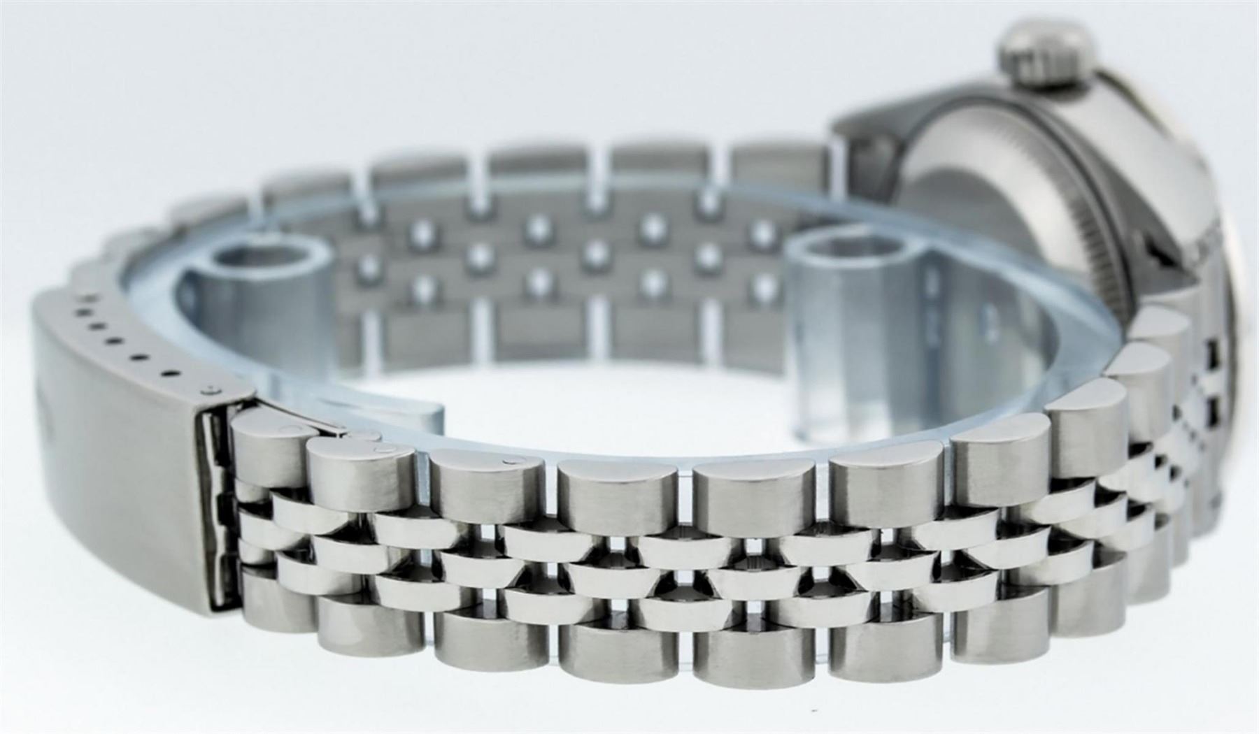 One Quickset Ladies Stainless Steel Rolex Datejust Polished Bright with Satin Finish, Serviced & Electronically Tested, Stainless Steel Case: 26mm, Stainless Steel Crown, Custom Diamond Lugs: 24 Diamonds On Lugs, Clarity: SI-VS, Color: G to H. Custom Bezel: New 18K White Gold Diamond + Ruby Beadset Diamond Bezel, Stone Count: 28 Diamonds + 4 Rubies, Total Weight .70 Carat, Clarity: SI-VS, Color: G to H. Custom Crystal: New Scratch Resistant Synthetic Sapphire Cyclops Lens. Custom Hands: New Luminescent Hands. Movement: Automatic Winding Movement . Custom Dial: Refinished Single Cut Purple Mother Of Pearl String Diamond Dial, 43 Diamonds in Dial G To H In Color, Clarity: VS. Date Window: 3 O'Clock Position Date Display, Model: Quickset Datejust. Condition: G-6 Extra Fine. Bracelet: Stainless Steel Jubilee Band. Bright Polish & Satin Finish. 6.0 Inch Length, Adjustable. Standard Clasp, With Rolex Logo. This Watch Has Been Serviced Time Tested And Is In Excellent Condition It Is Free Of All Scratches And Dents.