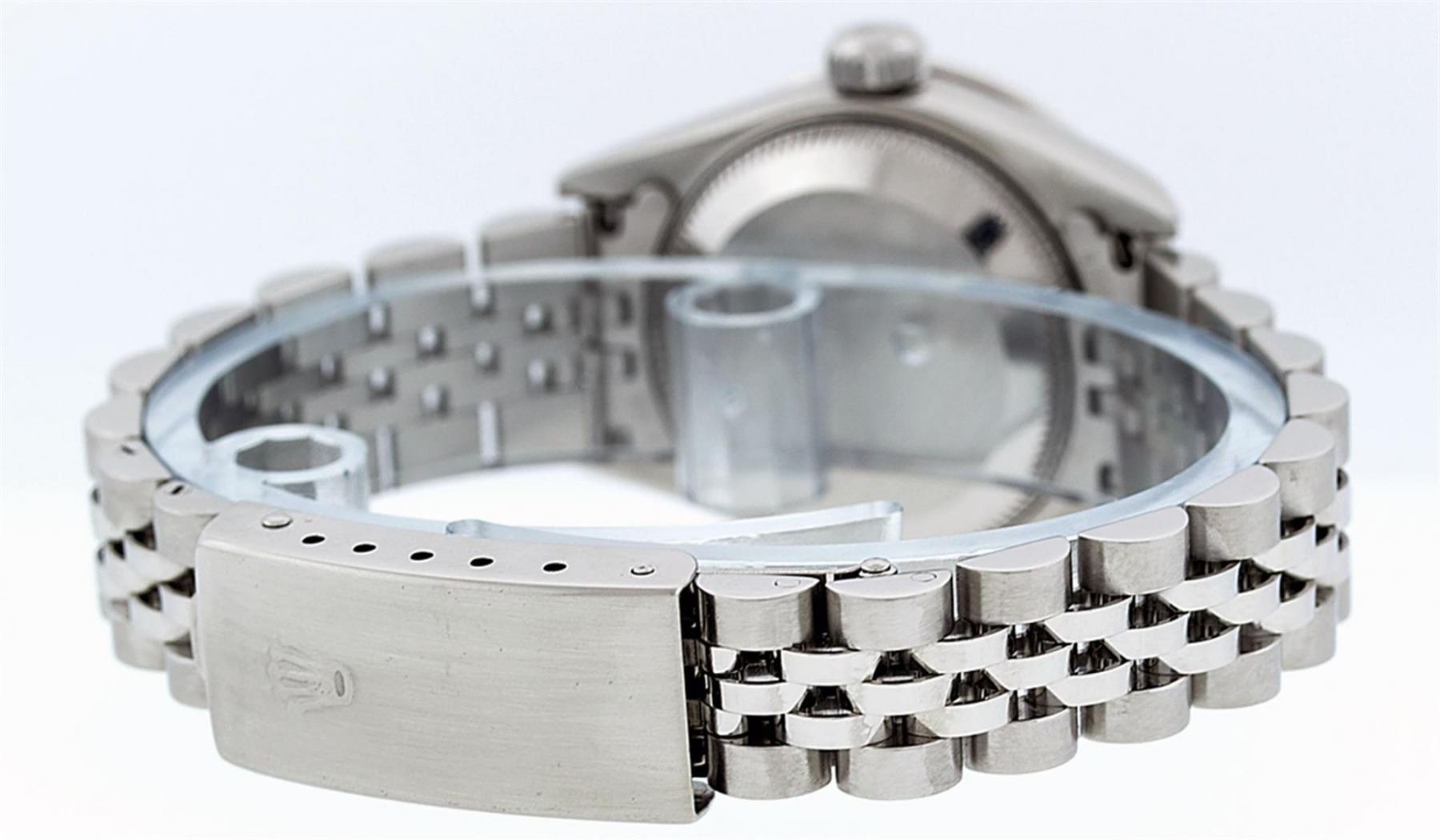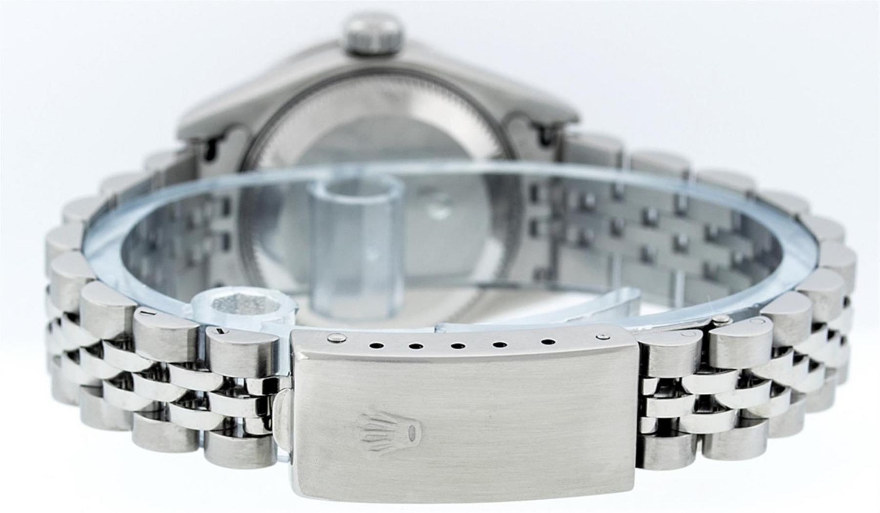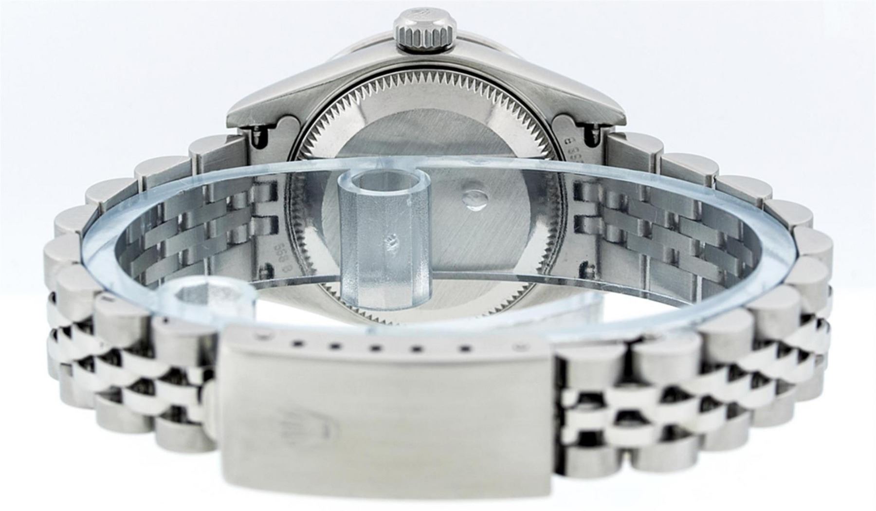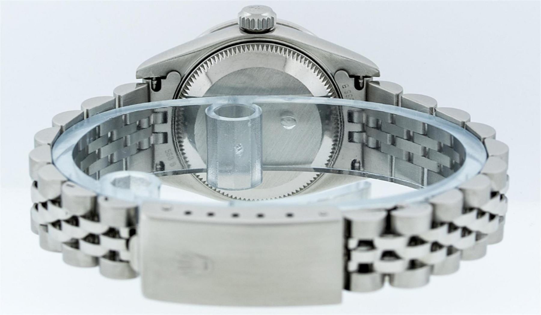 One Quickset Ladies Stainless Steel Rolex Datejust Polished Bright with Satin Finish, Serviced & Electronically Tested, Stainless Steel Case: 26mm, Stainless Steel Crown, Custom Diamond Lugs: 24 Diamonds On Lugs, Clarity: SI-VS, Color: G to H. Custom Bezel: New 18K White Gold Beadset Diamond Bezel, Stone Count: 32 Diamonds On Bezel, Total Bezel Weight .70 Carat, Clarity: SI-VS, Color: G to H. Custom Crystal: New Scratch Resistant Synthetic Sapphire Cyclops Lens. Custom Hands: New Luminescent Hands. Movement: Automatic Winding Movement. Custom Dial: Refinished Single Cut Purple String Diamond Dial, 43 Diamonds in Dial, G To H In Color, Clarity: VS. Date Window: 3 O'Clock Position Date Display, Model: Quickjset Datejust. Condition: G-6 Extra Fine. Bracelet: Stainless Steel Jubilee Band. Bright Polish & Satin Finish. 6.0 Inch Length, Adjustable. Standard Clasp, With Rolex Logo. This Watch Has Been Serviced Time Tested And Is In Excellent Condition It Is Free Of All Scratches And Dents.