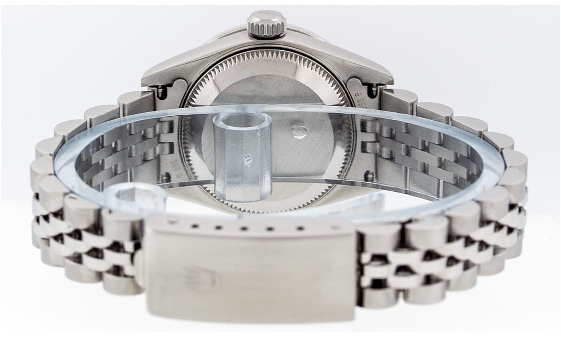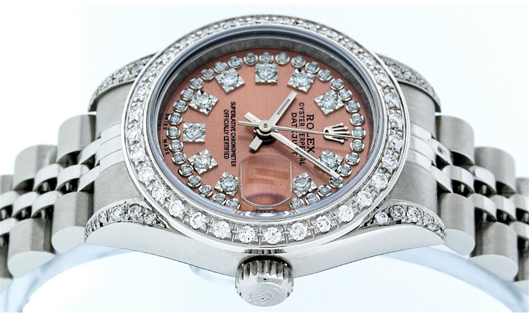 One Quickset Ladies Stainless Steel Rolex Datejust Polished Bright with Satin Finish, Serviced & Electronically Tested, Stainless Steel Case: 26mm, Stainless Steel Crown, Custom Diamond Lugs: 24 Diamonds On Lugs, Clarity: SI-VS, Color: G to H. Custom Bezel: New 18K White Gold Beadset Diamond Bezel, Stone Count: 32 Diamonds On Bezel, Total Weight .70 Carat, Clarity: SI-VS, Color: G to H. Custom Crystal: New Scratch Resistant Synthetic Sapphire Cyclops Lens. Custom Hands: New Luminescent Hands. Movement: Automatic Winding Movement Caliber 2235. Custom Dial: Refinished Single Cut Salmon String Diamond Dial, 43 Diamonds in Dial G To H In Color, Clarity: VS. Date Window: 3 O'Clock Position Date Display, Model: 79160 Quickset Datejust. Condition: G-6 Extra Fine. Bracelet: Stainless Steel Jubilee Band. Bright Polish & Satin Finish. 6.0 Inch Length, Adjustable. Standard Clasp, With Rolex Logo. This Watch Has Been Serviced Time Tested And Is In Excellent Condition It Is Free Of All Scratches And Dents. This Watch Comes With A Rolex Box.