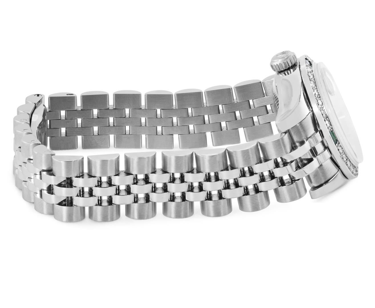 One Rolex Ladies Rolex Quickset Pre Owned Stainless Steel Datejust Wristwatch Polished Bright with Satin Finish, Serviced And Electronically Tested, Stainless Steel Case: 26mm, Stainless Steel Crown, Custom Bezel: New 18K White Gold Beadset Diamond And Emerald Bezel, Diamond + Stone Count: 28 Diamonds + 4 Emeralds. Crystal: Sapphire With Magnified Date Window. Hands: Non Luminescent Hands. Rolex Movement: 2235 Automatic Winding Movement 2235. Custom Dial: Custom Silver Dial With Added Diamond Hour Markers, Diamond Count: 10 Diamonds On Dial. Date Window: 3 O'Clock Position Date Display, Model: Quickset Datejust. Condition: G-6 Extra Fine. Rolex Bracelet: Stainless Steel Jubilee Band. Bright Polish And Satin Finish. 6.0 Inch Length, Adjustable. Hidden Clasp, With Rolex Logo. This Watch Has Been Serviced And Time Tested. It Is In Excellent Condition, Free Of All Scratches And Dents. This Watch Comes With A Rolex Box.