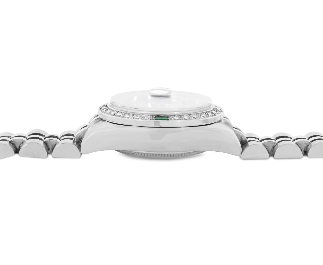 One Rolex Ladies Rolex Quickset Pre Owned Stainless Steel Datejust Wristwatch Polished Bright with Satin Finish, Serviced And Electronically Tested, Stainless Steel Case: 26mm, Stainless Steel Crown, Custom Bezel: New 18K White Gold Beadset Diamond And Emerald Bezel, Diamond + Stone Count: 28 Diamonds + 4 Emeralds. Crystal: Sapphire With Magnified Date Window. Hands: Non Luminescent Hands. Rolex Movement: 2235 Automatic Winding Movement 2235. Custom Dial: Custom Silver Dial With Added Diamond Hour Markers, Diamond Count: 10 Diamonds On Dial. Date Window: 3 O'Clock Position Date Display, Model: Quickset Datejust. Condition: G-6 Extra Fine. Rolex Bracelet: Stainless Steel Jubilee Band. Bright Polish And Satin Finish. 6.0 Inch Length, Adjustable. Hidden Clasp, With Rolex Logo. This Watch Has Been Serviced And Time Tested. It Is In Excellent Condition, Free Of All Scratches And Dents. This Watch Comes With A Rolex Box.