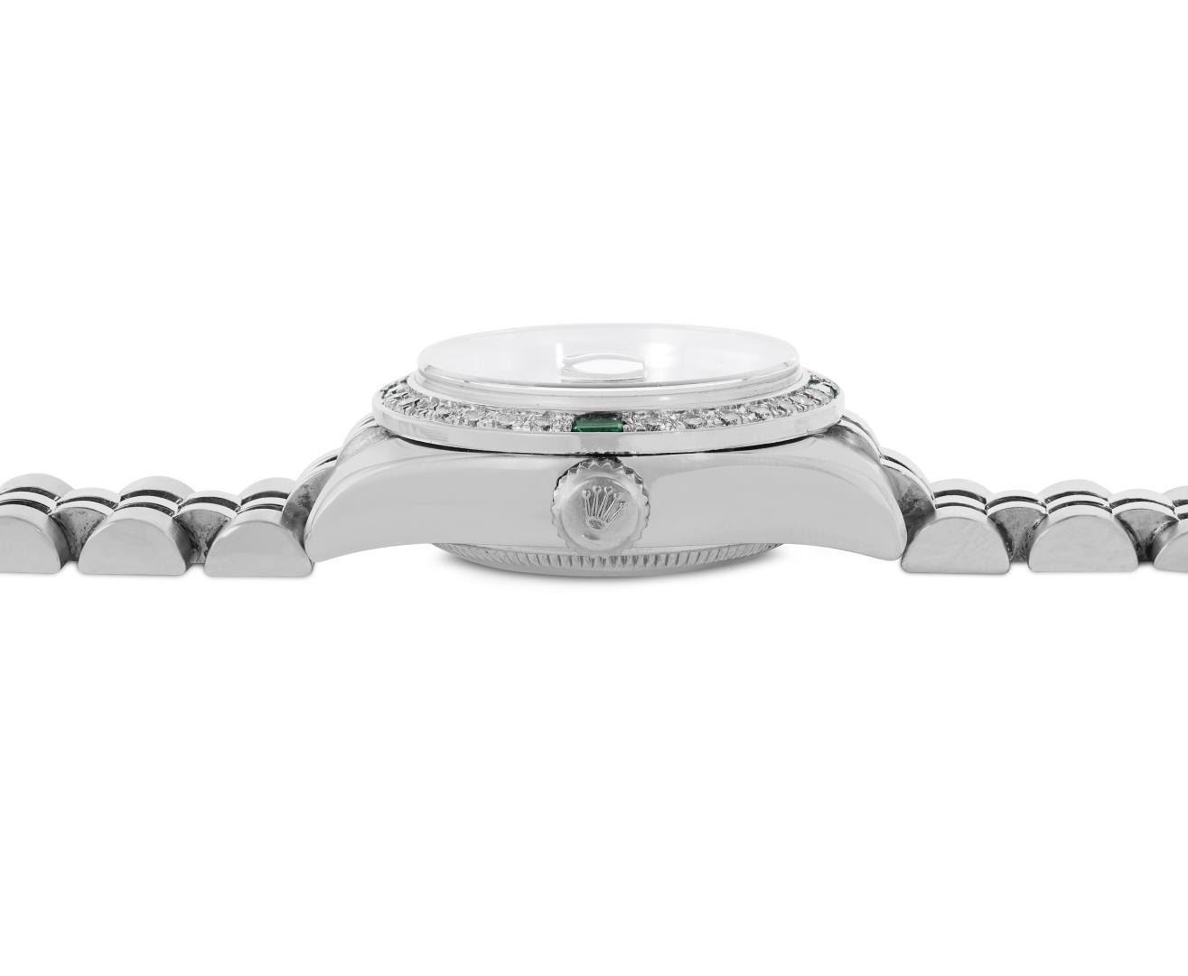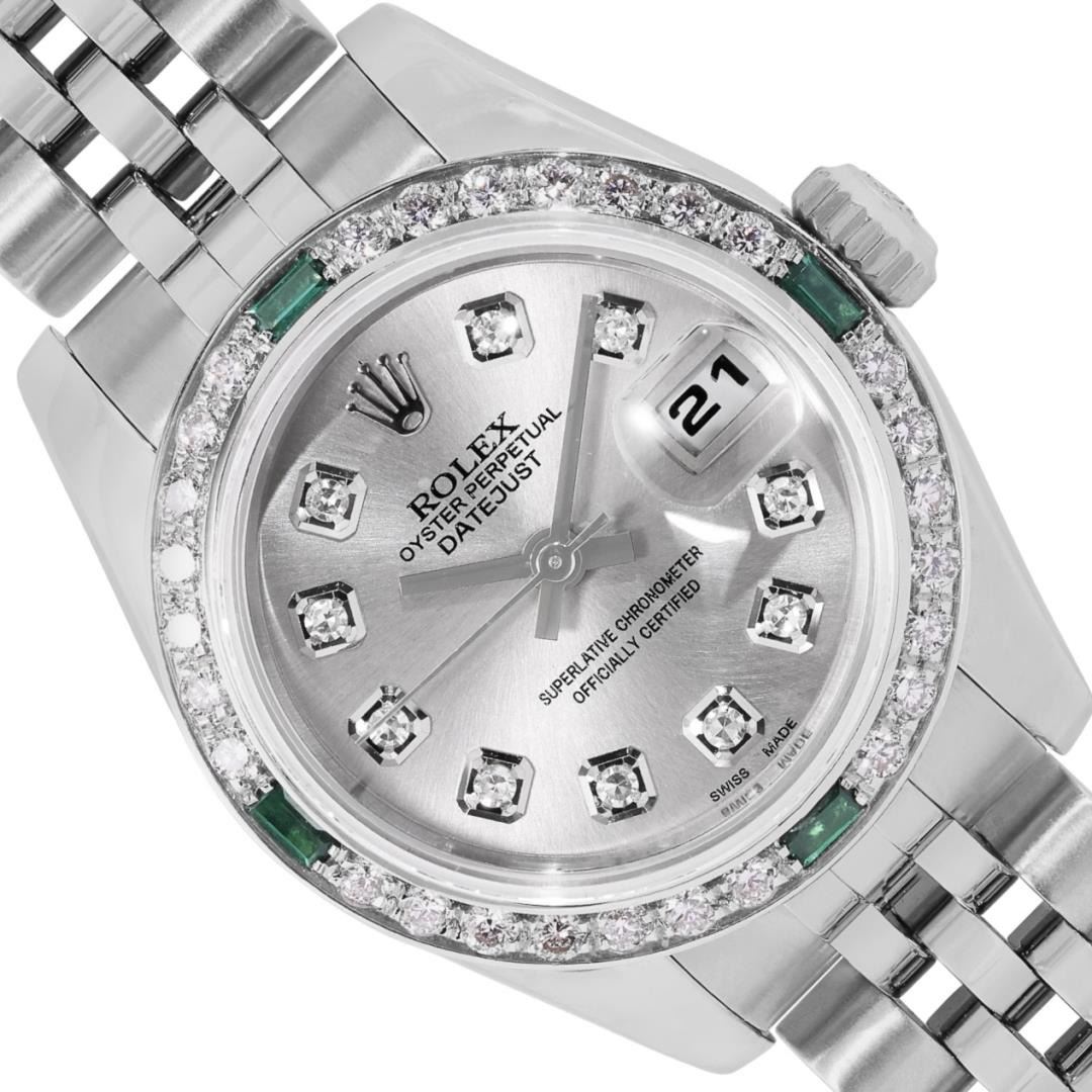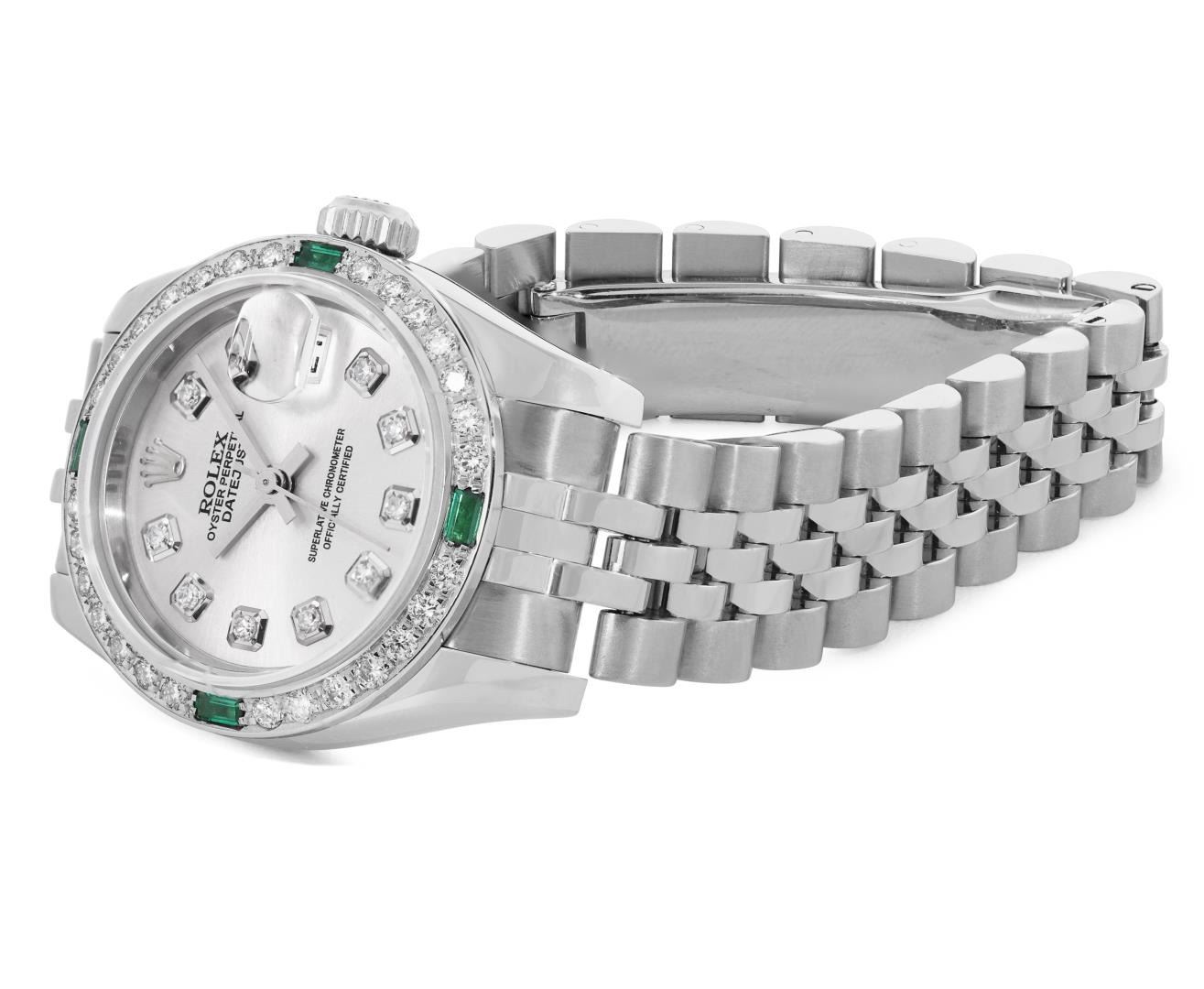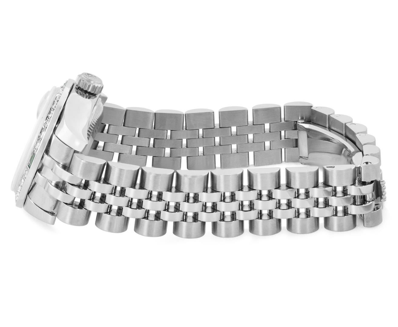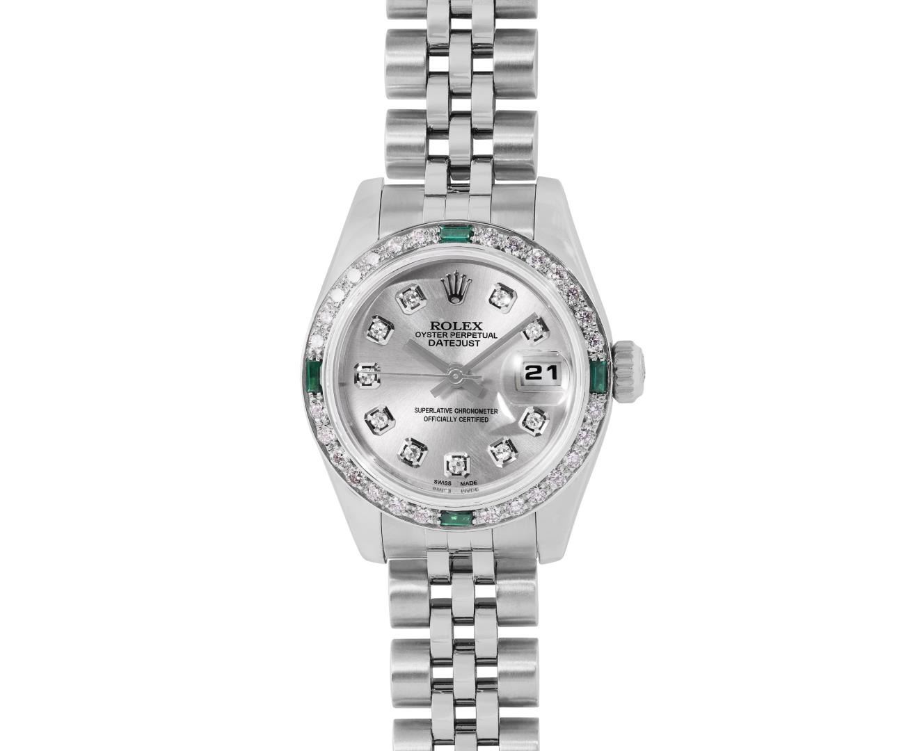 One Rolex Ladies Rolex Quickset Pre Owned Stainless Steel Datejust Wristwatch Polished Bright with Satin Finish, Serviced And Electronically Tested, Stainless Steel Case: 26mm, Stainless Steel Crown, Custom Bezel: New 18K White Gold Beadset Diamond And Emerald Bezel, Diamond + Stone Count: 28 Diamonds + 4 Emeralds. Crystal: Sapphire With Magnified Date Window. Hands: Non Luminescent Hands. Rolex Movement: 2235 Automatic Winding Movement 2235. Custom Dial: Custom Silver Dial With Added Diamond Hour Markers, Diamond Count: 10 Diamonds On Dial. Date Window: 3 O'Clock Position Date Display, Model: Quickset Datejust. Condition: G-6 Extra Fine. Rolex Bracelet: Stainless Steel Jubilee Band. Bright Polish And Satin Finish. 6.0 Inch Length, Adjustable. Hidden Clasp, With Rolex Logo. This Watch Has Been Serviced And Time Tested. It Is In Excellent Condition, Free Of All Scratches And Dents. This Watch Comes With A Rolex Box.