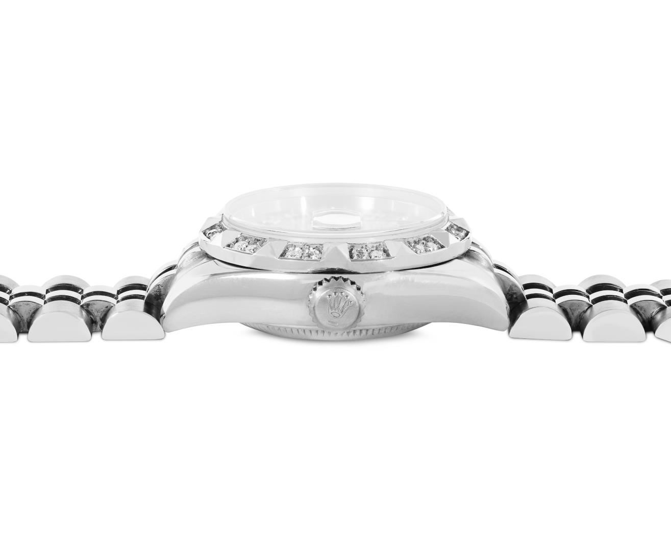One Rolex Ladies Rolex Quickset Pre Owned Stainless Steel Date Wristwatch Polished Bright with Satin Finish, Serviced And Electronically Tested, Stainless Steel Case: 26mm, Stainless Steel Crown, Custom Bezel: New 18K White Gold Pyramid Diamond Bezel, Diamond Count: 24 Diamonds. Crystal: Sapphire With Magnified Date Window. Hands: Non Luminescent Hands. Rolex Movement: 2235 Automatic Winding Movement 2235. Custom Dial: Custom Silver Dial With Added Diamond Hour Markers, Diamond Count: 10 Diamonds On Dial. Date Window: 3 O'Clock Position Date Display, Model: Quickset Datejust. Condition: G-6 Extra Fine. Rolex Bracelet: Stainless Steel Jubilee Band. Bright Polish And Satin Finish. 6.0 Inch Length, Adjustable. Hidden Clasp, With Rolex Logo. This Watch Has Been Serviced And Time Tested. It Is In Excellent Condition, Free Of All Scratches And Dents. This Watch Comes With A Rolex Box.