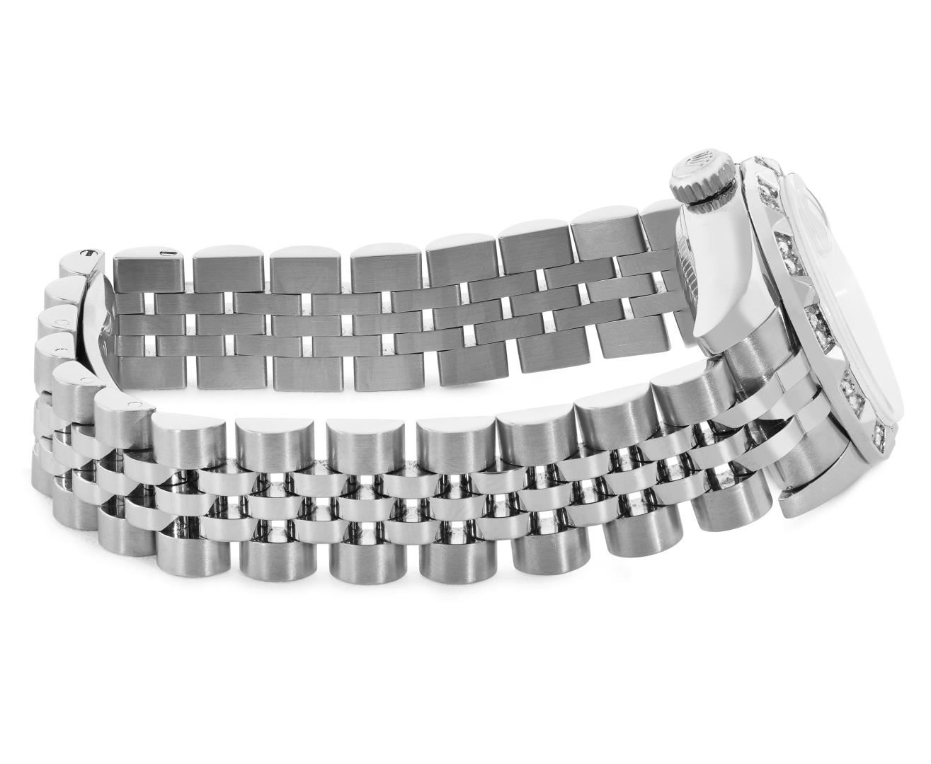 One Rolex Ladies Rolex Quickset Pre Owned Stainless Steel Date Wristwatch Polished Bright with Satin Finish, Serviced And Electronically Tested, Stainless Steel Case: 26mm, Stainless Steel Crown, Custom Bezel: New 18K White Gold Pyramid Diamond Bezel, Diamond Count: 24 Diamonds. Crystal: Sapphire With Magnified Date Window. Hands: Non Luminescent Hands. Rolex Movement: 2235 Automatic Winding Movement 2235. Custom Dial: Custom Silver Dial With Added Diamond Hour Markers, Diamond Count: 10 Diamonds On Dial. Date Window: 3 O'Clock Position Date Display, Model: Quickset Datejust. Condition: G-6 Extra Fine. Rolex Bracelet: Stainless Steel Jubilee Band. Bright Polish And Satin Finish. 6.0 Inch Length, Adjustable. Hidden Clasp, With Rolex Logo. This Watch Has Been Serviced And Time Tested. It Is In Excellent Condition, Free Of All Scratches And Dents. This Watch Comes With A Rolex Box.