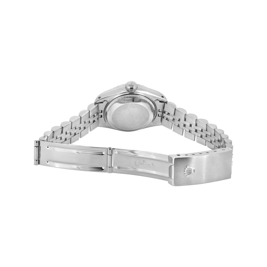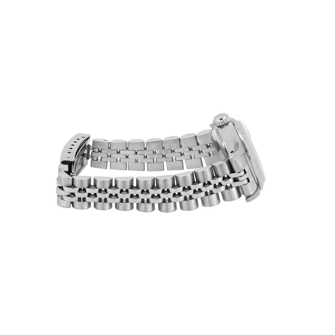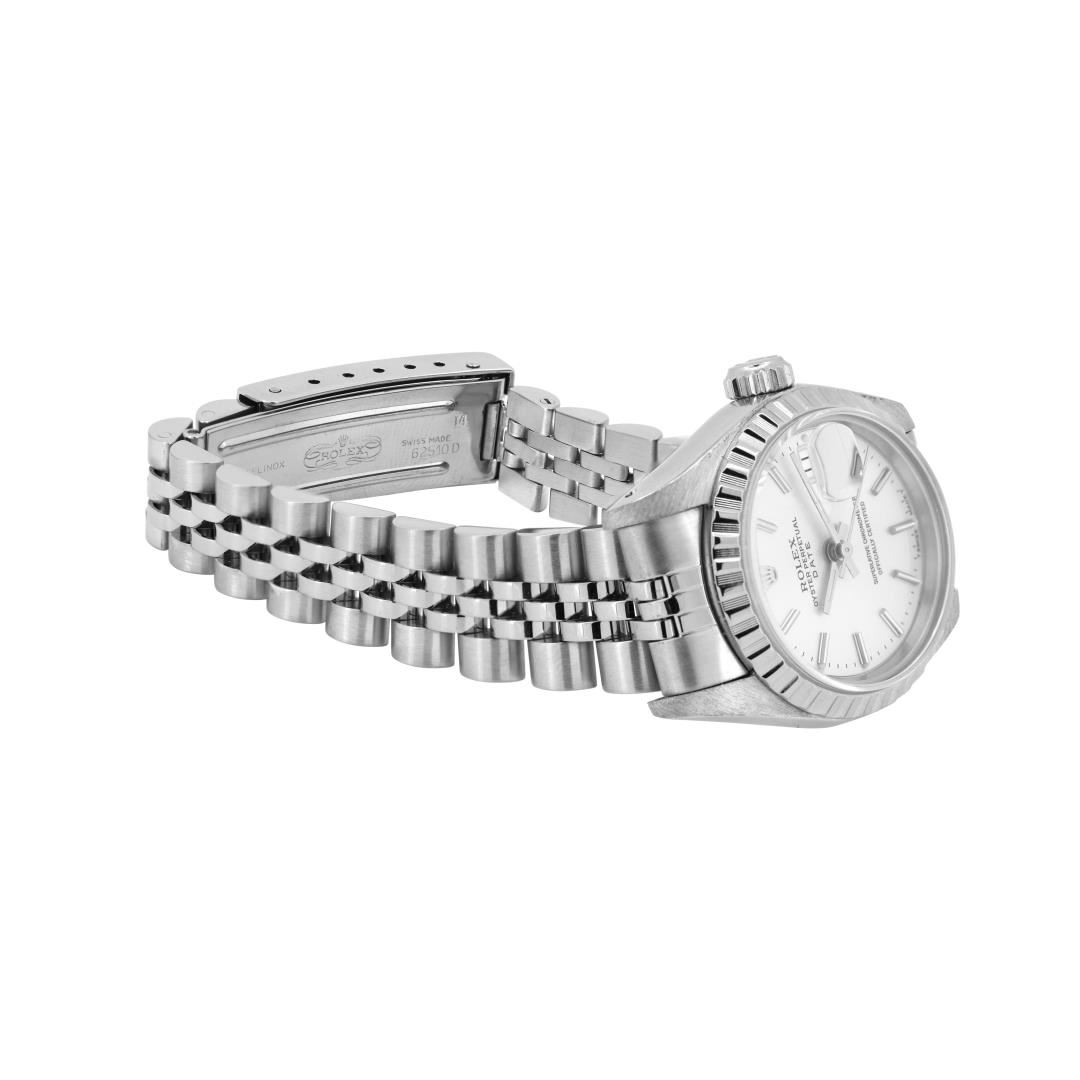 One Rolex Ladies Pre Owned Stainless Steel Date Wristwatch Polished Bright with Satin Finish, Serviced & Electronically Tested, Stainless Steel Case: 26mm, Stainless Steel Crown, Rolex Stainless Steel Engine Turn bezel. Custom Crystal: New Sapphire With Magnified Date Window. Custom Hands: New Luminescent Hands. Rolex Movement: 2135 Automatic Winding Movement. Rolex Dial: Factory Silver With Index Hour Markers And Lumi Dots. Date Window: 3 O'Clock Position Date Display, Model: Quickset Date. Condition: G-6 Extra Fine. Rolex Bracelet: Stainless Steel Jubilee Band. Bright Polish & Satin Finish. 6.0 Inch Length, Adjustable. Standard Clasp, With Rolex Logo. This Watch Has Been Serviced And Time Tested. It Is In Excellent Condition, Free Of All Scratches And Dents. This Watch Comes With A Rolex Box.
