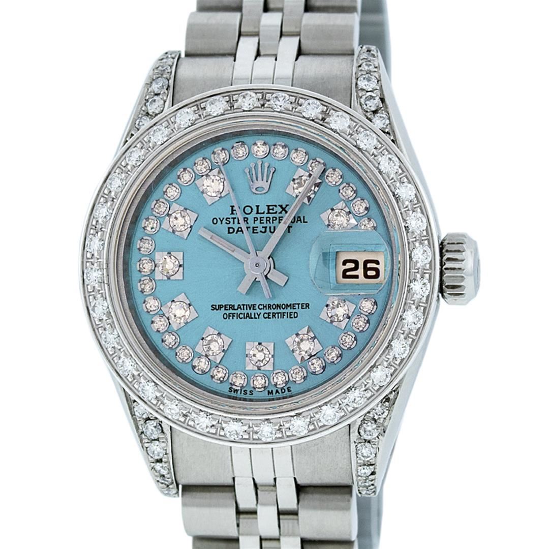 One Quickset Ladies Stainless Steel Rolex Datejust Polished Bright with Satin Finish, Serviced & Electronically Tested, Stainless Steel Case: 26mm, Stainless Steel Crown, Custom Diamond Lugs: 24 Diamonds On Lugs, Clarity: SI-VS, Color: G to H. Custom Bezel: New 18K White Gold Beadset Diamond Bezel, Stone Count: 32 Diamonds On Bezel, Total Weight .70 Carat, Clarity: SI-VS, Color: G to H. Custom Crystal: New Scratch Resistant Synthetic Sapphire Cyclops Lens. Custom Hands: New Luminescent Hands. Movement: Automatic Winding Movement Caliber 2235. Custom Dial: Refinished Single Cut Sky Blue String Diamond Dial, 43 Diamonds in Dial G To H In Color, Clarity: VS. Date Window: 3 O'Clock Position Date Display, Model: 79160 Quickset Datejust. Condition: G-6 Extra Fine. Bracelet: Stainless Steel Jubilee Band. Bright Polish & Satin Finish. 6.0 Inch Length, Adjustable. Standard Clasp, With Rolex Logo. This Watch Has Been Serviced Time Tested And Is In Excellent Condition It Is Free Of All Scratches And Dents. This Watch Comes With A Rolex Box.
