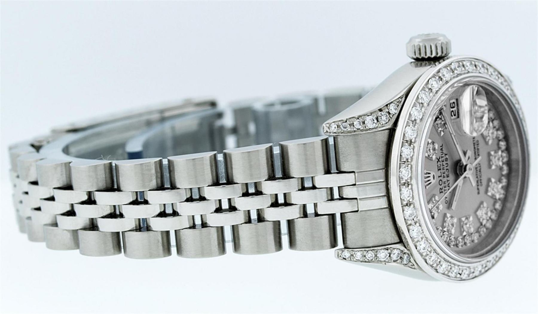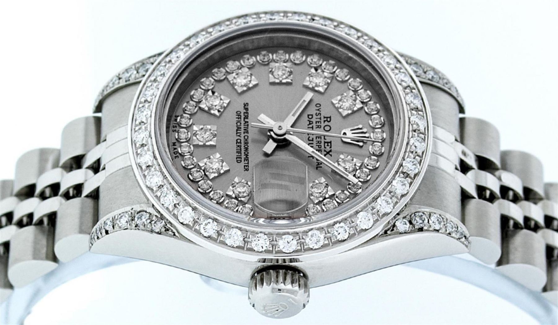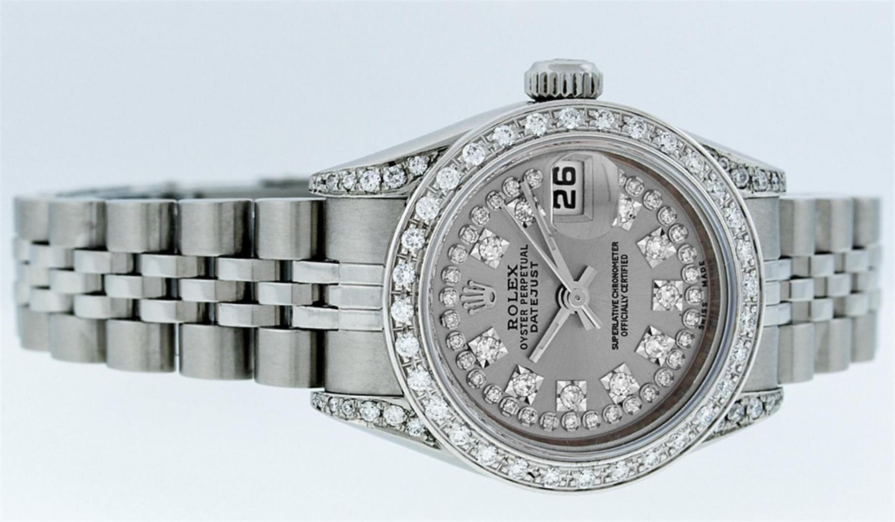 One Quickset Ladies Stainless Steel Rolex Datejust Polished Bright with Satin Finish, Serviced & Electronically Tested, Stainless Steel Case: 26mm, Stainless Steel Crown, Custom Diamond Lugs: 24 Diamonds On Lugs, Clarity: SI-VS, Color: G to H. Custom Bezel: New 18K White Gold Beadset Diamond Bezel, Stone Count: 32 Diamonds On Bezel, Total Weight .70 Carat, Clarity: SI-VS, Color: G to H. Custom Crystal: New Scratch Resistant Synthetic Sapphire Cyclops Lens. Custom Hands: New Luminescent Hands. Movement: Automatic Winding Movement Caliber 2235. Custom Dial: Refinished Single Cut Slate Grey String Diamond Dial, 43 Diamonds in Dial, G To H In Color, Clarity: VS. Date Window: 3 O'Clock Position Date Display, Model: 79174 Quickjset Datejust. Condition: G-6 Extra Fine. Bracelet: Stainless Steel Jubilee Band. Bright Polish & Satin Finish. 6.0 Inch Length, Adjustable. Standard Clasp, With Rolex Logo. This Watch Has Been Serviced Time Tested And Is In Excellent Condition It Is Free Of All Scratches And Dents.