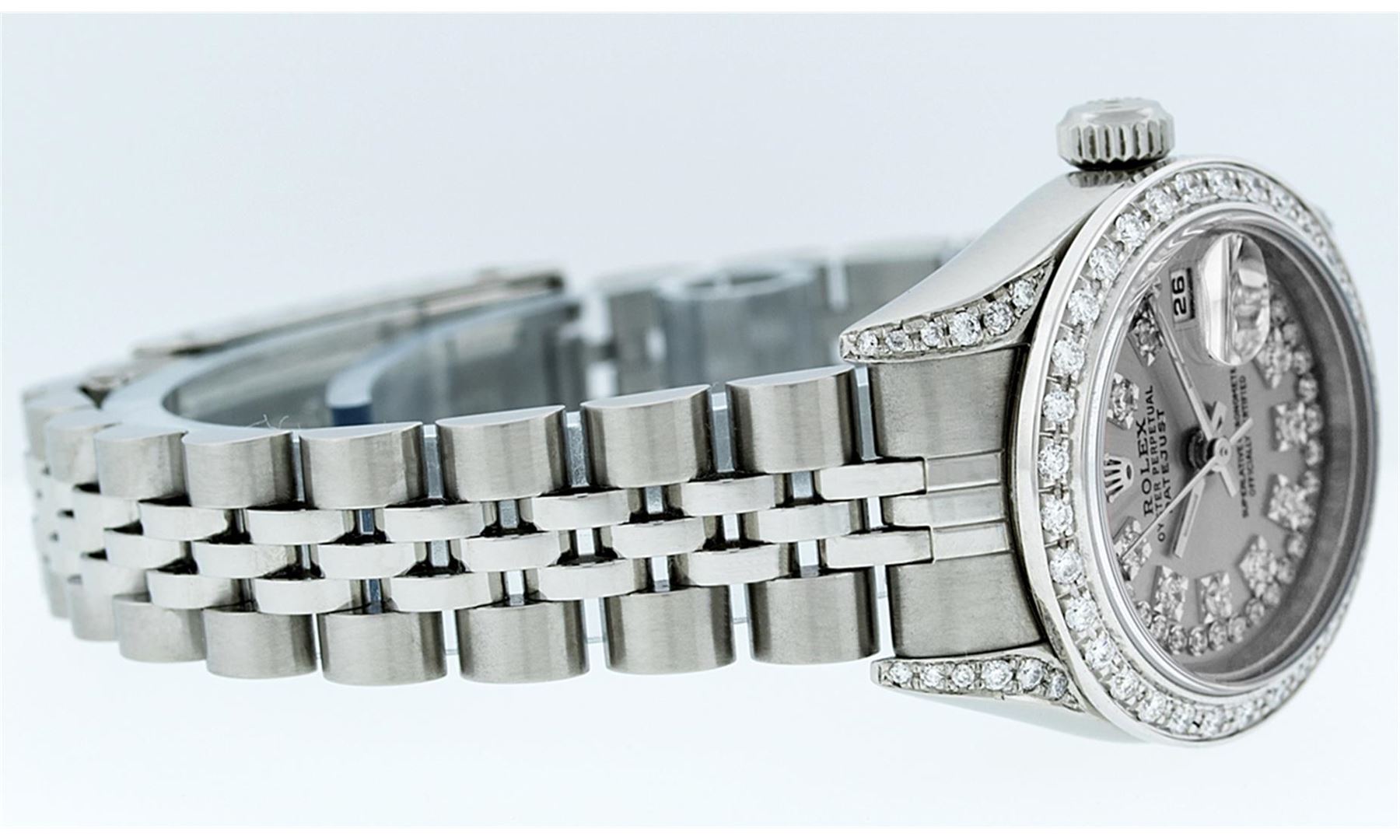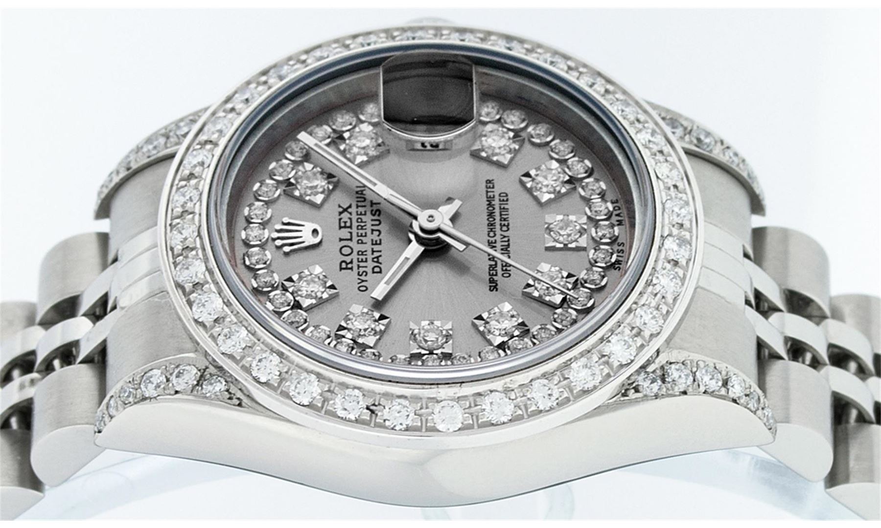One Quickset Ladies Stainless Steel Rolex Datejust Polished Bright with Satin Finish, Serviced & Electronically Tested, Stainless Steel Case: 26mm, Stainless Steel Crown, Custom Diamond Lugs: 24 Diamonds On Lugs, Clarity: SI-VS, Color: G to H. Custom Bezel: New 18K White Gold Beadset Diamond Bezel, Stone Count: 32 Diamonds On Bezel, Total Weight .70 Carat, Clarity: SI-VS, Color: G to H. Custom Crystal: New Scratch Resistant Synthetic Sapphire Cyclops Lens. Custom Hands: New Luminescent Hands. Movement: Automatic Winding Movement Caliber 2235. Custom Dial: Refinished Single Cut Slate Grey String Diamond Dial, 43 Diamonds in Dial, G To H In Color, Clarity: VS. Date Window: 3 O'Clock Position Date Display, Model: 79174 Quickjset Datejust. Condition: G-6 Extra Fine. Bracelet: Stainless Steel Jubilee Band. Bright Polish & Satin Finish. 6.0 Inch Length, Adjustable. Standard Clasp, With Rolex Logo. This Watch Has Been Serviced Time Tested And Is In Excellent Condition It Is Free Of All Scratches And Dents.