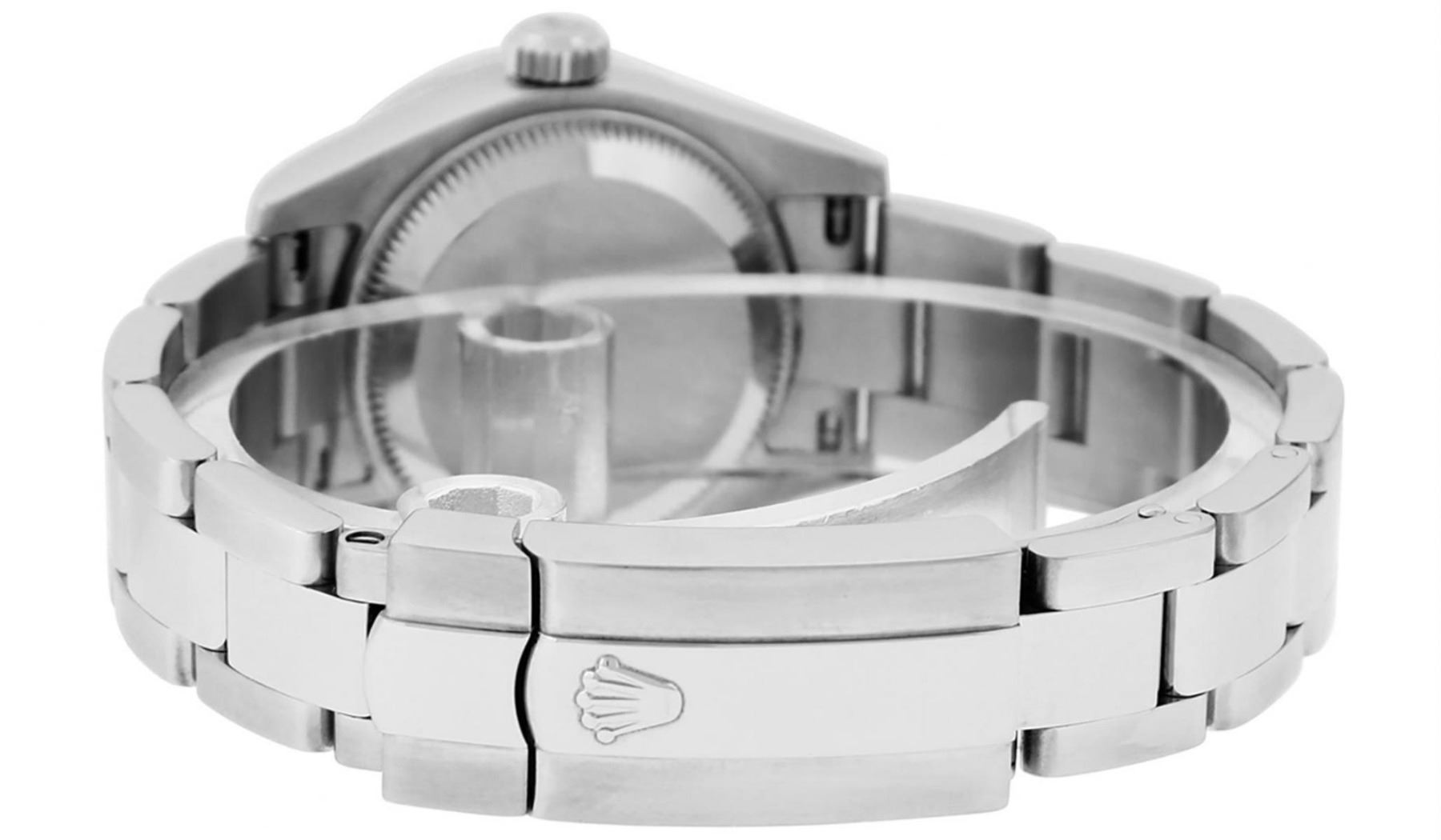 One Quickset Ladies Stainless Steel Rolex Datejust Polished Bright with Satin Finish, Serviced & Electronically Tested, Stainless Steel Case: 26mm, Stainless Steel Crown, Custom Bezel: New 18K White Gold Pyramid Diamond Bezel, Stone Count: 24 Diamonds On Bezel, Total Weight .50 Carat, Clarity: SI-VS, Color: G to H. Custom Crystal: New Scratch Resistant Synthetic Sapphire Cyclops Lens. Custom Hands: New Luminescent Hands. Movement: Automatic Winding Movement Caliber 2235. Custom Dial: Refinished Single Cut Slate Grey String String Diamond Dial, 43 Diamonds in Dial, G To H In Color, Clarity: VS. Date Window: 3 O'Clock Position Date Display, Model: 179160 Quickjset Datejust. Condition: G-6 Extra Fine. Bracelet: Stainless Steel Oyster Band. Bright Polish & Satin Finish. 6.0 Inch Length, Adjustable. Standard Clasp, With Rolex Logo. This Watch Has Been Serviced Time Tested And Is In Excellent Condition It Is Free Of All Scratches And Dents.