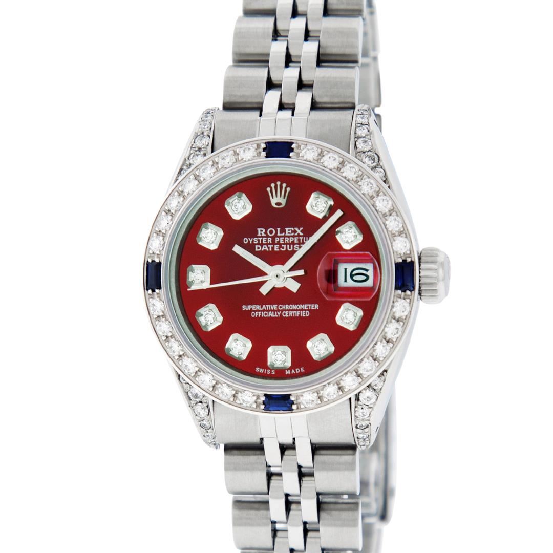 One Ladies Stainless Steel Rolex Datejust Polished Bright with Satin Finish, Serviced & Electronically Tested, Stainless Steel Case: 26mm, Stainless Steel Crown, Diamond Lugs: 24 Diamonds On Lugs, Clarity: SI-VS, Color: G to H. Custom Bezel: New 18K White Gold Diamond & Sapphire Beadset Bezel, Diamond Count: 28 Diamonds + 4 Sapphires, Total Weight .70 Carat, Clarity: SI-VS, Color: G to H. Custom Crystal: New Synthetic Sapphire Cyclops Lens. Custom Hands: New Luminescent Hands. Movement: Automatic Winding Movement . Custom Dial: Refinished Red Diamond Dial, 10 Diamonds in Dial, G To H In Color, Clarity: SI-VS. Date Window: 3 O'Clock Position Date Display, Model: Datejust Condition: G-6 Extra Fine. Bracelet: Stainless Steel Jubilee. Bright Polish & Satin Finish. 6.0 Inch Length, Adjustable. Standard Clasp, With Rolex Logo. This Watch Has Been Serviced Time Tested And Is In Excellent Condition It Is Free Of All Scratches And Dents.