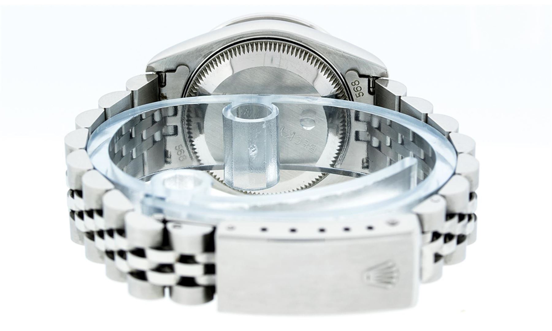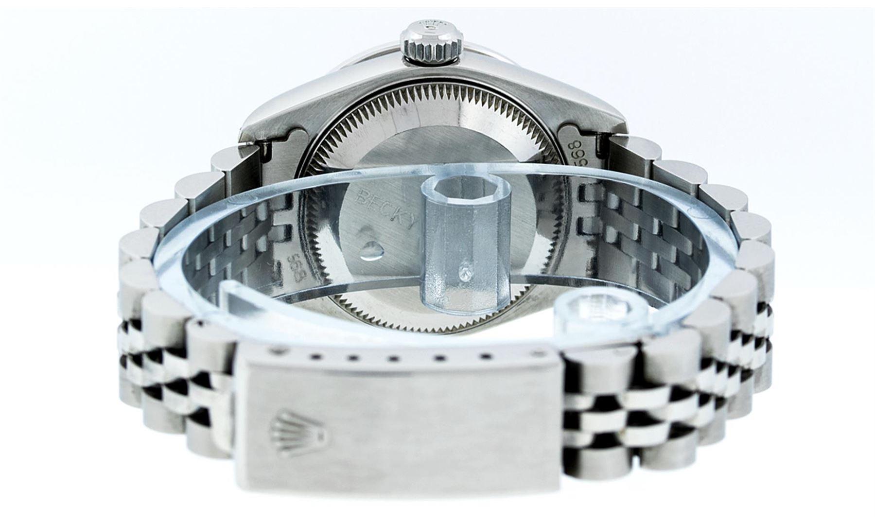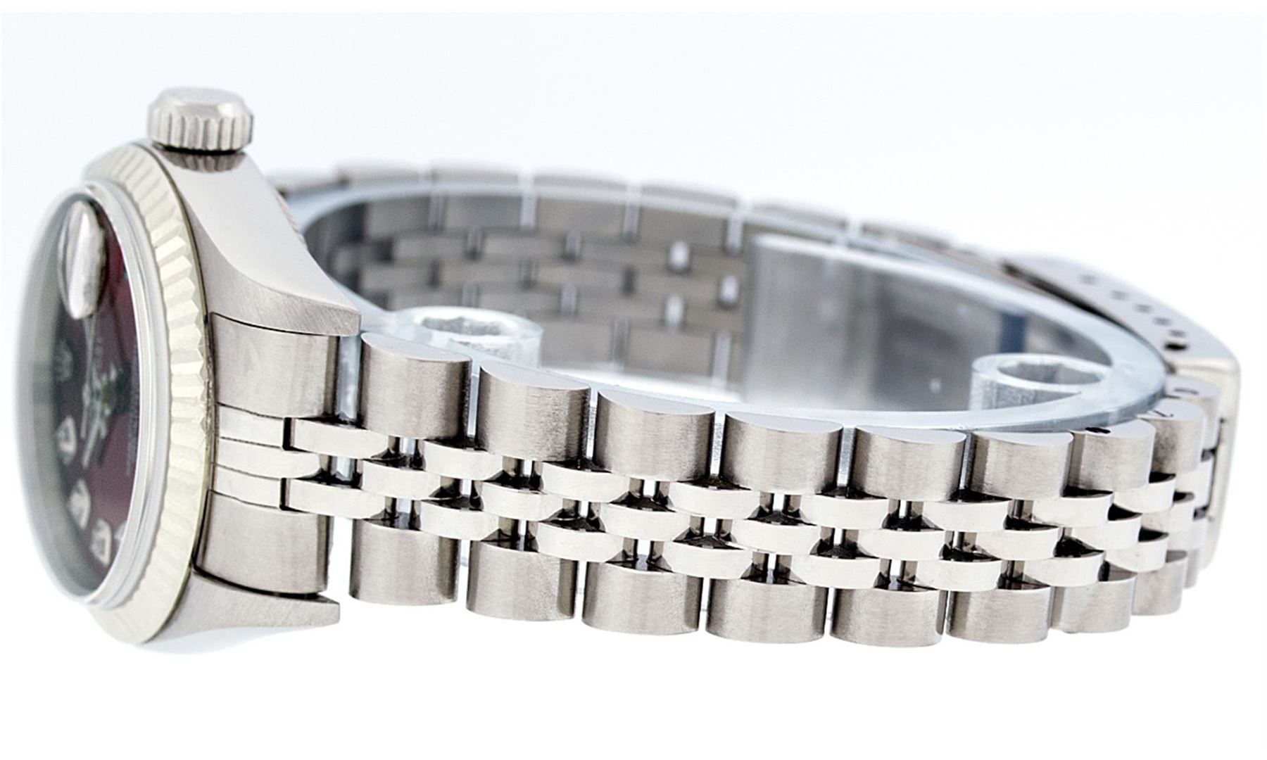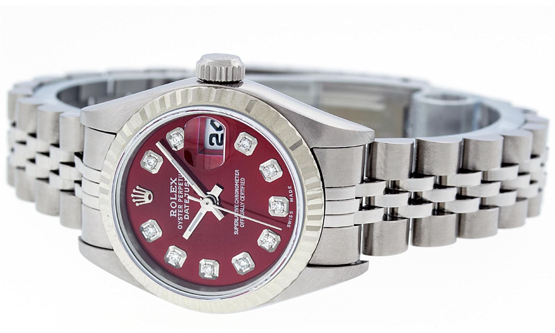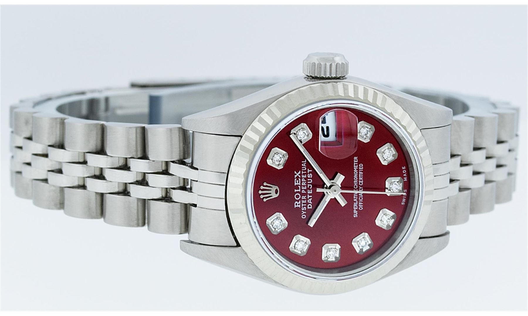 One Ladies Quickset Stainless Steel Rolex Datejust Polished Bright with Satin Finish, Serviced & Electronically Tested, Stainless Steel Case: 26mm, Stainless Steel Crown, Bezel: 18K White Gold Fluted Bezel. Custom Crystal: New Scratch Resistant Sapphire Cyclops Lens. Custom Hands: New Luminescent Hands. Movement: Automatic Winding Movement. Custom Dial: Red Diamond Dial, Diamond Count: 10 Diamonds In Dial, Color: G to H, Clarity: SI1 Date Window: 3 O'Clock Position Date Display, Model: 79174 Quickset Datejust. Condition: G-6 Extra Fine. Bracelet: Stainless Steel Jubilee Band. Bright Polish & Satin Finish. 6.0 Inch Length, Adjustable. Standard Clasp, With Rolex Logo. This Watch Has Been Serviced Time Tested And Is In Excellent Condition It Is Free Of All Scratches And Dents.