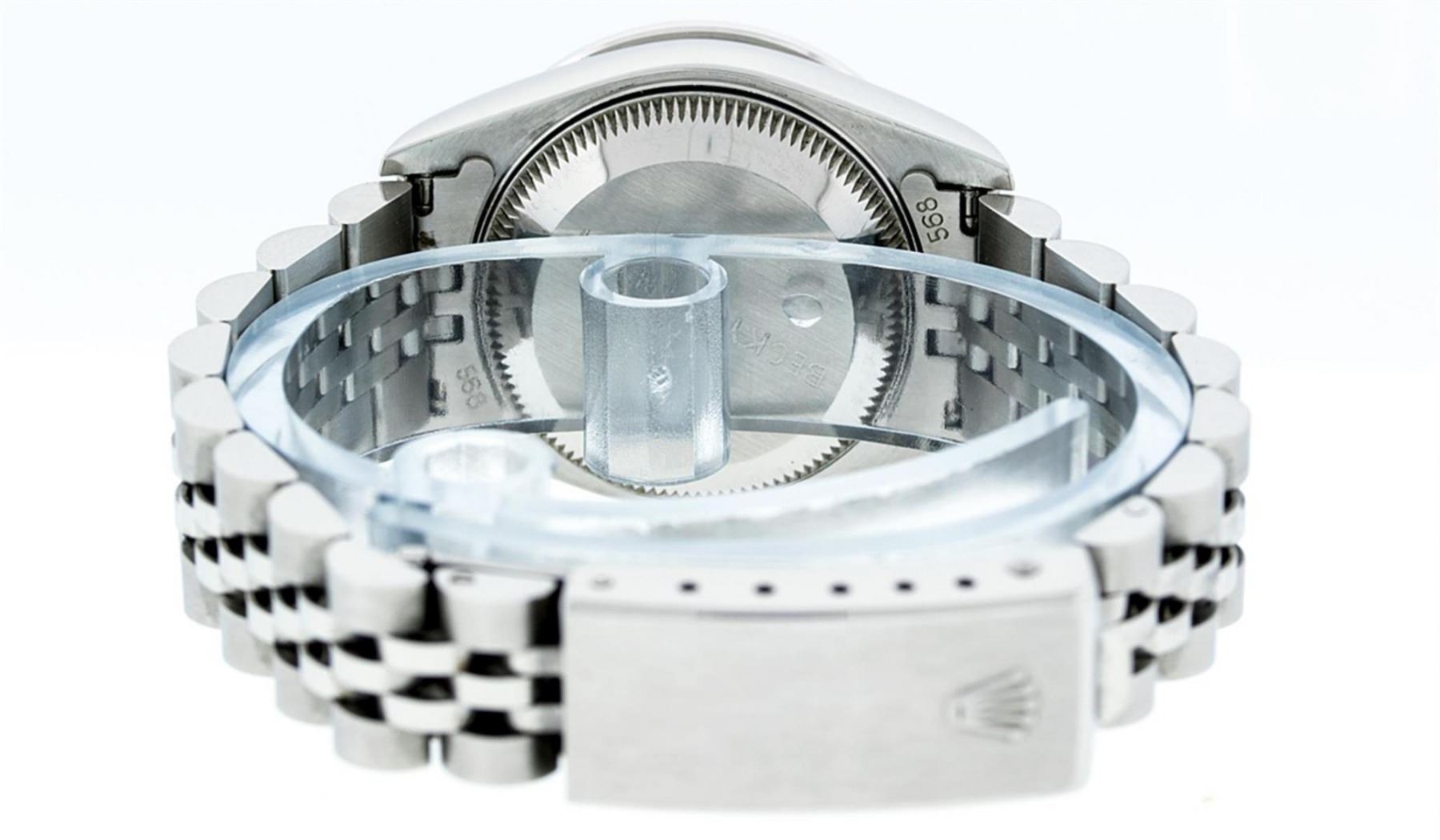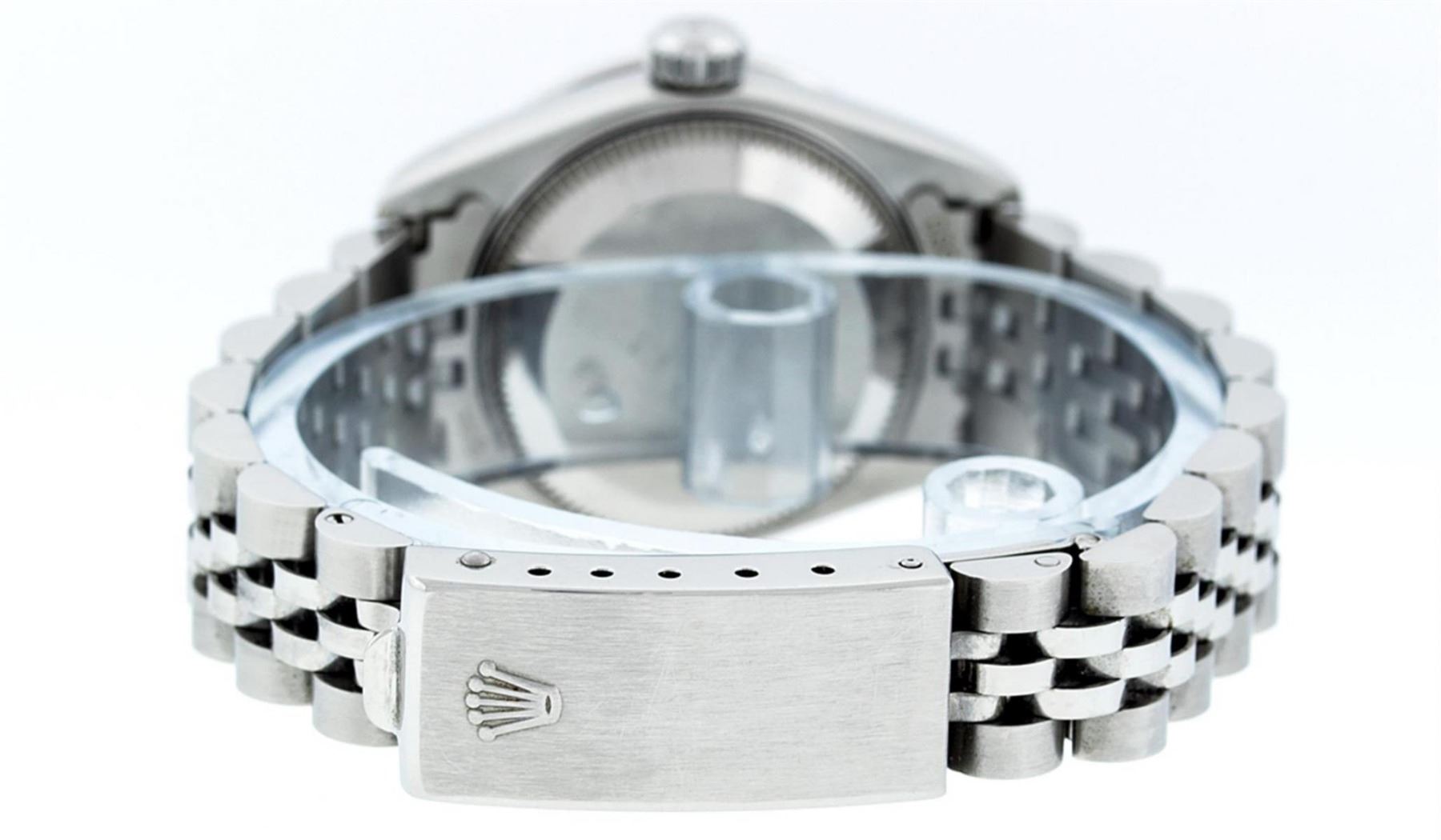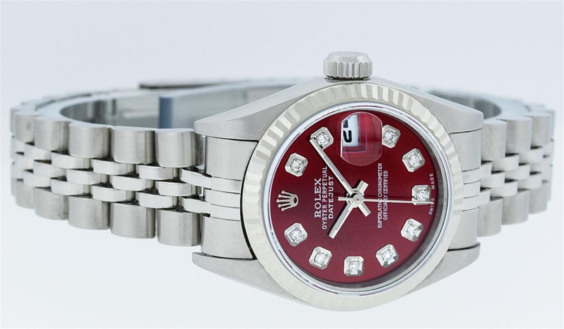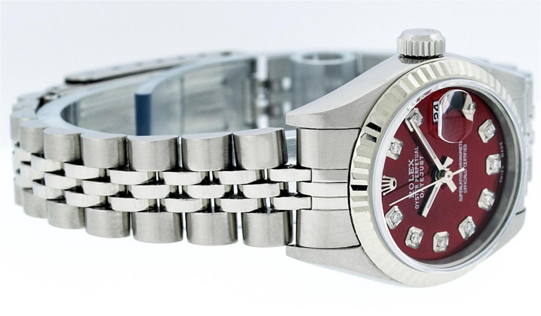 One Ladies Quickset Stainless Steel Rolex Datejust Polished Bright with Satin Finish, Serviced & Electronically Tested, Stainless Steel Case: 26mm, Stainless Steel Crown, Bezel: 18K White Gold Fluted Bezel. Custom Crystal: New Scratch Resistant Sapphire Cyclops Lens. Custom Hands: New Luminescent Hands. Movement: Automatic Winding Movement Caliber 2235. Custom Dial: Red Diamond Dial, Diamond Count: 10 Diamonds In Dial, Color: G to H, Clarity: SI1 Date Window: 3 O'Clock Position Date Display, Model: 79174 Quickset Datejust. Condition: G-6 Extra Fine. Bracelet: Stainless Steel Jubilee Band. Bright Polish & Satin Finish. 6.0 Inch Length, Adjustable. Standard Clasp, With Rolex Logo. This Watch Has Been Serviced Time Tested And Is In Excellent Condition It Is Free Of All Scratches And Dents.
