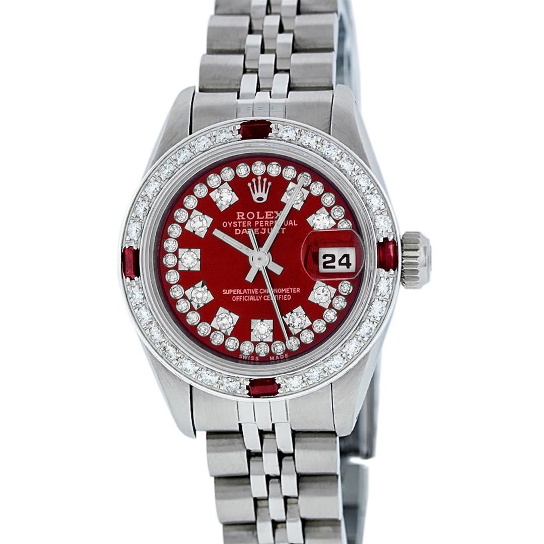 One Ladies Stainless Steel Rolex Datejust Polished Bright with Satin Finish, Serviced & Electronically Tested, Stainless Steel Case: 26mm, Stainless Steel Crown. Custom Bezel: New 18K White Gold Beadset & Ruby Diamond Bezel, Diamond Count: 28 Diamonds + 4 Rubies. Total Weight .70 Carat, Clarity: SI-VS, Color: G to H. Custom Crystal: New Scratch Resistant Synthetic Sapphire Cyclops Lens. Custom Hands: New Luminescent Hands. Movement: Automatic Winding Movement. Custom Dial: Refinished Red String Single Cut Diamond Dial, Stone Count: 43 Diamonds On Dial, G To H In Color, Clarity: SI-VS. Date Window: 3 O'Clock Position Date Display, Model: Datejust. Condition: G-6 Extra Fine. Bracelet: Stainless Steel Jubilee Band. Bright Polish & Satin Finish. 6.0 Inch Length, Adjustable. Standard Clasp, With Rolex Logo. This Watch Has Been Serviced Time Tested And Is In Excellent Condition It Is Free Of All Scratches And Dents.