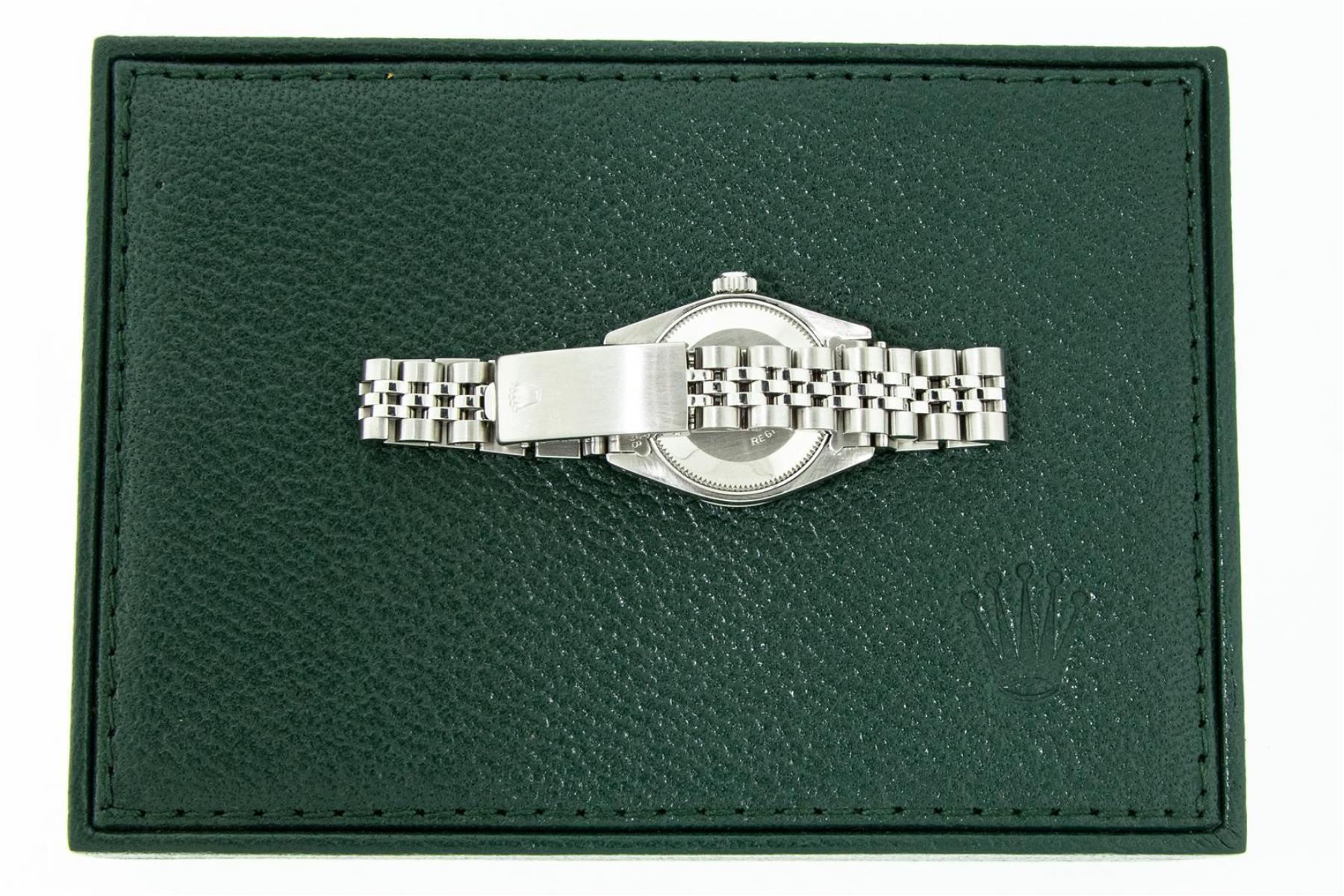 One Ladies Stainless Steel Rolex Datejust Polished Bright with Satin Finish, Serviced & Electronically Tested, Stainless Steel Case: 26mm, Stainless Steel Crown. Custom Bezel: New 18K White Gold Beadset & Ruby Diamond Bezel, Diamond Count: 28 Diamonds + 4 Rubies. Total Weight .70 Carat, Clarity: SI-VS, Color: G to H. Custom Crystal: New Scratch Resistant Synthetic Sapphire Cyclops Lens. Custom Hands: New Luminescent Hands. Movement: Automatic Winding Movement. Custom Dial: Refinished Red String Single Cut Diamond Dial, Stone Count: 43 Diamonds On Dial, G To H In Color, Clarity: SI-VS. Date Window: 3 O'Clock Position Date Display, Model: Datejust. Condition: G-6 Extra Fine. Bracelet: Stainless Steel Jubilee Band. Bright Polish & Satin Finish. 6.0 Inch Length, Adjustable. Standard Clasp, With Rolex Logo. This Watch Has Been Serviced Time Tested And Is In Excellent Condition It Is Free Of All Scratches And Dents. This Watch Comes With A Rolex Box.
